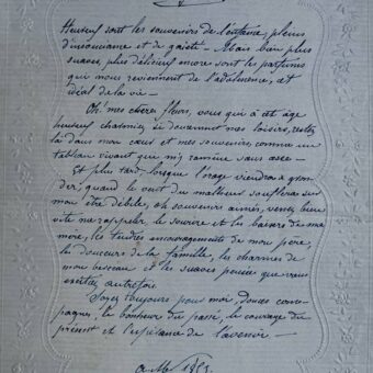 Charmant texte manuscrit « Mes fleurs », sur papier à lettre gaufré aux motifs floraux