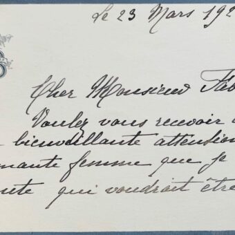 Emouvante carte de Sarah Bernhardt, d’une signature désarticulée, 3 jours avant son décès
