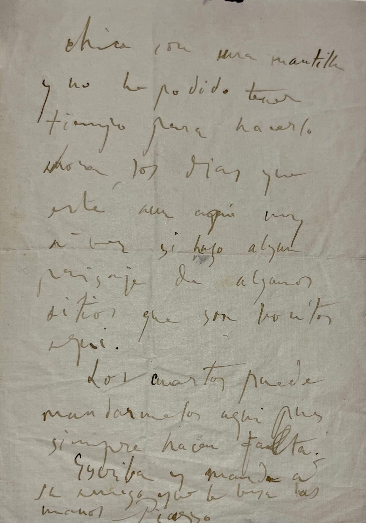 Transcription : "Querida Eugenia. He recibido su carta. Qué alegría de ver que mis amigos no me olvidan. Yo deseando volver y verla. Aquí, hasta ahora, poca cosa he hecho, pues empecé un retrato de una chica con una mantilla y no he podido tener tiempo para hacerlo. Ahora, los días que estaré aún aquí, voy a ver si hago algún paisaje de algunos sitios que son bonitos aquí. Los cuartos puede mandármelos, pues siempre hacen falta. Escriba y mande a su amigo que le besa las manos. Picasso".