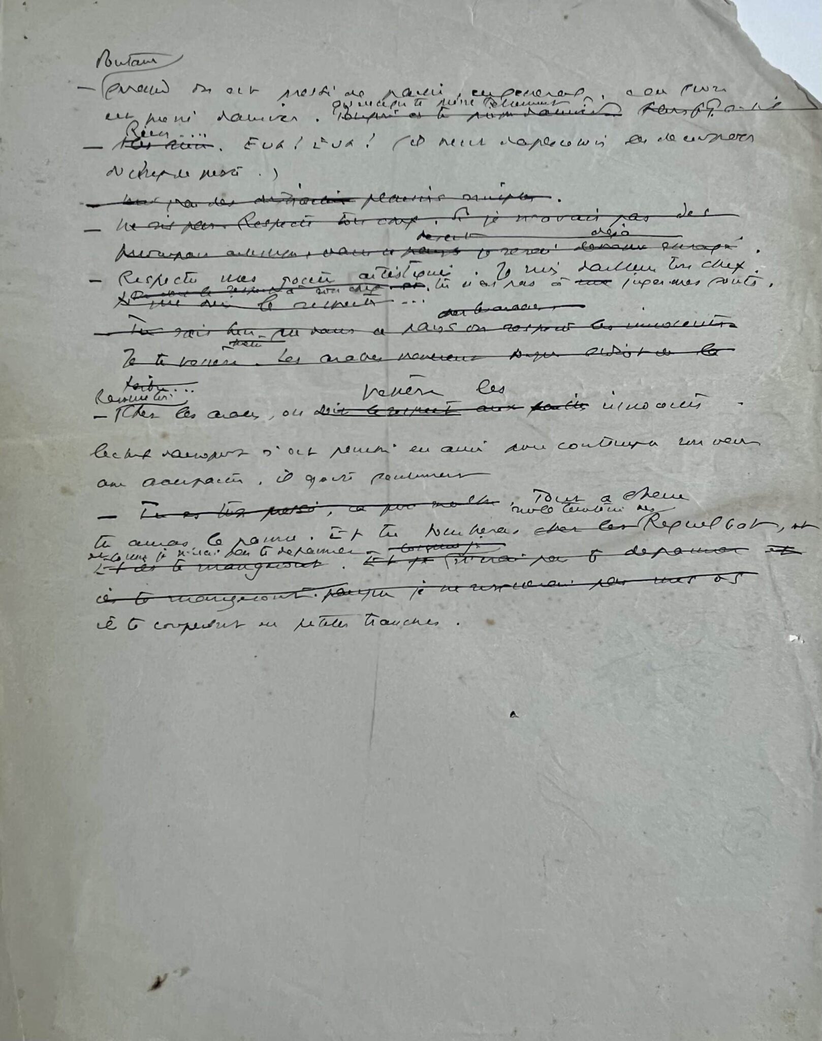 Le manuscrit, brouillon très raturé, est, comme toujours chez Saint-Exupéry, difficile à lire : il se présente sous forme de dialogue (peut-être pour Terre des Hommes) :