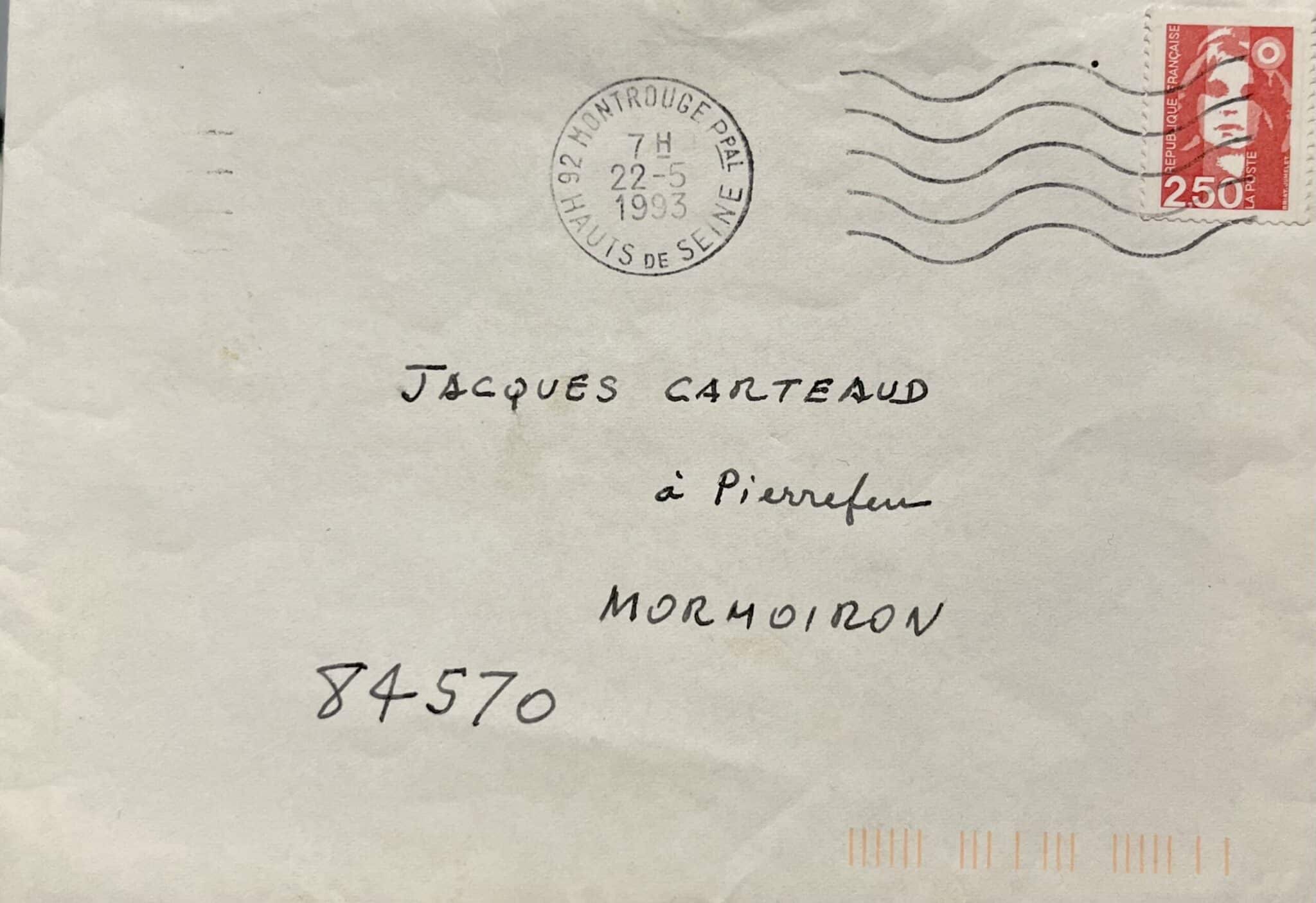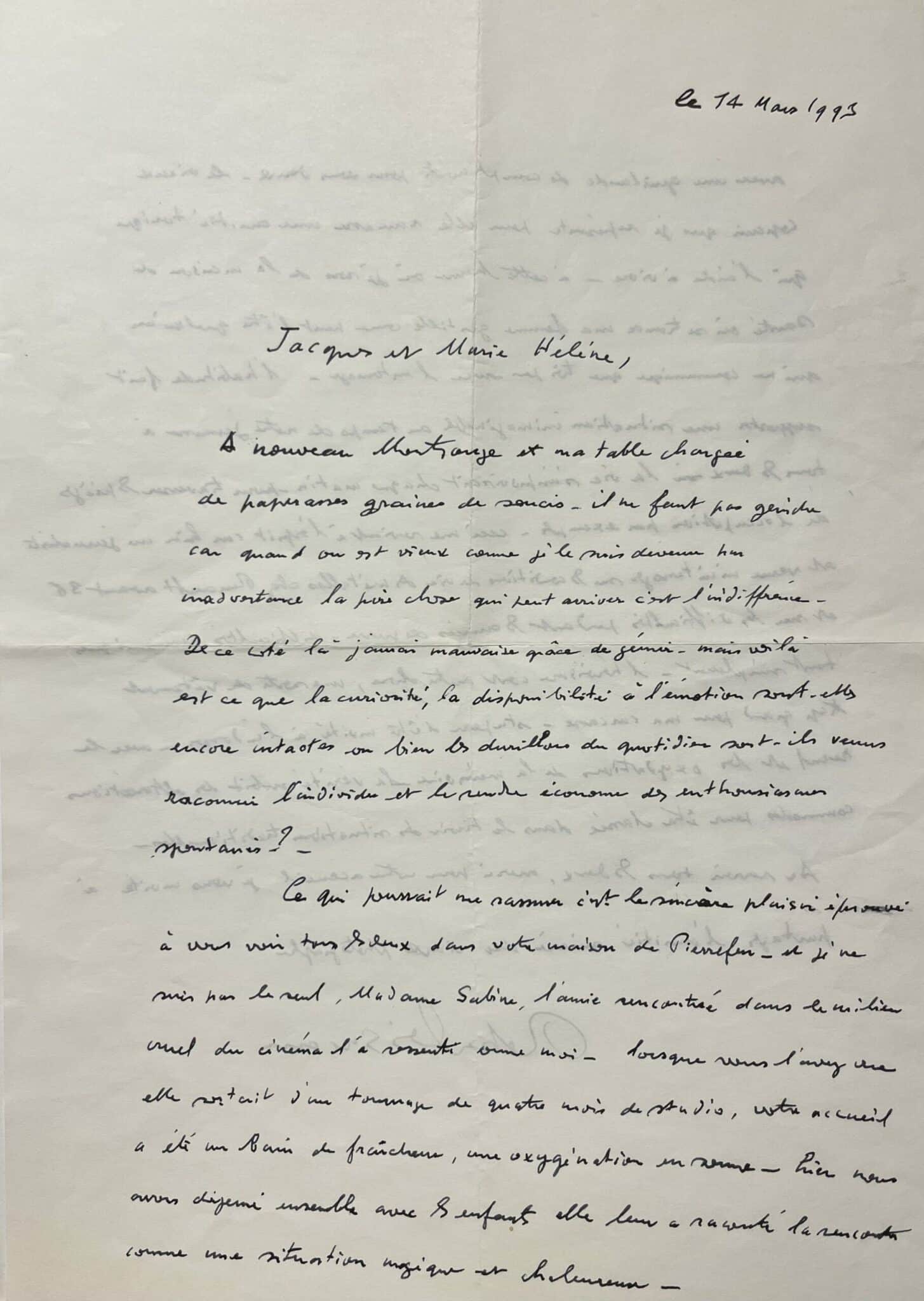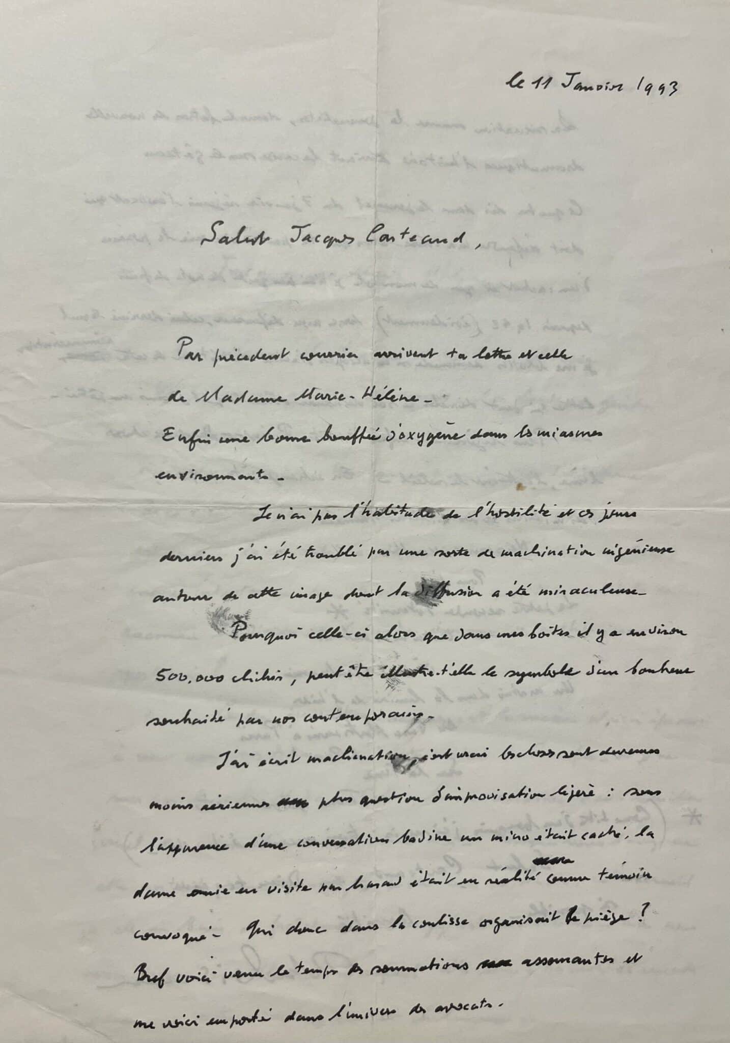 -11 janvier 1993 : « Par précédent courrier arrivent ta lettre et celle de Madame Marie-Hélène. Enfin une bonne bouffée d'oxygène dans les miasmes environnants. Je n'ai pas l'habitude de l'hostilité et ces jours derniers, j'ai été troublé par une sorte de machination ingénieuse autour de cette image dont la diffusion a été miraculeuse. Pourquoi celle-ci alors que dans mes boites il y a environ 500.000 clichés ; peut-être illustre-t-elle le symbole d'un bonheur souhaité par nos contemporains. J'ai écrit machination, c'est vrai, les choses sont devenues moins aériennes, plus question d'improvisation légère : sous l'apparence d'une conversation badine un micro était caché, la dame amie en visite par hasard était en réalité comme témoin convoqué. Qui donc dans la coulisse organisait le piège? Bref voici venu le temps des sommations assommantes et me voici emporté dans l'univers des avocats.