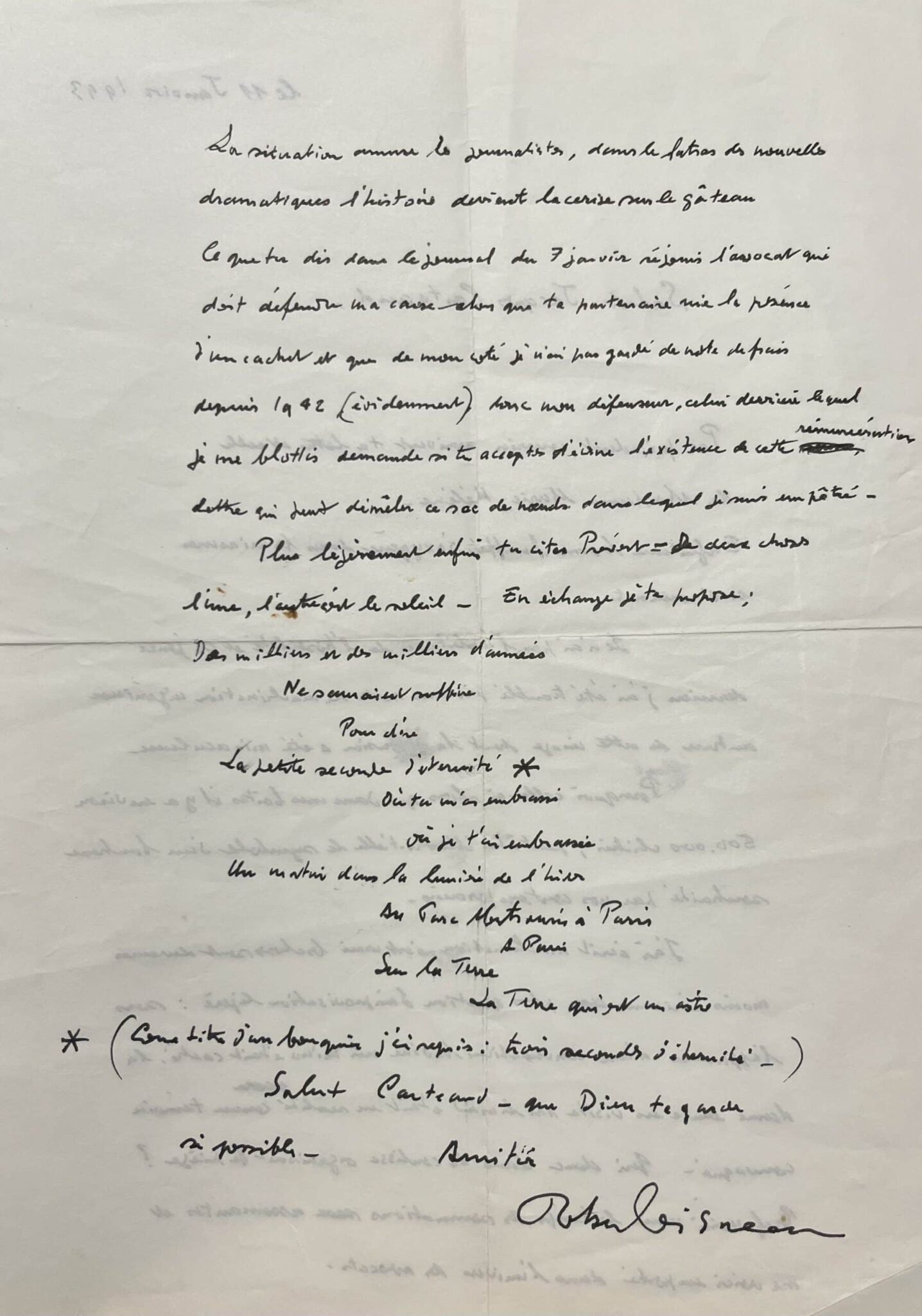 La situation amuse les journalistes, dans le fatras des nouvelles dramatiques, l'histoire devient la cerise sur le gâteau. Ce que tu dis dans le journal du 7 janvier réjouis l'avocat qui doit défendre ma cause alors que ta partenaire nie la présence d'un cachet et que de mon côté je n'ai pas gardé de note de frais depuis 1942 (évidemment), donc mon défenseur, celui derrière lequel je me blottis, demande si tu accepte d'écrire l'existence de cette rémunération, lettre qui peut démêler ce sac de noeuds dans lequel je suis empêtré.
