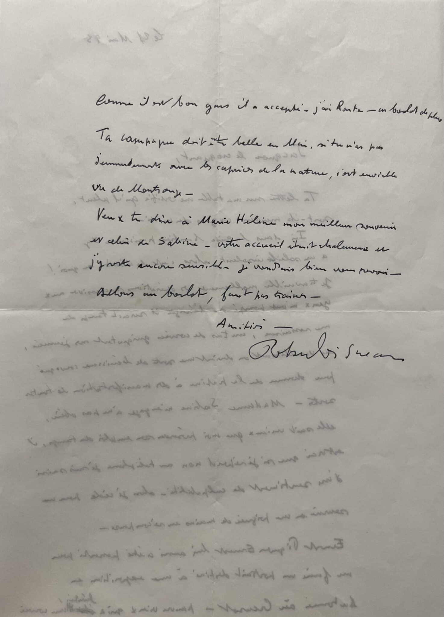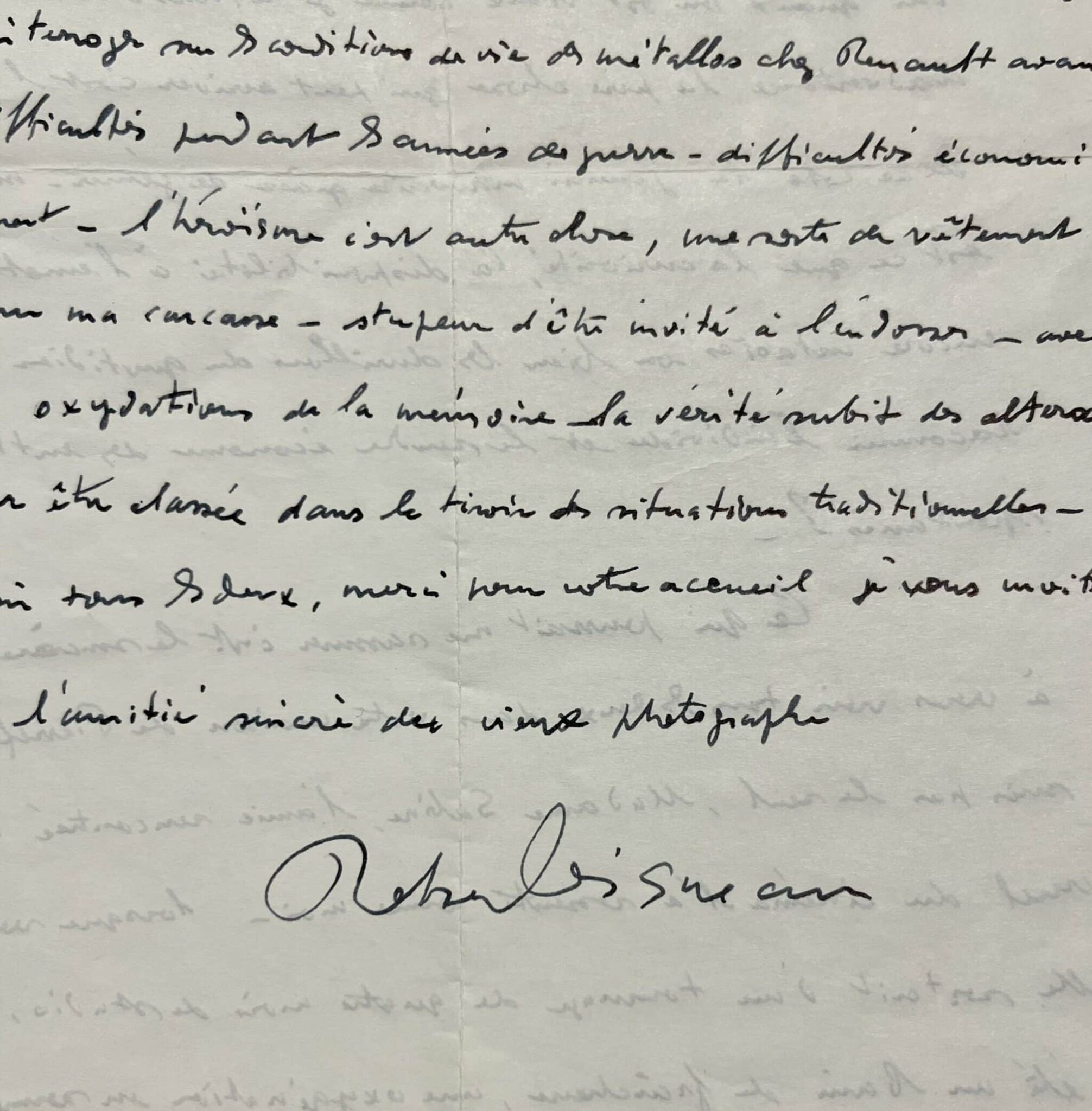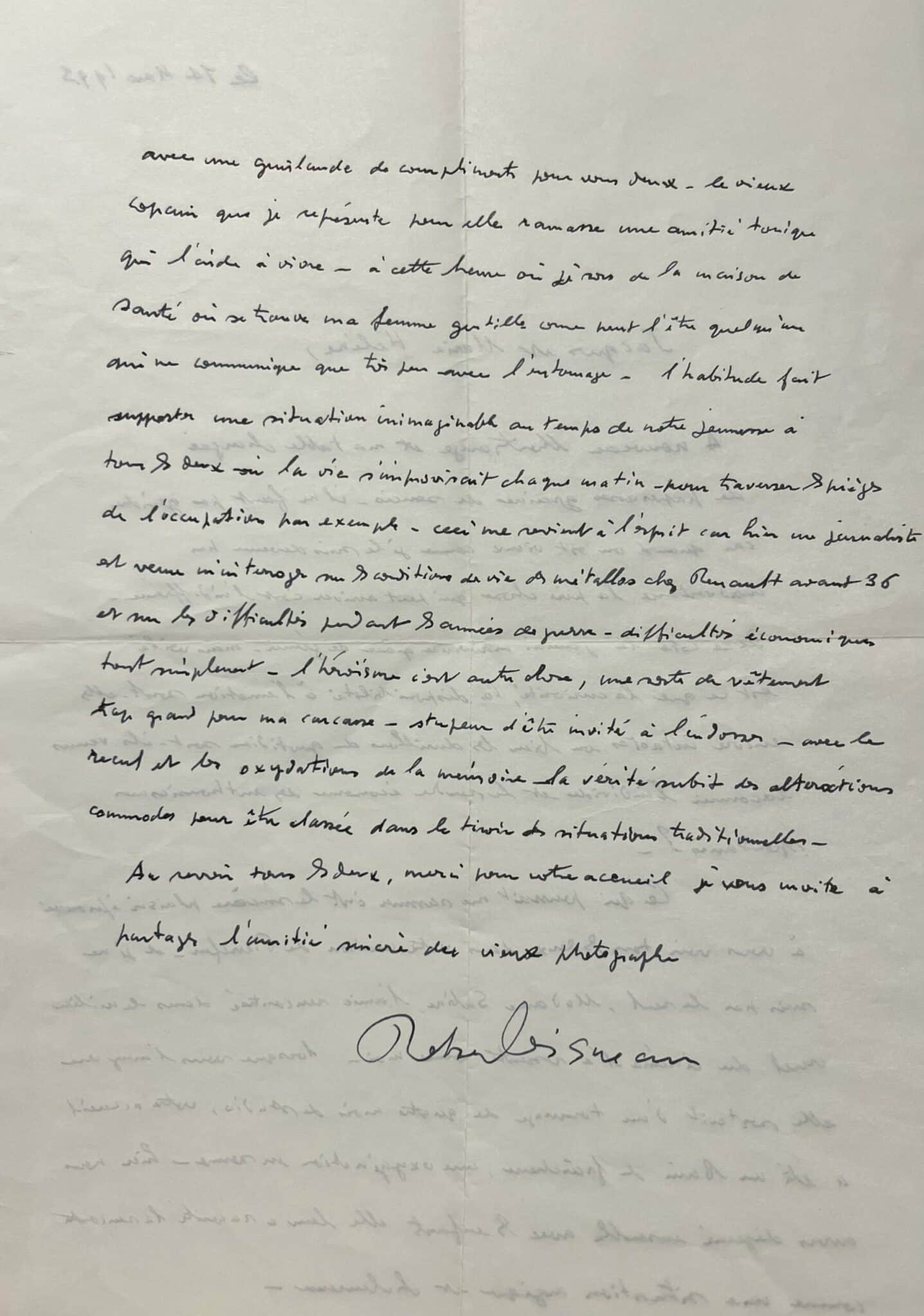 Ce qui pourrait me rassurer c'est le sincère plaisir éprouvé à vous voir tous les deux dans votre maison de Pierrefeu [...]. Le vieux copain que je représente pour elle ramasse une amitié tonique qui l'aide à vivre - à cette heure où je sors de la maison de santé où se trouve ma femme, gentille comme peut l'être quelqu'un qui ne communique que très peu avec l'entourage - l'habitude fait supporter une situation inimaginable au temps de notre jeunesse à tous les deux où la vie s'improvisait chaque matin pour traverser les pièges de l'occupation par exemple. Ceci me vient à l'esprit car hier un journaliste est venu m'interroger sur les conditions de vie des métallos chez Renault avant 36 et sur les difficultés pendant les années de guerre - difficultés économiques tout simplement - l'héroïsme c'est autre chose, une sorte de vêtement trop grand pour ma carcasse - stupeur d'être invité à l'endosser - avec le recul et les oxydations de la mémoire, la vérité subit des altérations commodes pour être classée dans le tiroir des situations traditionnelles [...] »