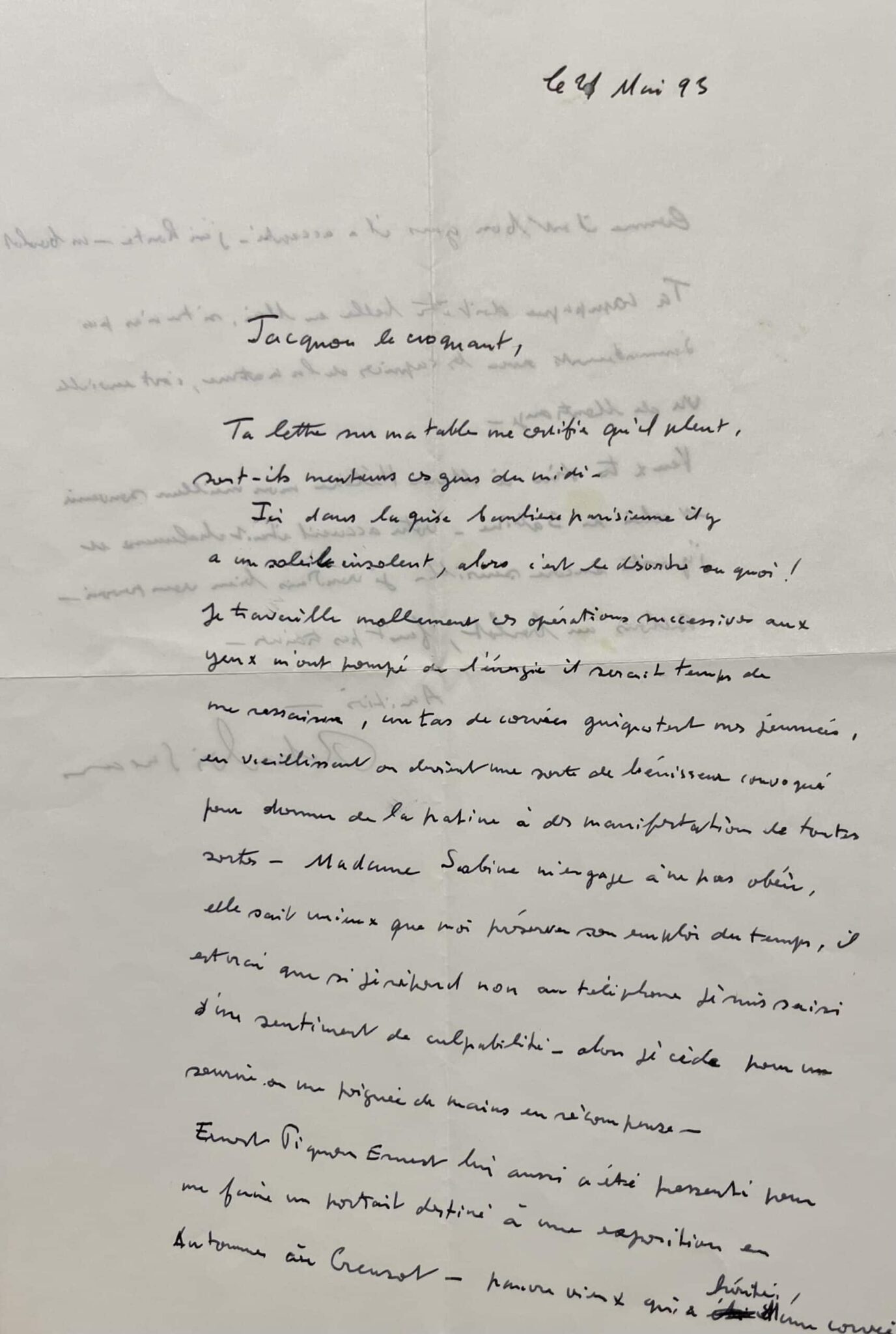 Ernest Pignon Ernest lui aussi a été pressenti pour me faire un portrait destiné à une exposition en automne au Creusot. Pauvre vieux qui a hérité d'une corvée, comme il est bon gars il a accepté - j'ai honte - un boulot de plus [...]".