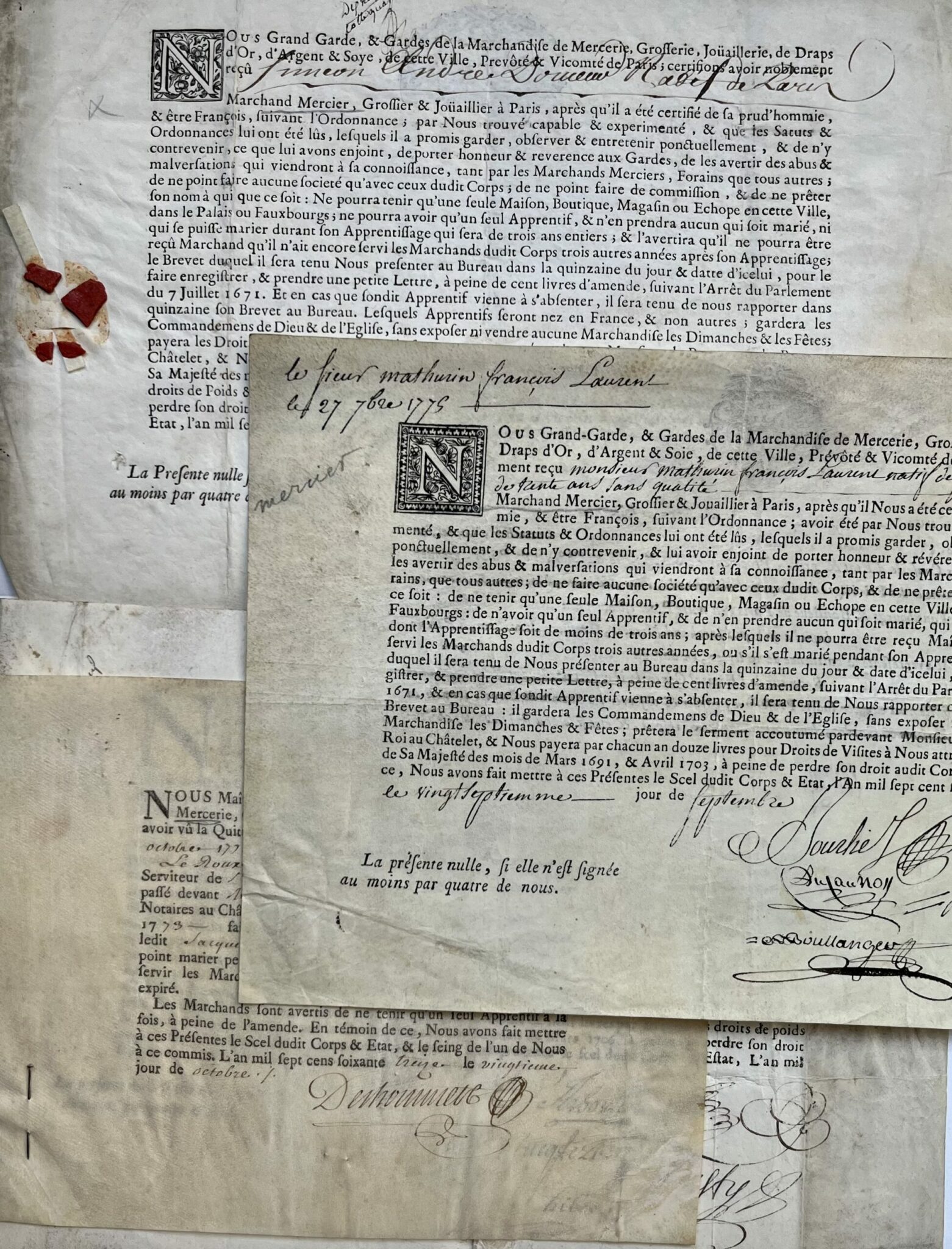Ensemble de quatre documents signés sur parchemin, en parti imprimés, relatifs aux marchands de "Mercerie, Grosserie & Joüaillerie", signés par les "gardes" de la corporation.