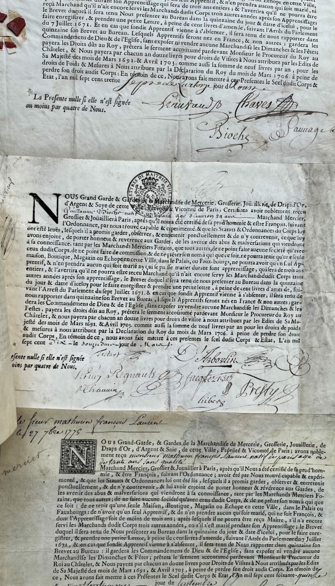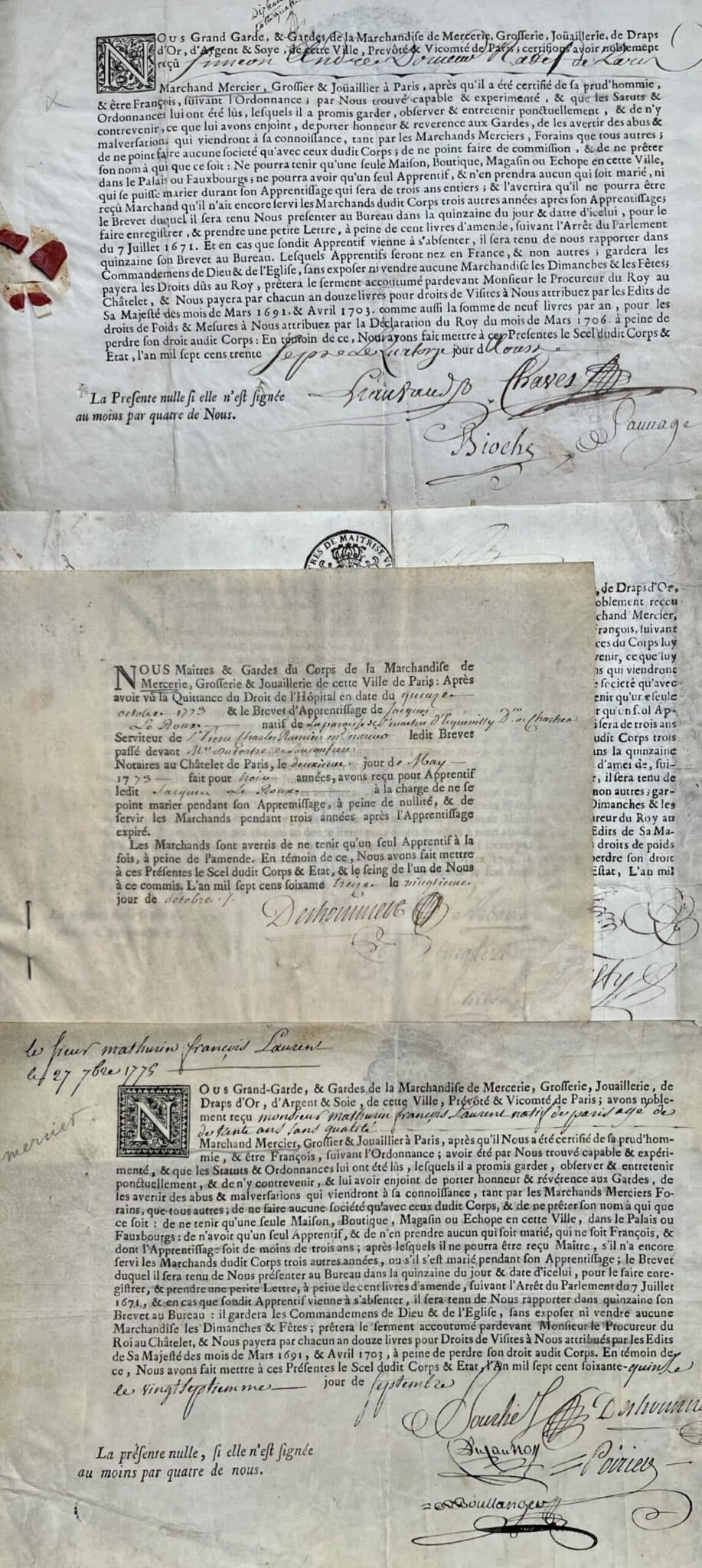 -1775 : brevet de "Mercier, Grossier & Joüaillier, de draps d'Or, d'Argent & Soye" décerné à Mathurin François Laurent, natif de Paris.