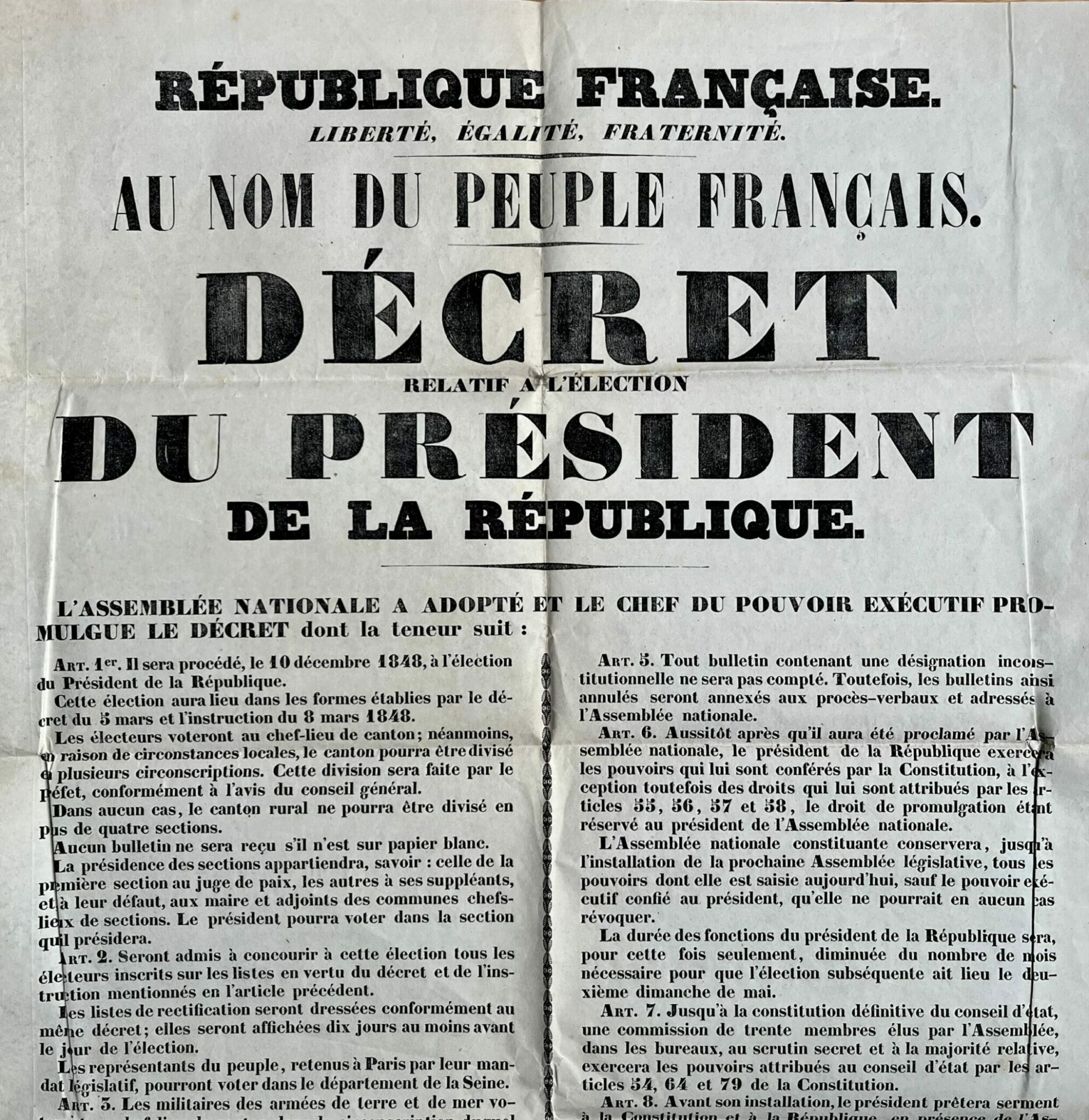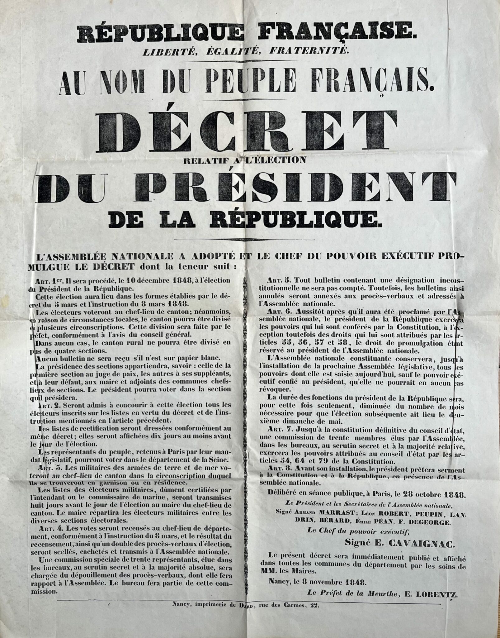 Placard relatif à l'élection présidentielle de 1848, imprimé à Nancy : "Au nom peuple français. Décret relatif à l'élection du Président de la République. L'Assemblée nationale a adopté et le chef du pouvoir exécutif promulgue le décret dont la teneur suit :