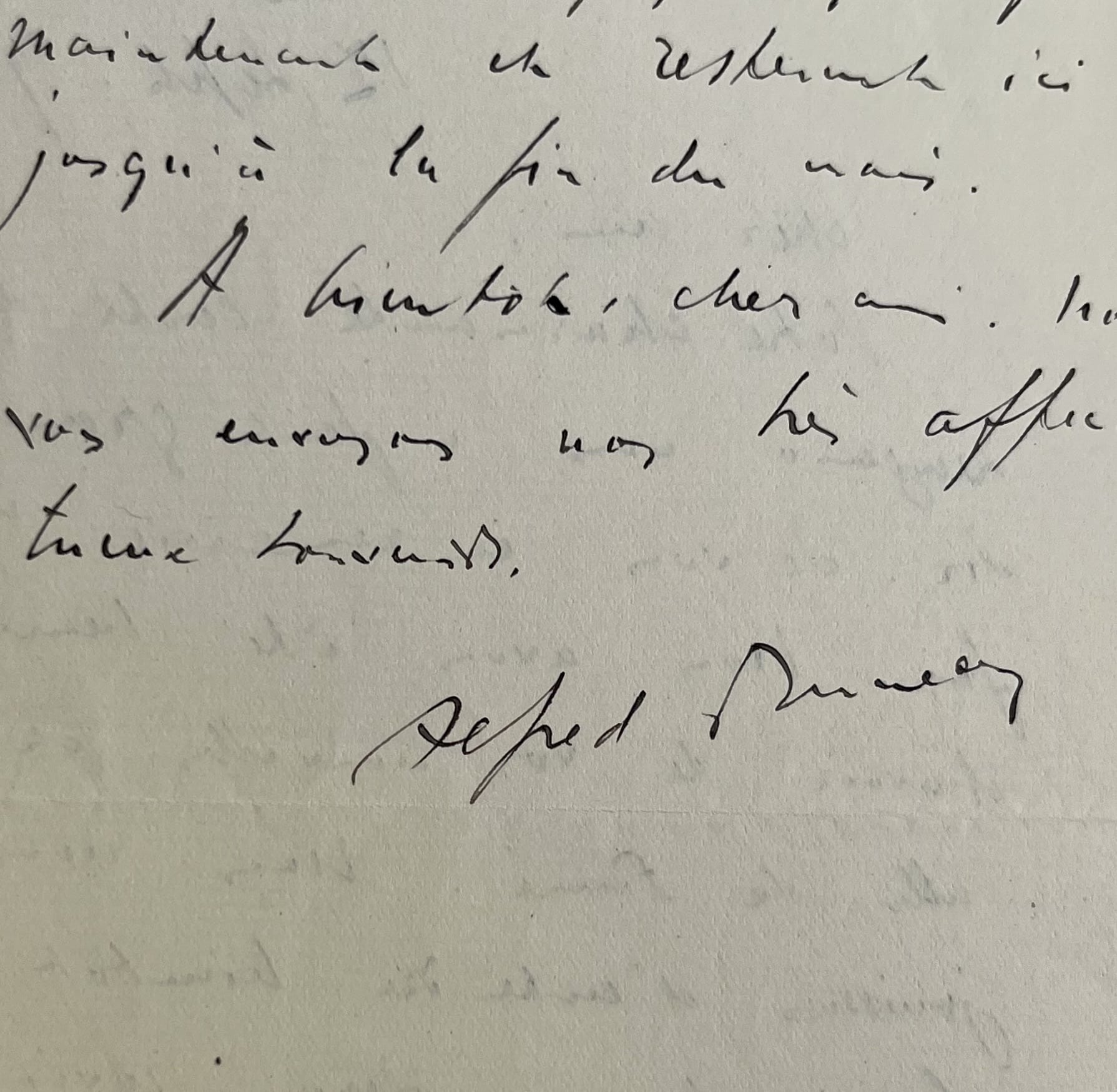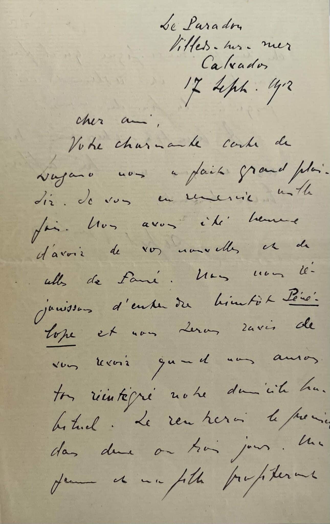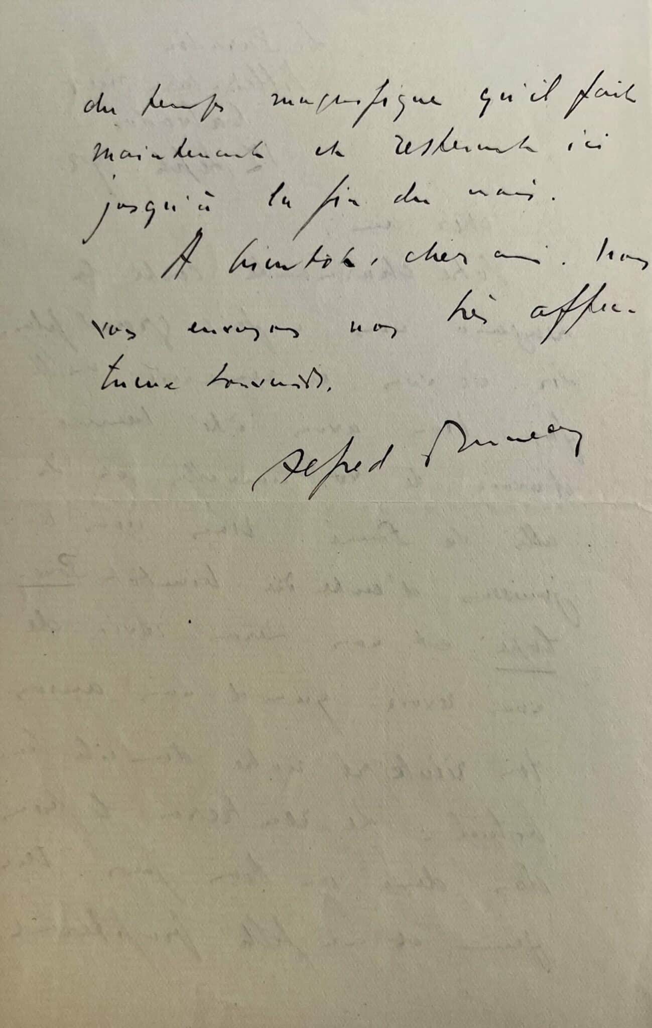 Alfred Bruneau (Paris, 1857/1934)"Cher ami, votre charmante carte de Lugano nous a fait grand plaisir. Je vous en remercie mille fois. Nous avons été heureux d’avoir de vos nouvelles et de celles de Fauré. Nous nous réjouissons d’entendre bientôt Pénélope et nous serons ravis de vous revoir, quand nous aurons tous réintégré notre domicile habituel. Je rentrerai le premier dans deux ou trois jours. Ma femme et ma fille profiteront du temps magnifique qu’il fait maintenant et resteront ici jusqu’à la fin du mois. À bientôt, cher ami. Nous vous envoyons nos très affectueux souvenir".