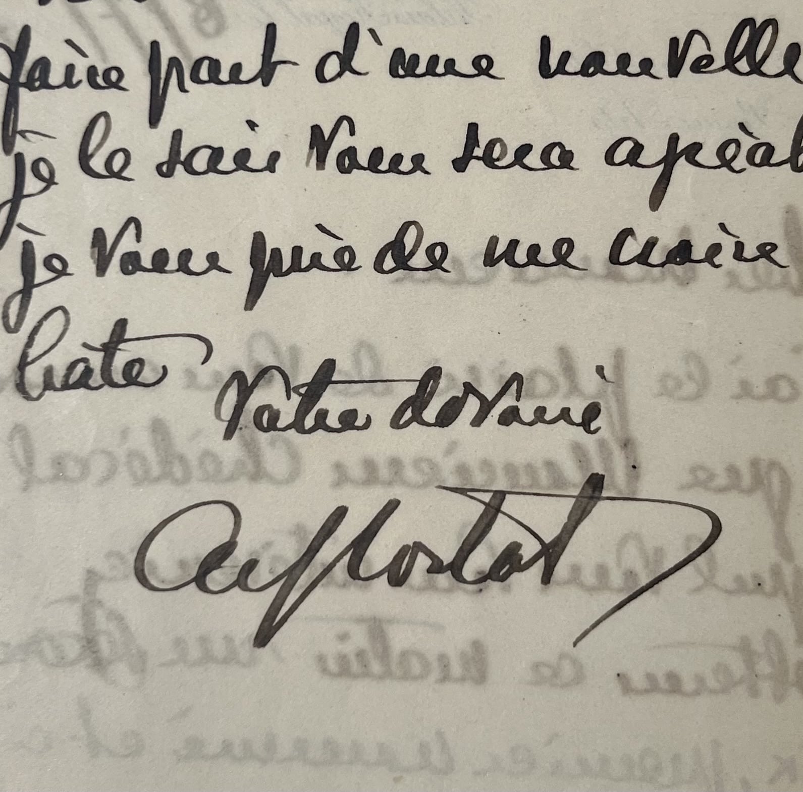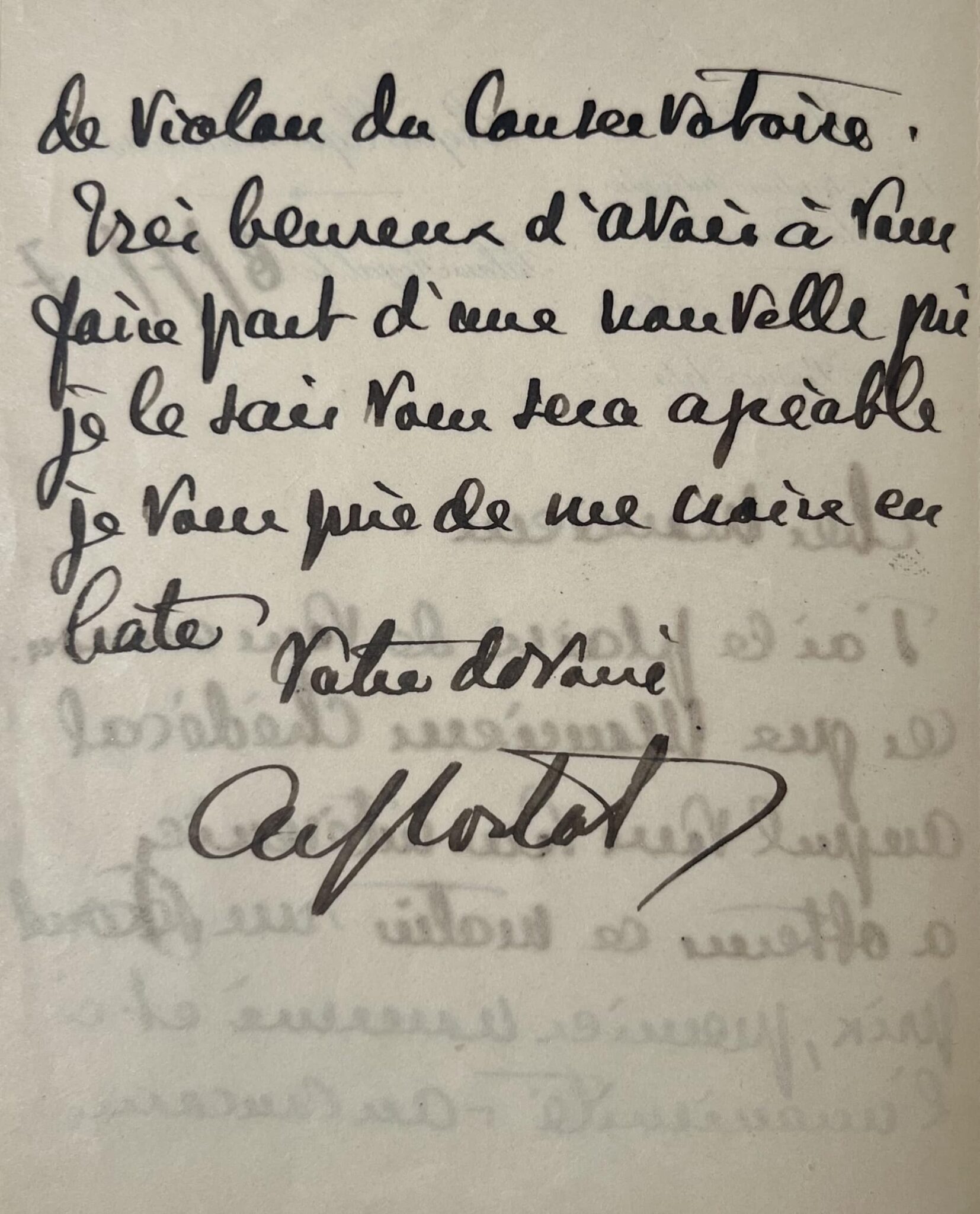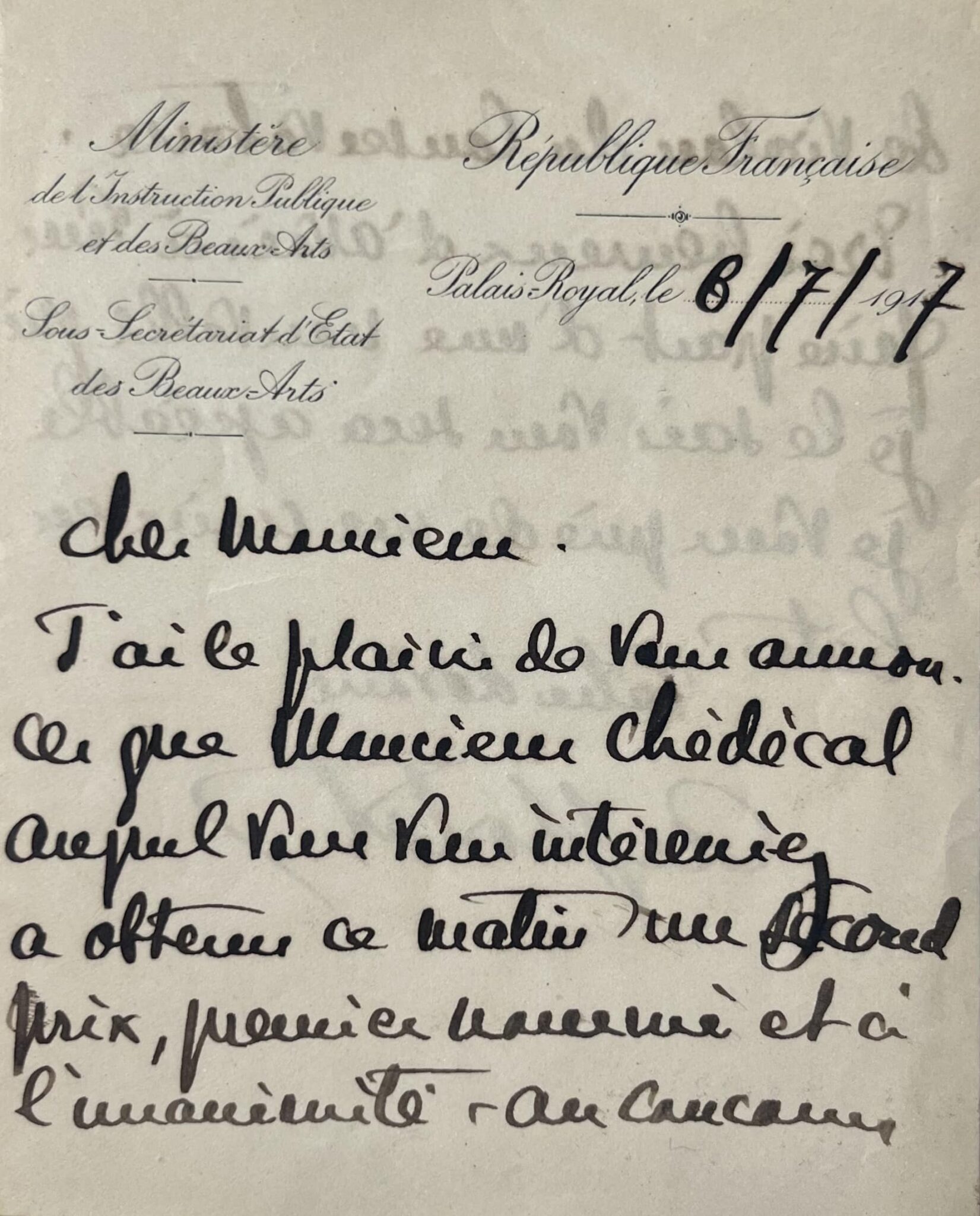 "Cher Monsieur. J’ai le plaisir de vous annoncer que Monsieur Chédécal auquel vous vous intéressiez a obtenu ce matin un second prix, premier nommé et à l’unanimité au concours de violon du Conservatoire. Très heureux d’avoir à vous faire part d’une nouvelle qui je le sais vous sera agréable. Je vous prie de me croire en hâte. Votre dévoué. Alf Cortot".