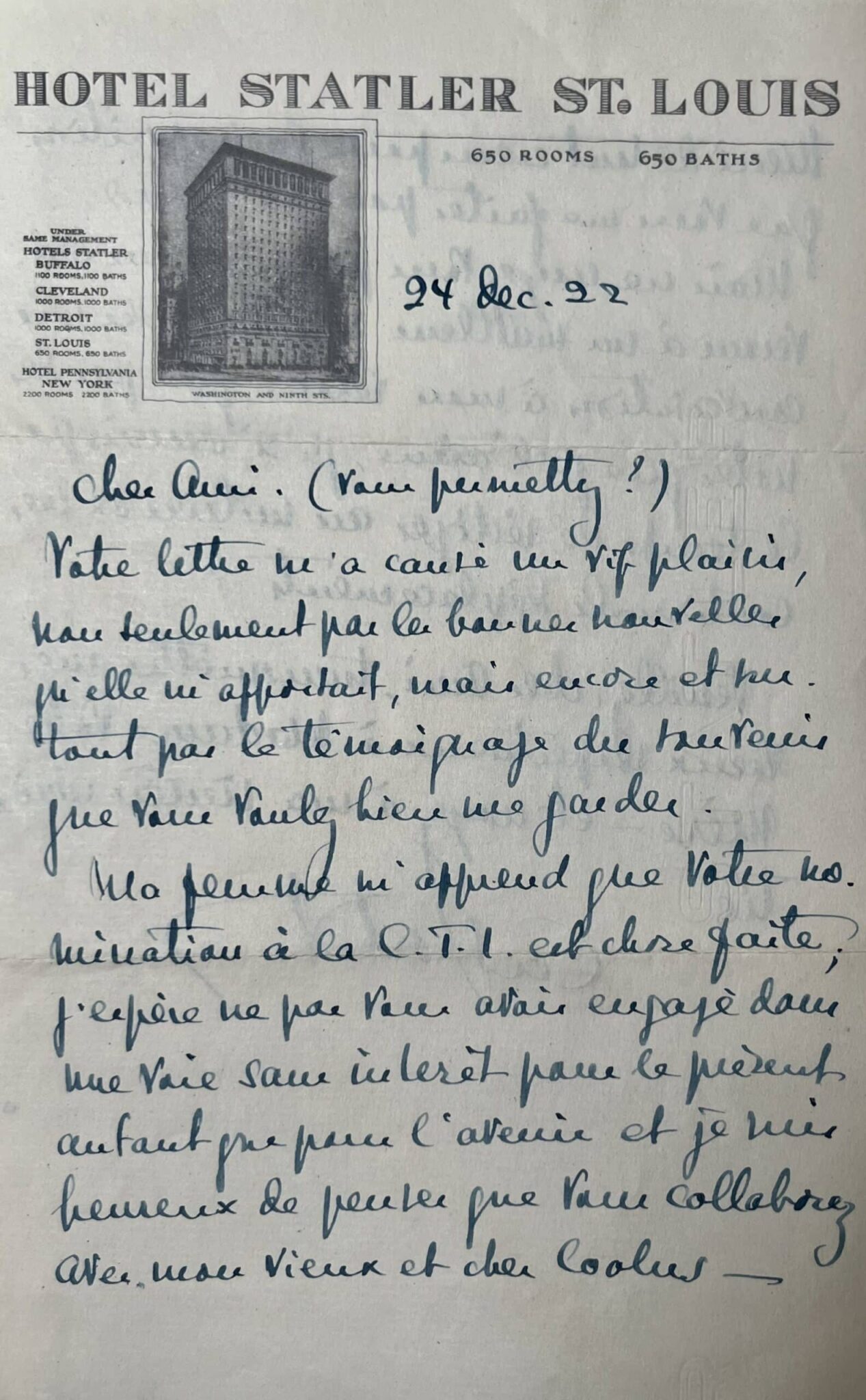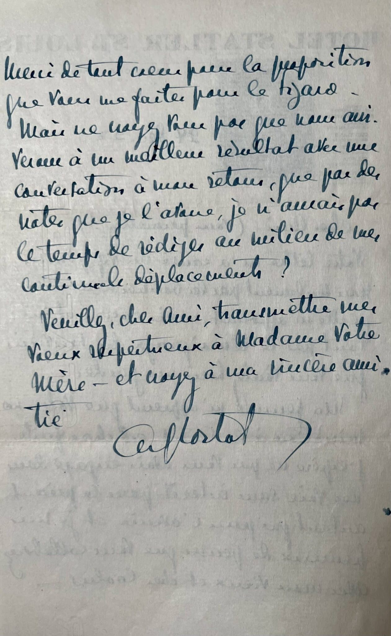 Alfred Cortot (Nyon, 1877/1962)"Cher ami. (Vous permettez ?). Votre lettre m’a causé un vif plaisir, non seulement par la bonne nouvelle, qu’elle m’apprenait, mais encore et surtout par le témoignage du souvenir que vous voulez bien me garder. Ma femme m’apprend que votre nomination à la C.T.I. est chose faite ; j’espère ne pas vous avoir engagé dans une voix sans intérêt pour le présent, autant que pour l’avenir et je suis heureux de penser que vous collaborez avec mon vieux et cher Coolus [l'écrivain et scénariste Romain Coolus (. Merci de tout cœur pour la proposition que vous me faites pour le Figaro. Mais ne croyez-vous pas que nous arriverons à un meilleur résultat avec une conversation à mon retour, que par des notes que je l’avoue, je n’aurai pas le temps de rédiger au milieu de mes continuels déplacements ? Veuillez, cher ami, transmettre mes vœux respectueux à madame votre mère et croyez à ma sincère amitié".