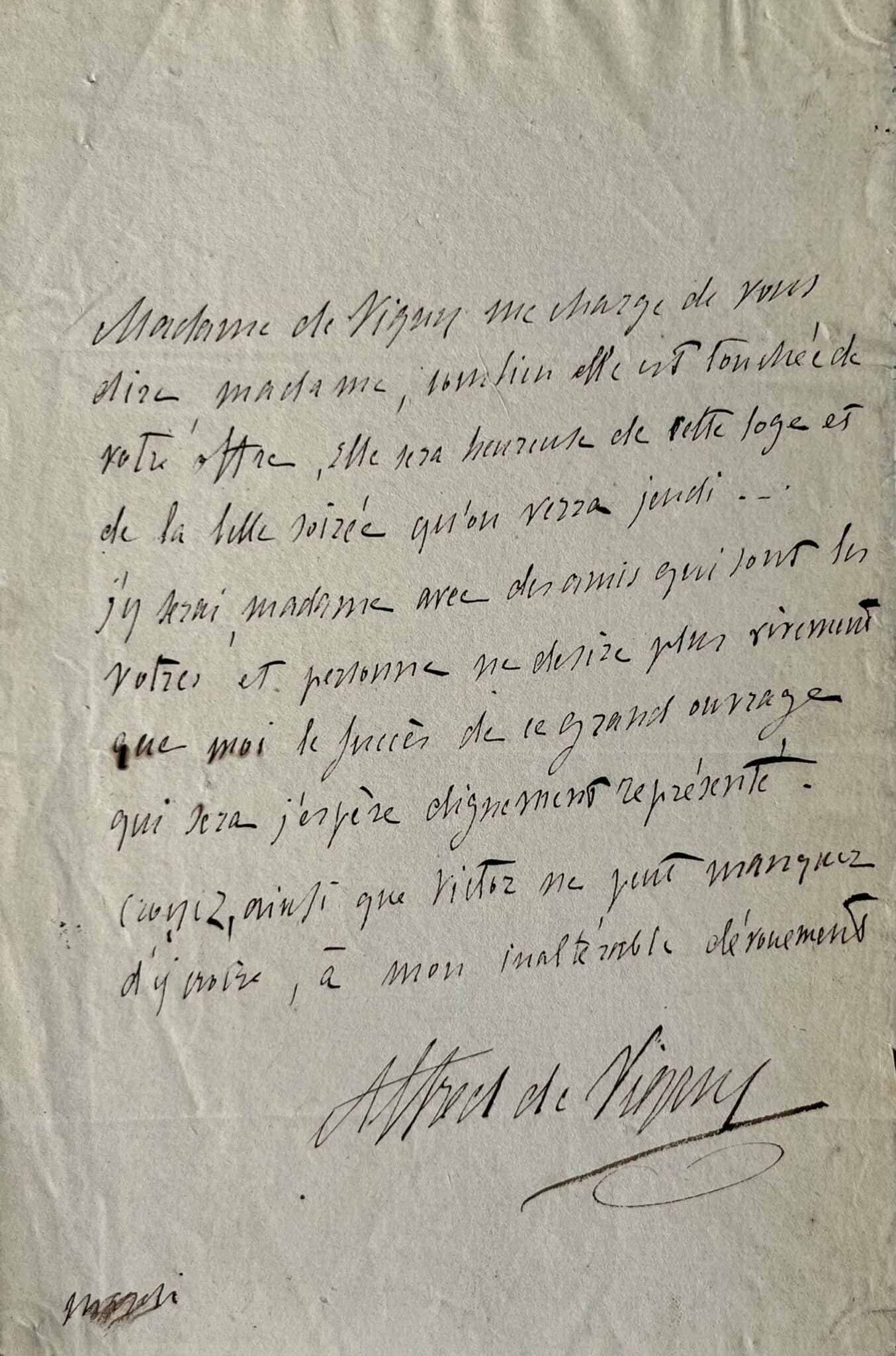 "Madame de Vigny me charge de vous dire, Madame, combien elle est touchée de votre offre, elle sera heureuse de cette loge et de la belle soirée qu'on verra jeudi. J’y serai, madame, avec des amis qui sont les vôtres et personne ne désire plus vivement que moi le succès de ce grand ouvrage qui sera j’espère dignement représenté. Croyez, ainsi que Victor ne peut manquer d'y croire, à mon inaltérable, dévouement. Alfred de Vigny".