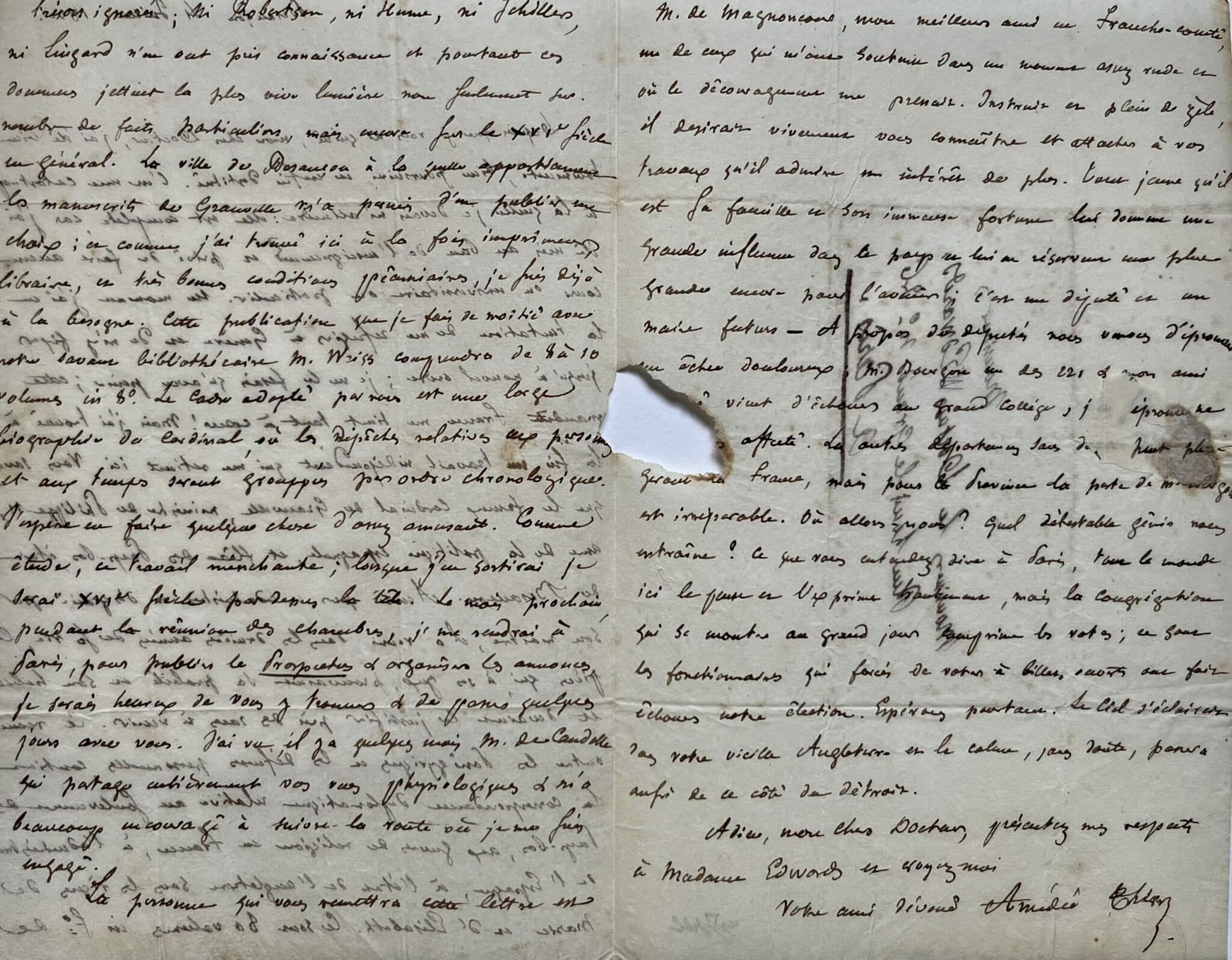 Amédée Thierry (Blois , 1797 /1873 )"Depuis que je vous ai quitté, mon cher Docteur, j’ai été bien tourmenté, bien poursuivi et enfin destitué. C’est une catastrophe à la quelle je devais m’attendre : elle est complète, car j’ai été mis au ban de l’enseignement et privé de faire aucun cours ou universitaire ou particulier. À nouveau j’ai eu la tentation de me réfugier à Genève, et de m'y fixer jusqu’à nouvel ordre ; je ne le ferai qu’avec peine ; cette maudite France me tient tant à cœur ! Mais j’ai trouvé à la fin un travail indépendant qui me retient ici".