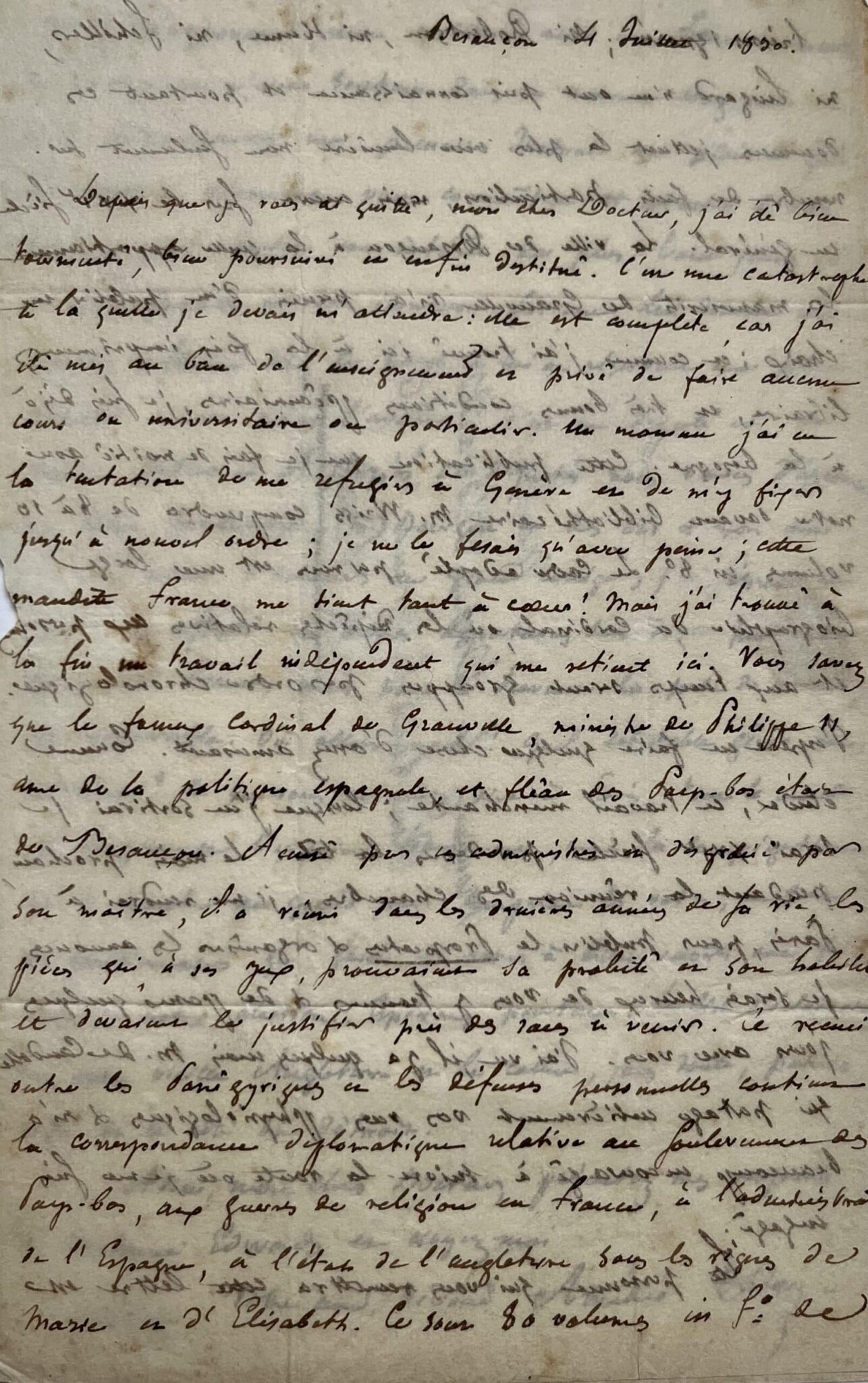 Augustin Thierry explique alors son nouveau projet de publication : "Vous savez que le fameux cardinal de Granvelle, ministre de Philippe II, âme de la politique espagnole [...] était de Besançon. Accusé par ses administrés et disgracié par son maître, il a réuni dans les dernières années de sa vie, les pièces qui, à ses yeux, prouvaient sa probité [...]. Ce recueil, outre les panégyriques et les défenses personnelles, contient la correspondance diplomatique relative au gouvernement des Pays-Bas, aux guerres de religion en France, à l’administration de l’Espagne, à l’état de l’Angleterre, sous les règnes de Marie et d’Elisabeth. Ce sont 80 volumes in-f, de trésors ignorés ; ni Robertson, ni Hume, ni Schiller [...] n'en ont pris connaissance et pourtant ces données jettent la plus vive lumière non seulement sur nombre de faits particuliers, mais encore sur le XVIe siècle en général. La ville de Besançon à laquelle appartiennent les manuscrits de Granvelle m’a permis de publier un choix ; et comme j’ai trouvé ici à la fois imprimeur, libraire, et très bonnes conditions pécuniaires, je suis déjà à la besogne. Cette publication que je fais de moitié avec notre savant bibliothécaire M. Weiss comprendra de 8 à 10 volumes in-8. Le cadre adoptée par nous est une large bibliographie du cardinal [...]".