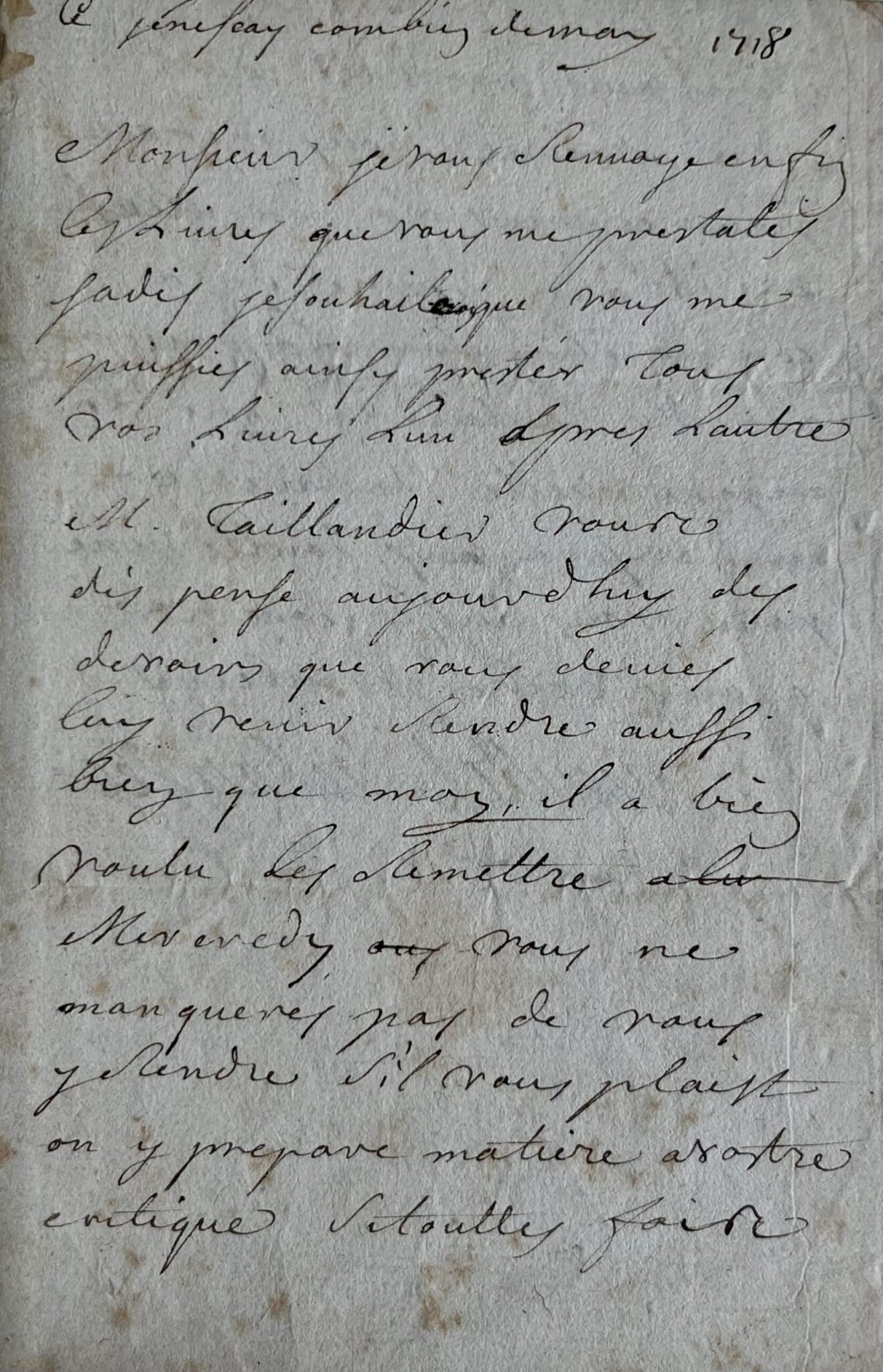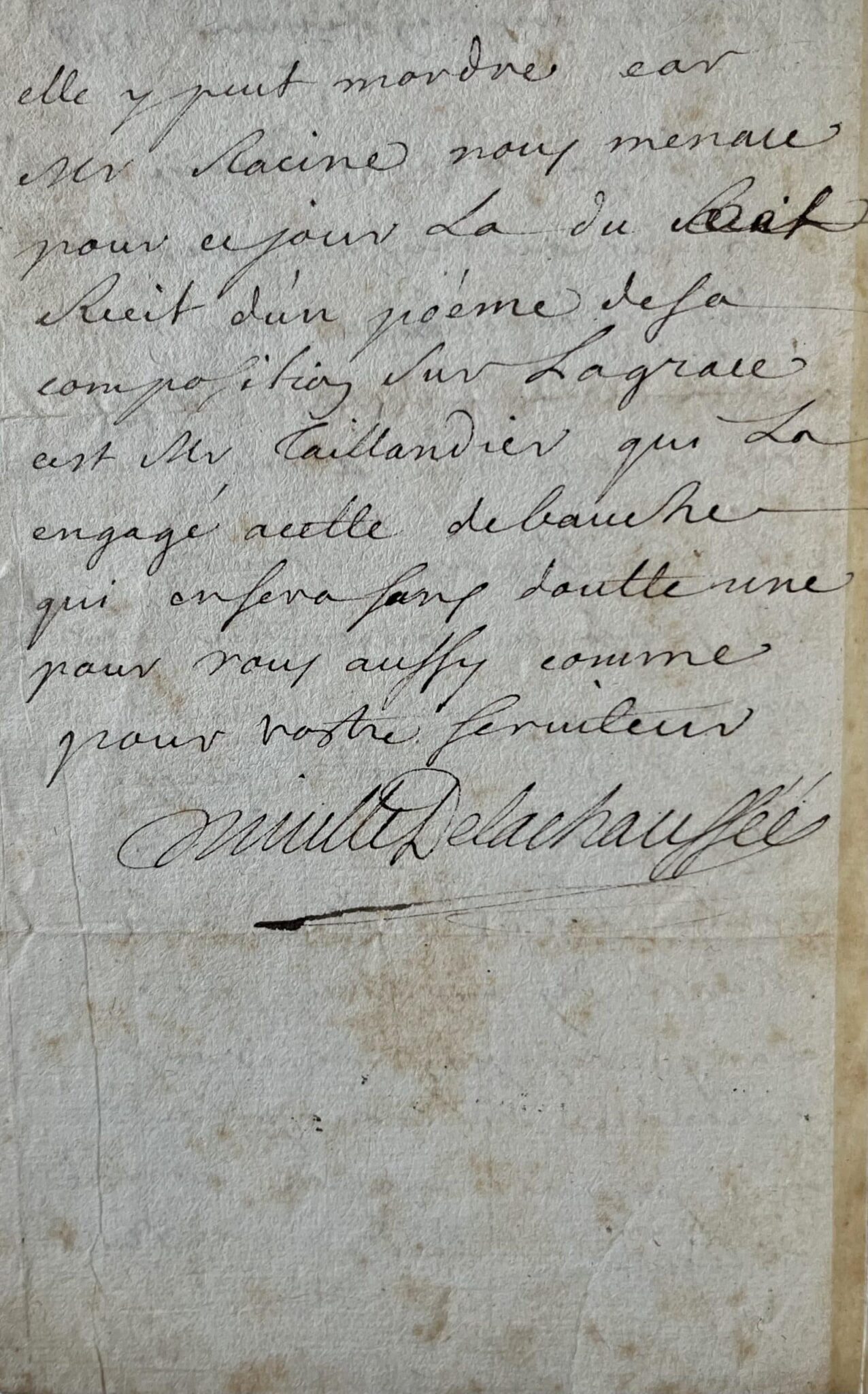 Pierre-Claude Nivelle de La Chaussée (Paris, 1692 /1754)"Monsieur je vous renvoye enfin les livres que vous me prestates jadis je souhaite que vous me puissiez ainsy prester tous vos livres l'un apres l'autre. M. Taillandier vous dispense aujourd'huy des devoirs que vous deviez luy venir rendre aussi bien que moy, il a bien voulu les remettre a Mercredy. Vous ne manquerez pas de vous y rendre s'il vous plaist, on y prepare matiere a vostre critique si touttes faire elle y peut mordre car Mr Racine nous menace pour ce jour la du récit d'un poème de sa composition sur la grâce. C'est Mr Tallandier qui l'a engagé à cette debauche qui en sera sans doutte une pour vous aussy comme pour votre serviteur".