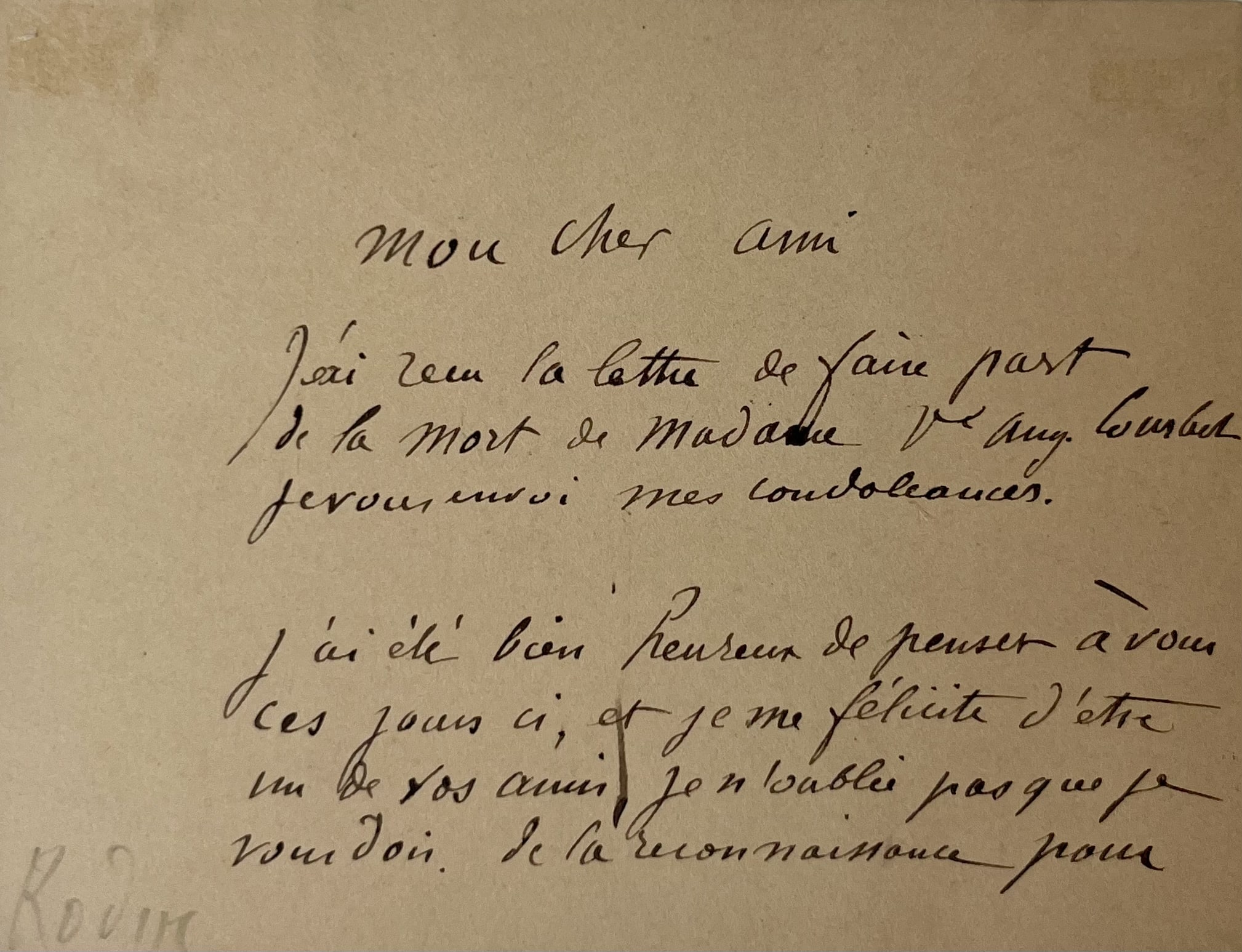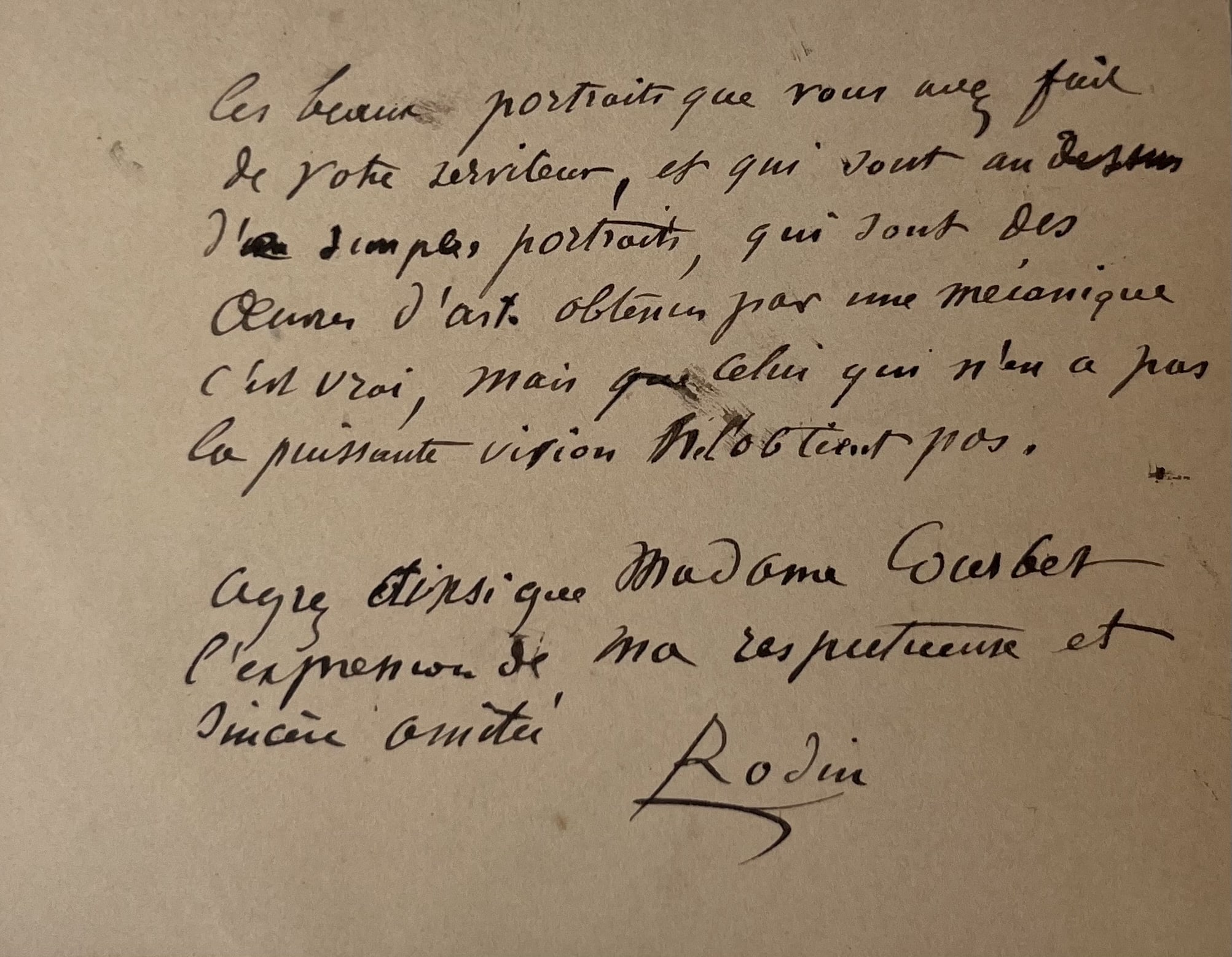 "Mon cher ami. J'ai reçu la lettre de faire part de la mort de Madame Ve Aug. Courbet. Je vous envoie mes condoléances. J'ai été bien heureux de penser à vous ces jours-ci, et je me félicite d'être un de vos amis, je n'oublie pas que je vous dois de la reconnaissance pour les beaux portraits que vous avez fait de votre serviteur, et qui sont au dessus de simples portraits, qui sont des oeuvres d'art obtenues par une mécanique c'est vrai, mais que celui qui n'en a pas la puissante vision ne l'obtient pas. Agréez ainsi que Madame Courbet l'expression de ma respectueuse et sincère amitié. Rodin".