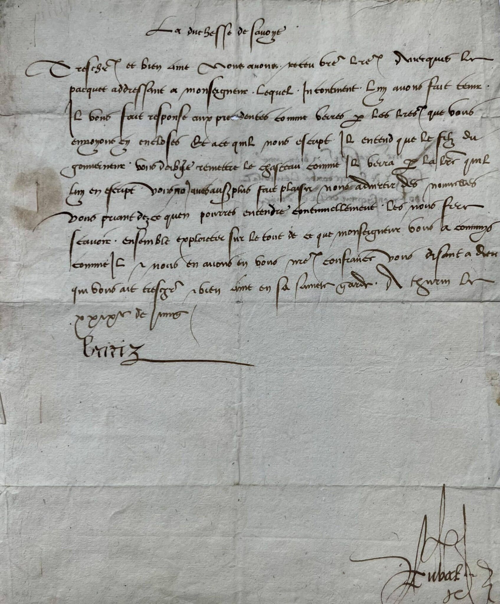"La duchesse de Savoye. Très cher et bien aimé nous avons receu vostre lettre avecques le pacquet adressant a monseigneur [le duc de Savoie], lequel incontinent luy avons fait tenir. Il vous fait response aux precedentes comme verrez par les lettres que vous envoyons cy encloses Et à ce quil nous escript il entend que le filz du gouverneur vous doibve remettre le chasteau comme il verra par la lettre quil luy en escript Vous ne savez au Sr plus fait plaisir nous advertir des nouvelles vous priant de ce quen pourres entendre continuellement, les nous ferez scavoir, ensemble exploicter sur le tout de ce que monseigneur vous a commys comme il et nous en avons en vous notre confiance vous disant a Dieu qui vous ait tres cher et bien aié en sa saincte garde." Signature "Britiz".