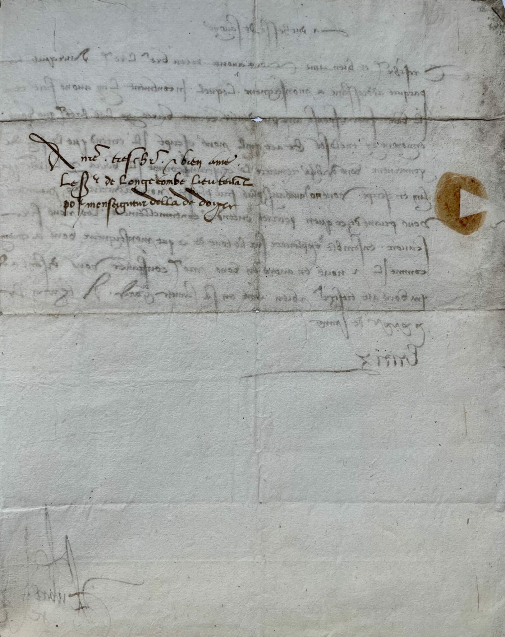 Adresse au verso : "A notre tres cher et bien aimé le Sr de Longecombe lieutenant pour monseigneur della de [doyer ??]".