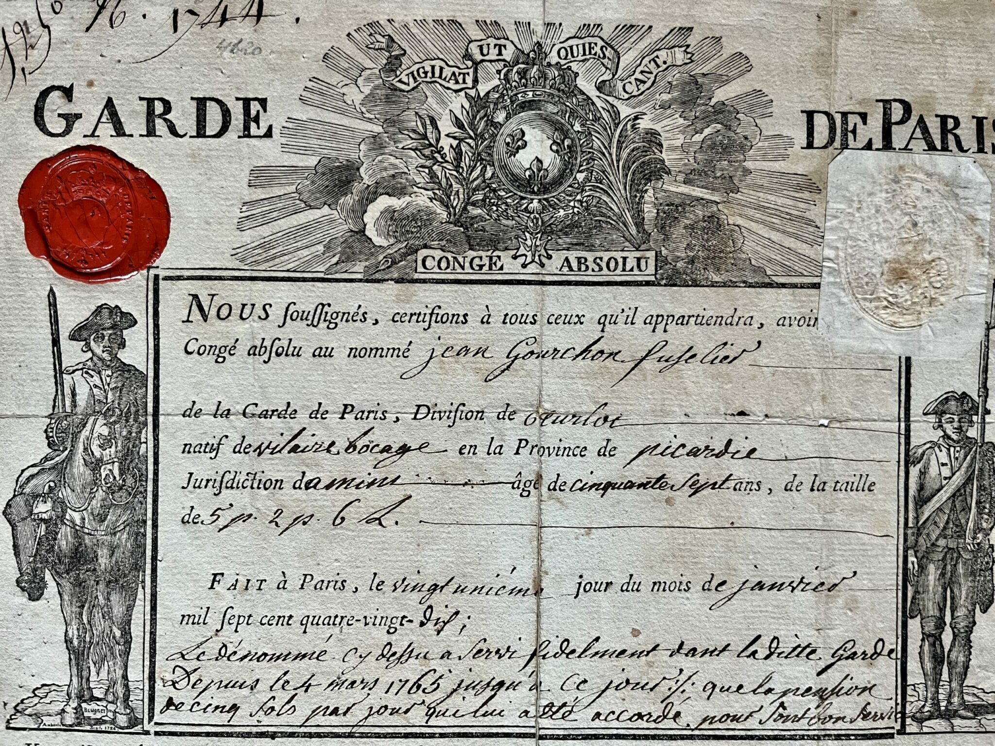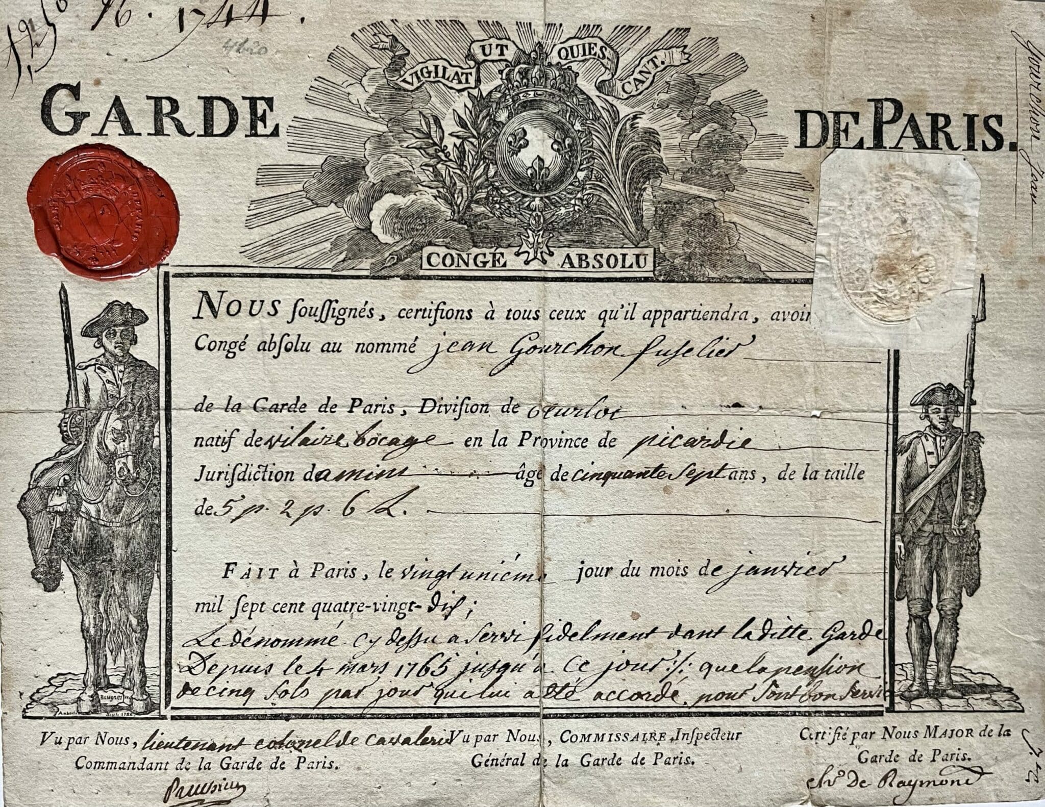 Congé absolu de la Garde de Paris, délivré en janvier 1790, à Jean Gourchon "natif de Vilaire Bocage [Villers-Bocage dans le Calvados] en la province de Picardie juridiction d'Amiens, âgé de cinquante sept ans, de la taille de 5 pieds 2 pouces [...] [qui] a servi fidèlement dans laditte garde depuis le 4 mars 1765 jusqu'à ce jour [...]". Deux signatures.