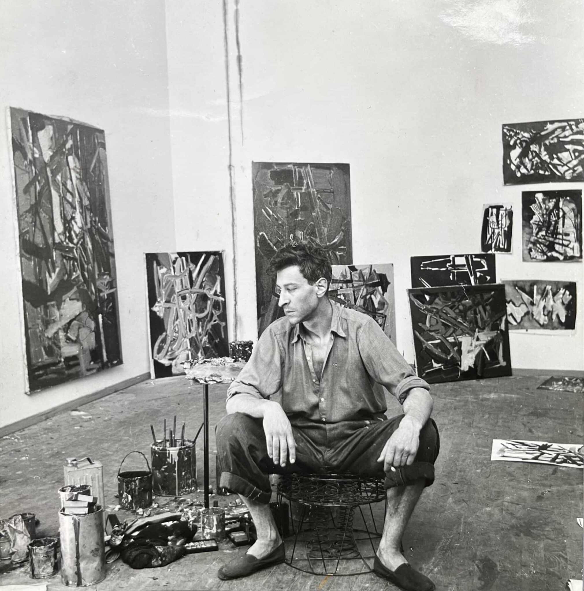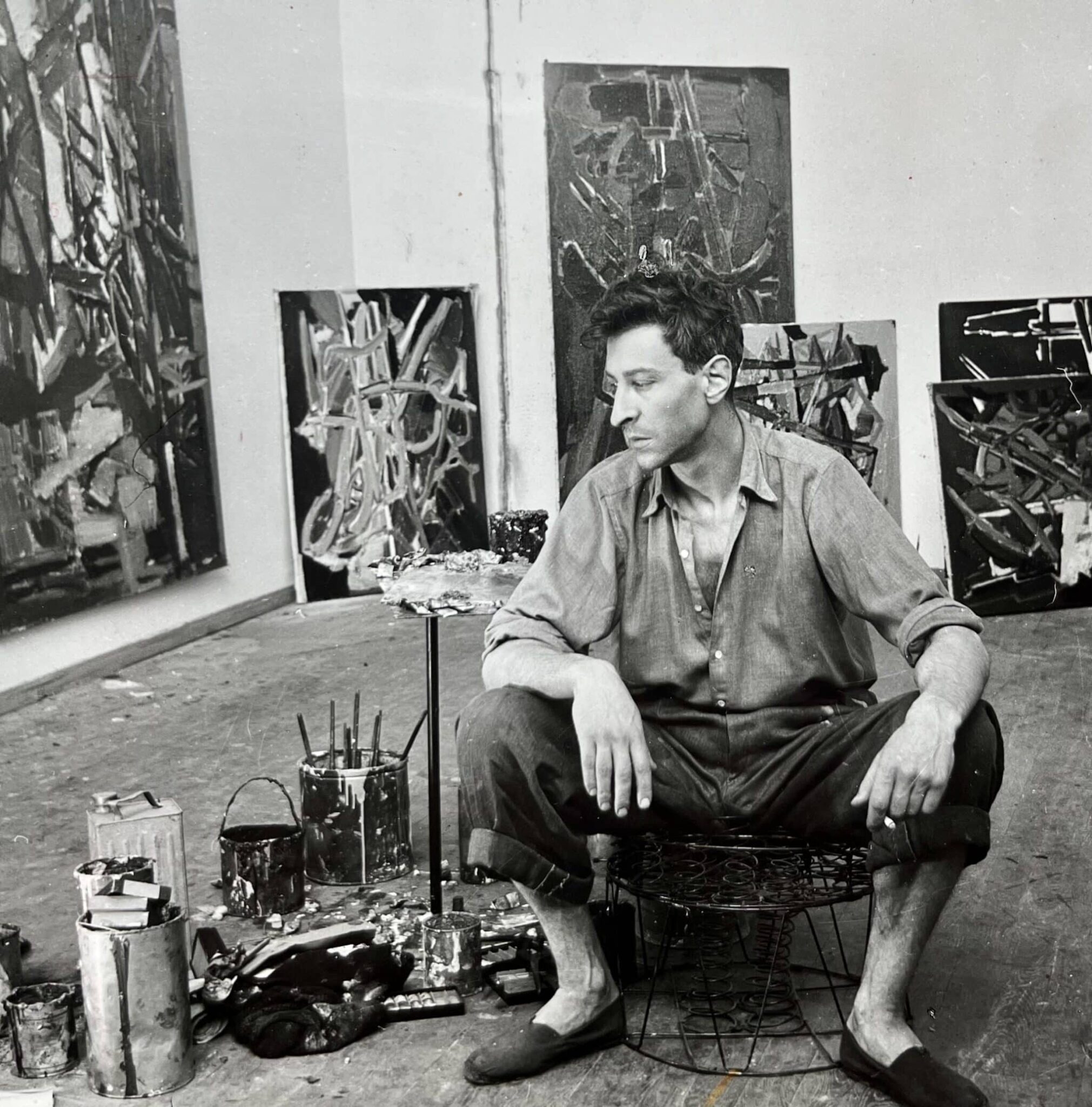 Belle photographie de Nicolas de Staël, assis, sombre et perdu, dans son atelier, entouré de ses peintures, par Edith Michaelis.
