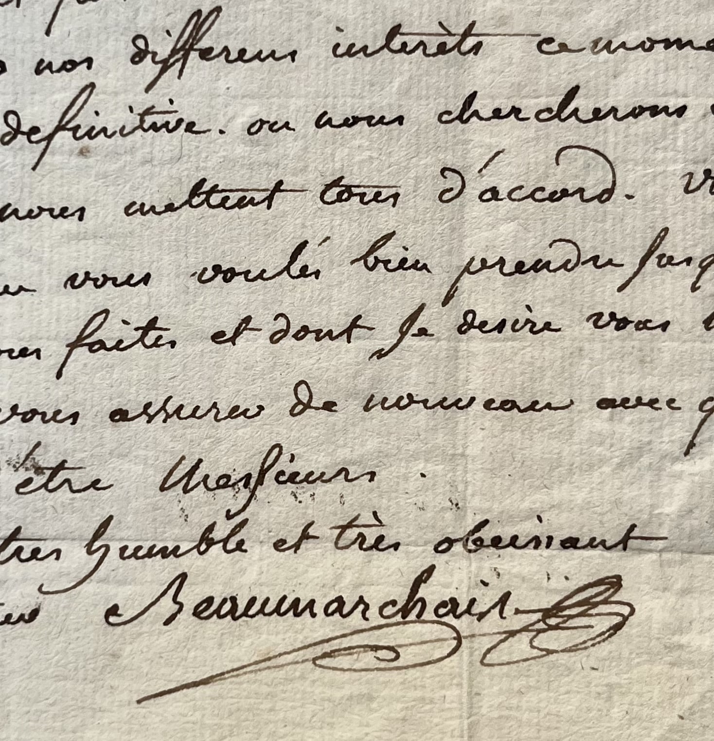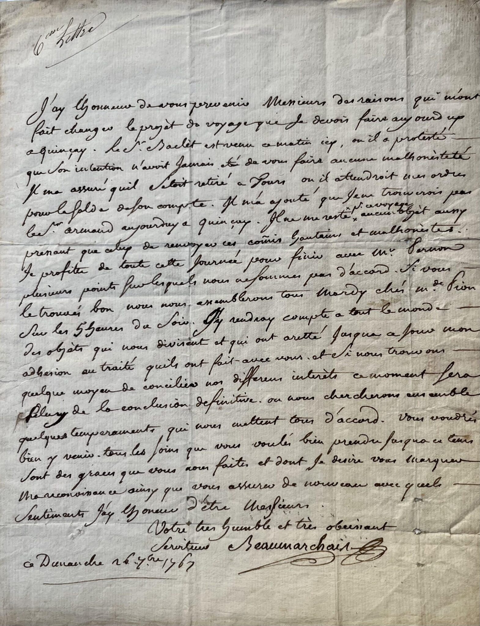 Beaumarchais a dû changer son projet de voyage à Quinçay : Baclet est venu le voir pour protester : "son intention n'avoit jamais été de vous faire aucune malhonesteté", il l'a assuré qu'il s'était retiré à Tours en attendant ses ordres pour le solde de son compte, et que le Sieur Armand ne serait pas à Quinçay aujourd'hui. Beaumarchais compte donc "renvoyer ces commis hautains et malhonnestes", et préfère profiter de cette journée pour régler avec Mr Pernon les points de désaccord. Il propose une réunion mardi : "J'y rendrai compte à tout le monde des objets qui nous divisent et qui ont aretté jusque ce jour mon adhesion au traité quils ont fait avec vous". Il souhaite parvenir à trouver une conciliation et une conclusion définitive à cette affaire.