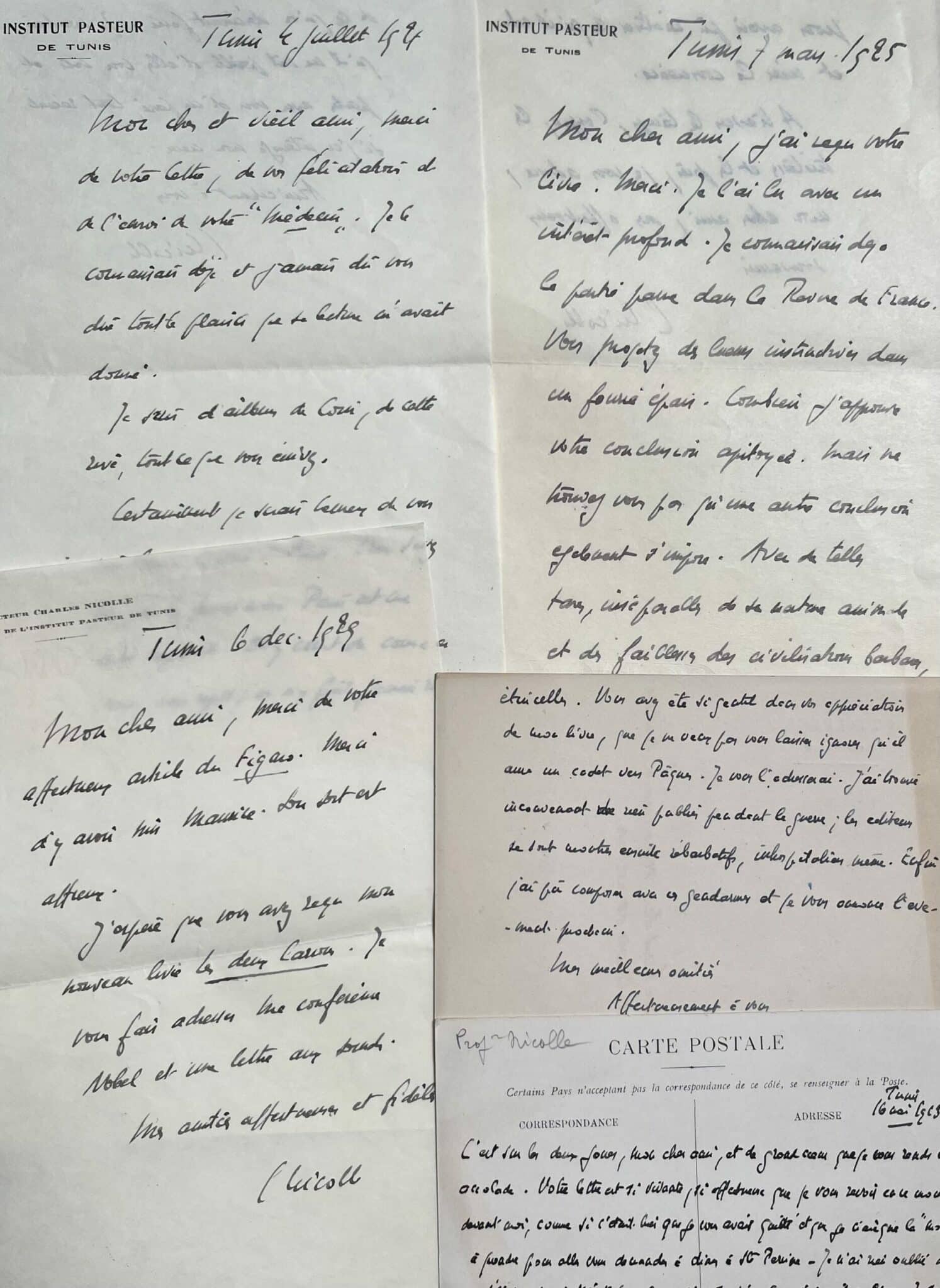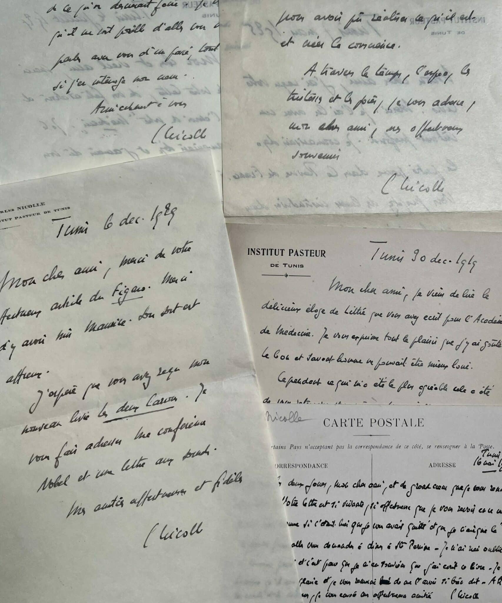 Charles Nicolle (Rouen, 1866/1936)Charmante correspondance échangée entre ces deux éminents médecins qui ont tout-deux publié des oeuvres littéraires. Nicolle, souvent ému par leur lecture, encense le talent de son confrère, notamment pour L'Eloge de Littré, Le Médecin et Les états dépressifs et la neurasthénie.