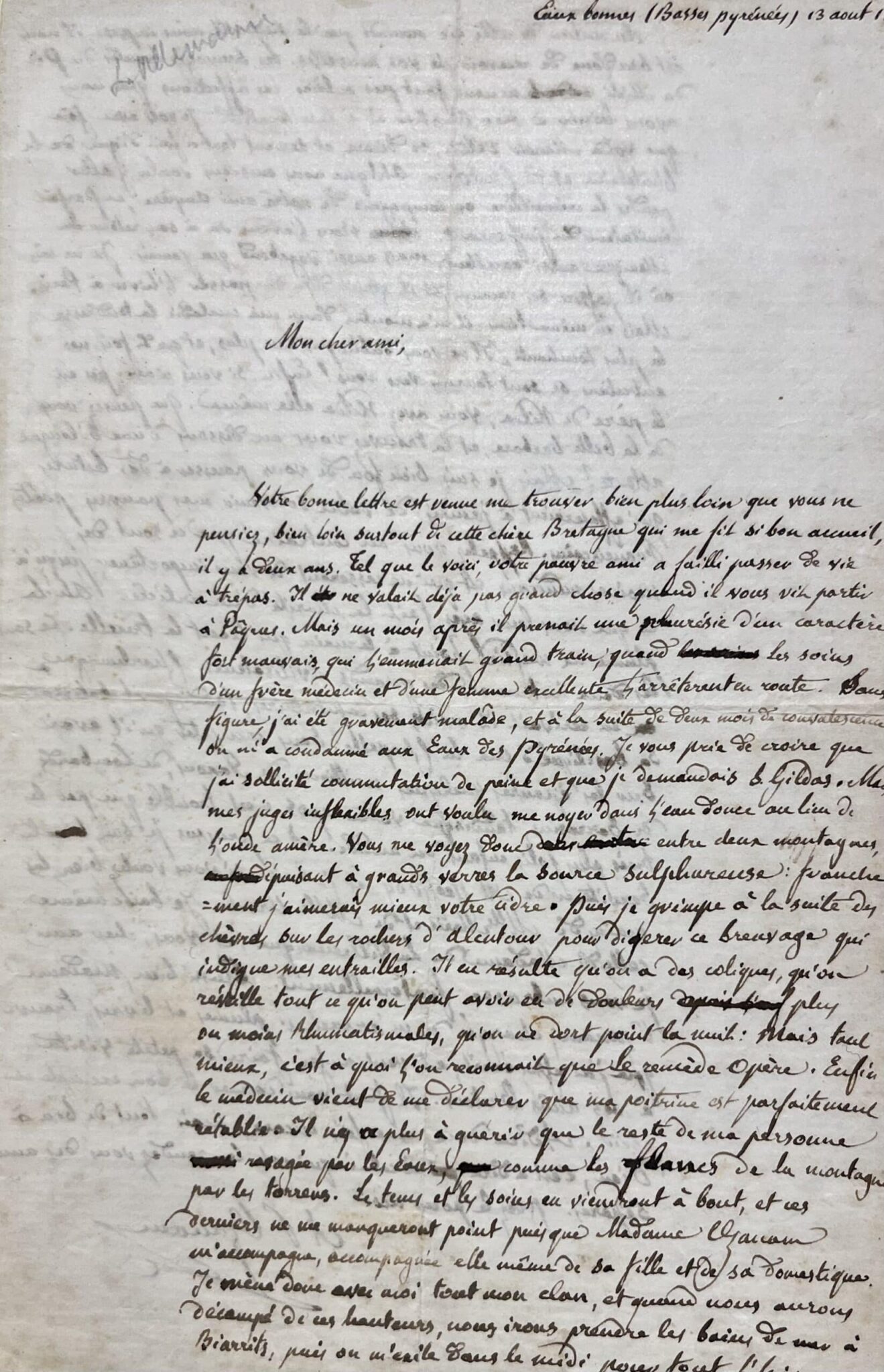 Je vous prie de croire que j’ai sollicité commutation de peine, et que je demandais S. Gildas. Mais mes juges inflexibles ont voulu me noyer dans l’eau douce au lieu de l'onde amère. Vous me voyez donc entre deux montagnes puisant à grands verres la source sulfureuse : franchement j’aimerais mieux votre cidre. Puis je grimpe à la suite des chèvres sur les rochers d'alentours pour digérer ce breuvage qui indigne mes entrailles. Il en résulte qu’on a des coliques, qu’on réveille tout ce qu’on peut avoir eu de douleurs plus ou moins rhumatismales, qu’on ne dort point la nuit : mais tout mieux, c’est quoi l’on reconnaît que le remède opère. Enfin le médecin vient de me déclarer que ma poitrine est parfaitement rétablie. Il n’y a plus à guérir que le reste de ma personne ravagée par les eaux, comme les flancs de la montagne par les torrents".