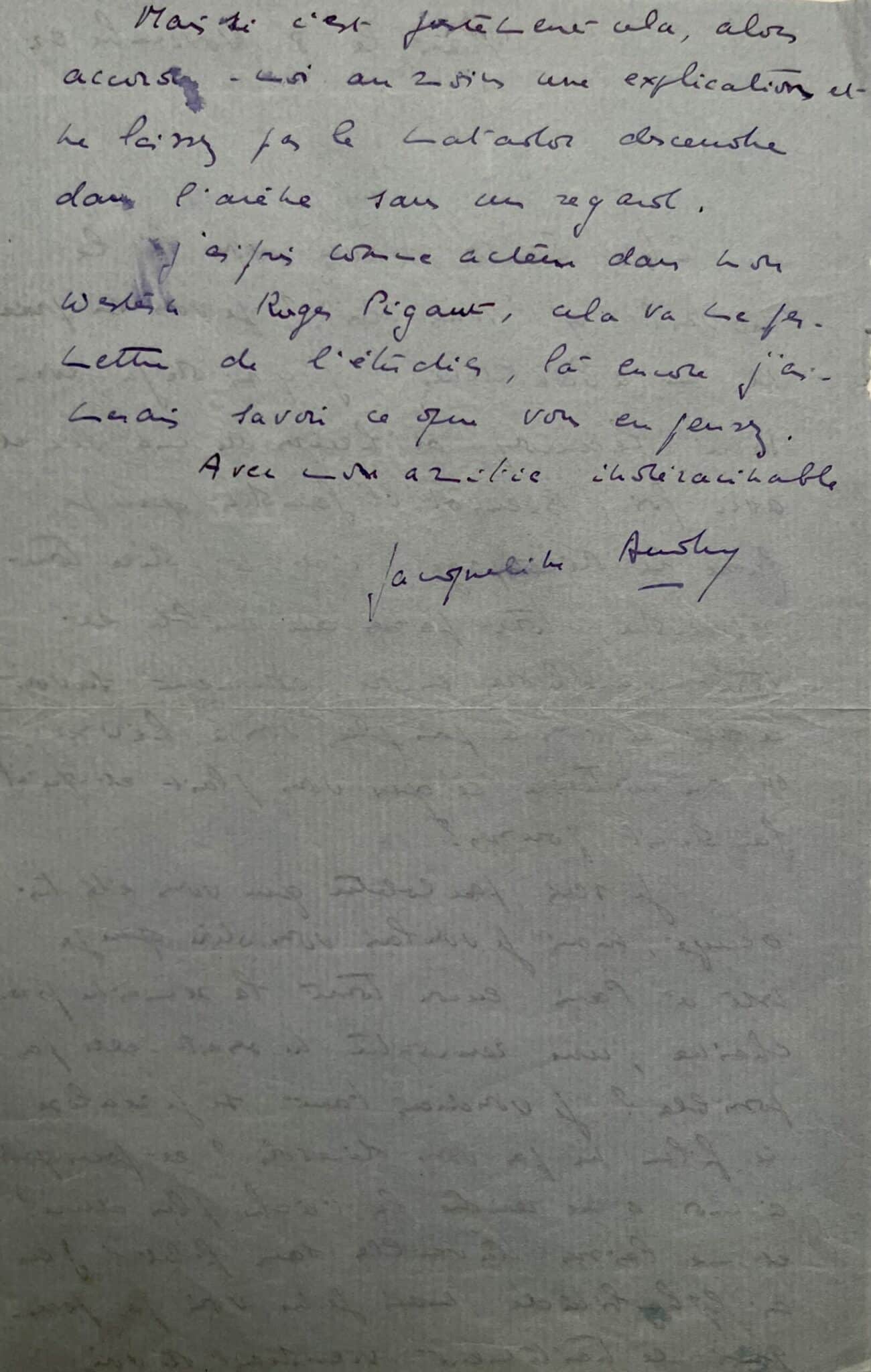 Belle et rare lettre de la cinéaste Jacqueline Audry à Jean-Paul Sartre, au sujet de l’adaptation de Huis Clos