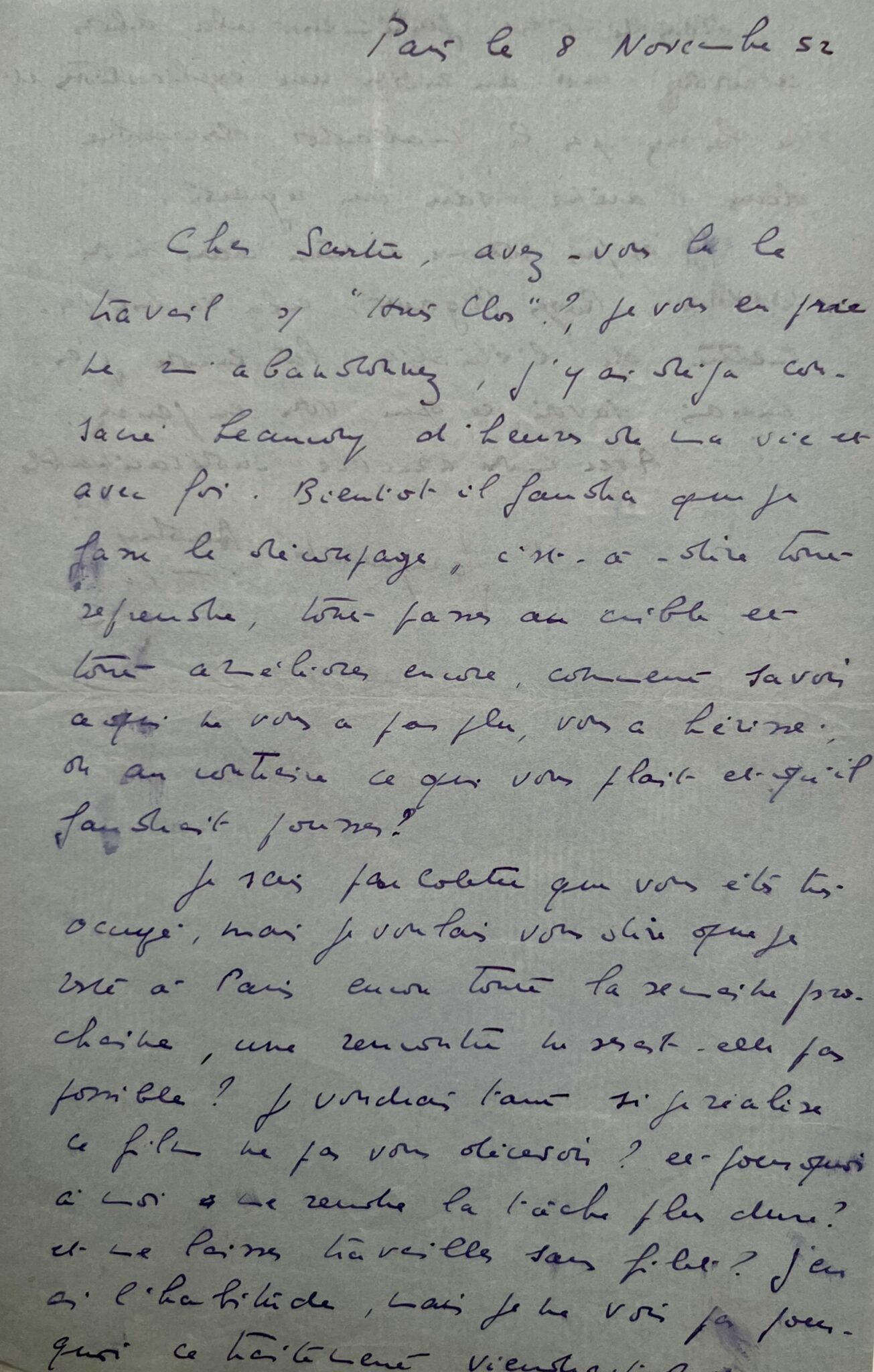 "Cher Sartre, avez-vous lu le travail s/ « Huis clos » ? Je vous en prie ne m’abandonnez [pas], j’y ai déjà consacré beaucoup d’heures de ma vie et avec foi. Bientôt, il faudra que je fasse le découpage, c’est-à-dire tout reprendre, tout passer au crible et tout améliorer encore, comment savoir ce qui ne vous a pas plu, vous a hérissé, ou au contraire, ce qui vous plaît et qu’il faudrait pousser ? Je sais par Colette [sa sœur Colette Audry (1 scénariste française, également militante socialiste et féministe] que vous êtes très occupé, mais je voulais vous dire que je reste à Paris encore toute la semaine prochaine, une rencontre ne serait-elle pas possible ? Je voudrais tant si je réalise ce film ne pas vous décevoir ? Et pourquoi à moi me rendre la tâche plus dure ? Et me laisser travailler sans filet ? J’en ai l’habitude, mais je ne vois pas pourquoi ce traitement viendrait de vous. Mais si c’est justement cela, alors accordez moi au moins une explication et ne laissez pas le matador descendre dans l'arène sans un regard. J’ai pris comme acteur dans mon western Roger Pigaut, cela va me permettre de l’étudier, là encore, j’aimerais savoir ce que vous en pensez. Avec mon amitié indéracinable".