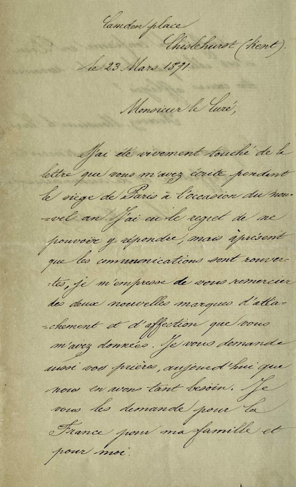 "J'ai été vivement touché de la lettre que vous m'avez écrite pendant le siège de Paris à l'occasion du nouvel an. J'ai eu le regret de ne pouvoir y répondre, mais à présent que les communications sont rouvertes, je m'empresse de vous remercier des deux nouvelles marques d'attachement et d'affection que vous m'avez données. Je vous demande aussi vos prières, aujourd'hui que nous en avons tant besoin. Je vous les demande pour la France pour ma famille et pour moi. En effet, la confiance en Dieu n'est-elle pas la seule ressource des cœurs affligés ? [...]".