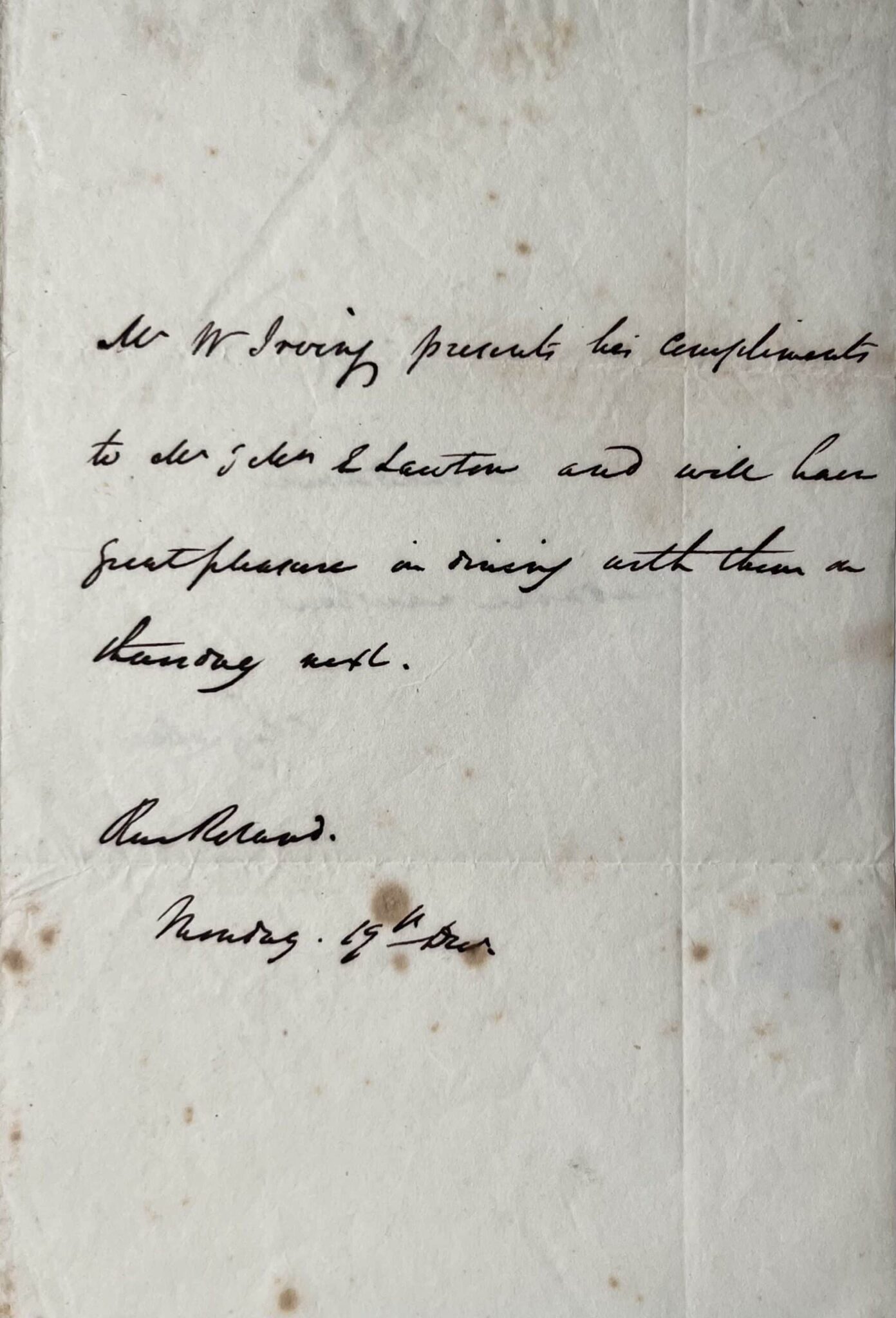 "Mr W Irving presents his compliments to M. & Mrs E. Lawton and will have great pleasure in dining with them on thursday next. Rue Roman. Monday 19th Dec".