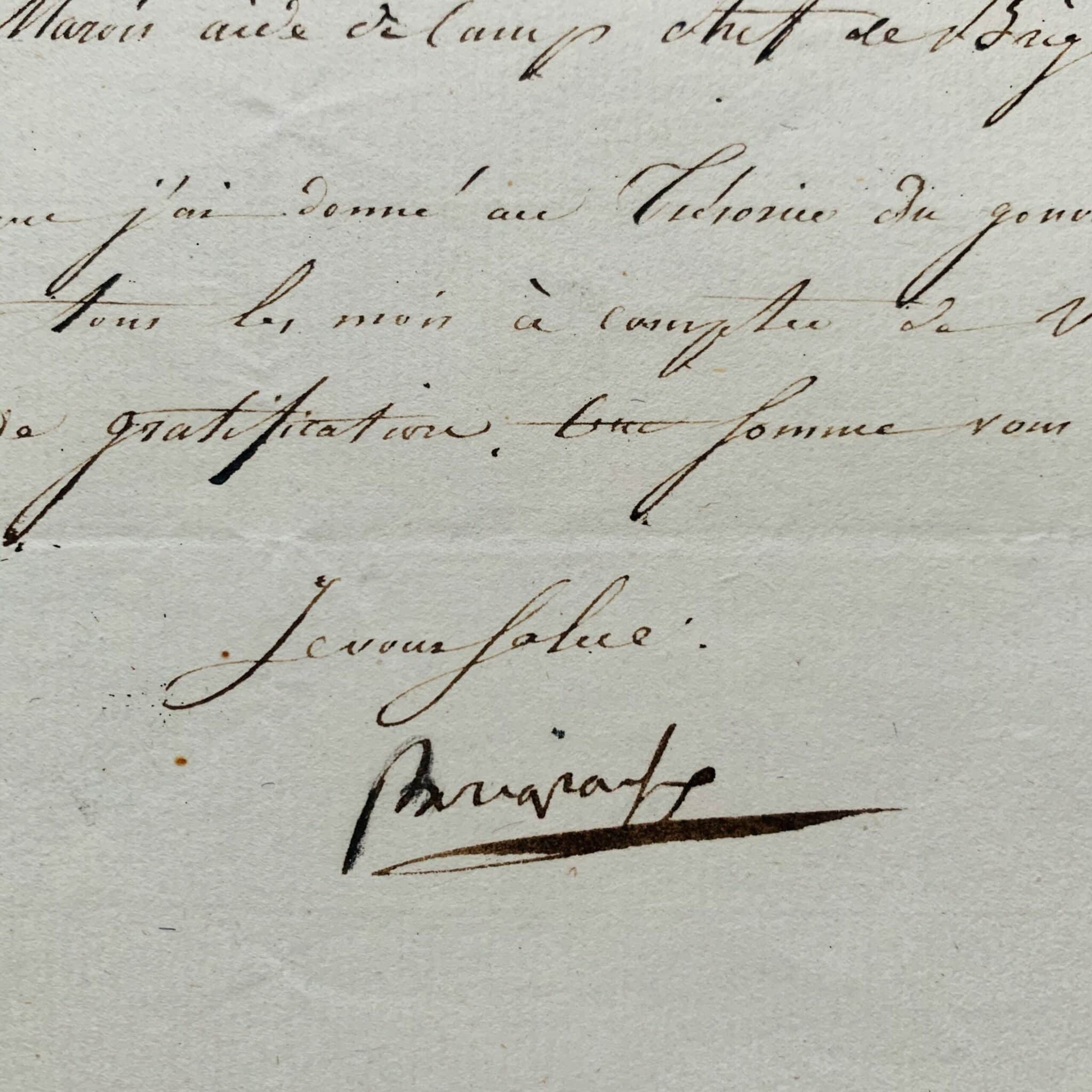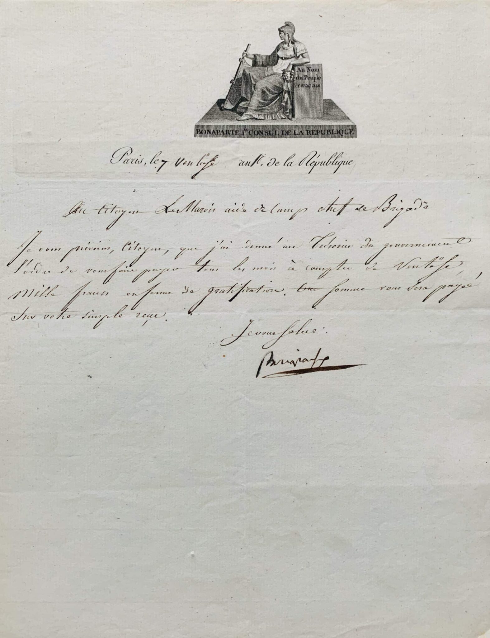 "Je vous prévis, citoyen, que j'ai donné au Trésorier du gouvernement l'ordre de vous faire payer tous les mois à compter de ventôse, mille francs en forme de gratification. Cette somme vous sera payée sur votre simple reçu".