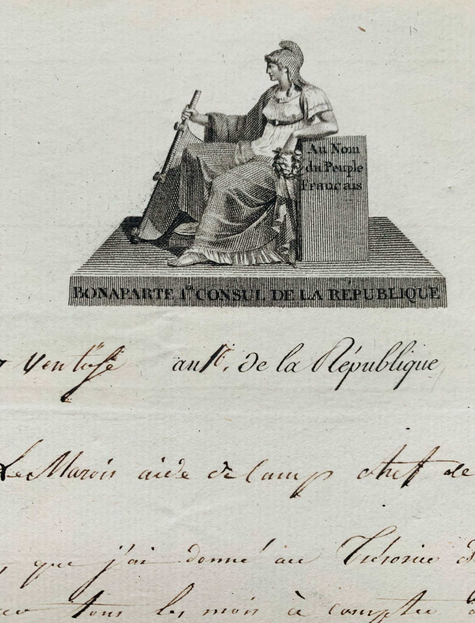 Lettre signée "Bonaparte", écrite par son secrétaire intime Bourienne, sur papier à entête orné de la vignette "Bonaparte 1er consul de la République" (Boppe et Bonnet, planche n°232, 2ème état sans le coq, page 155).