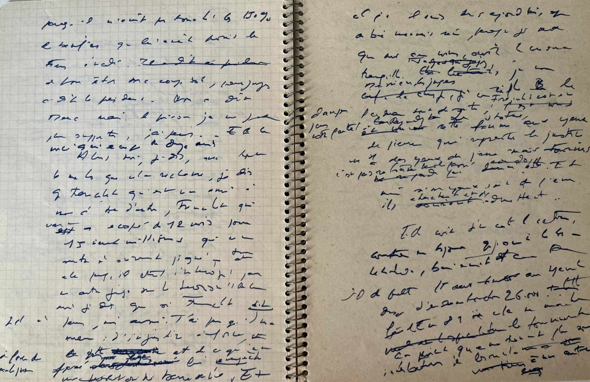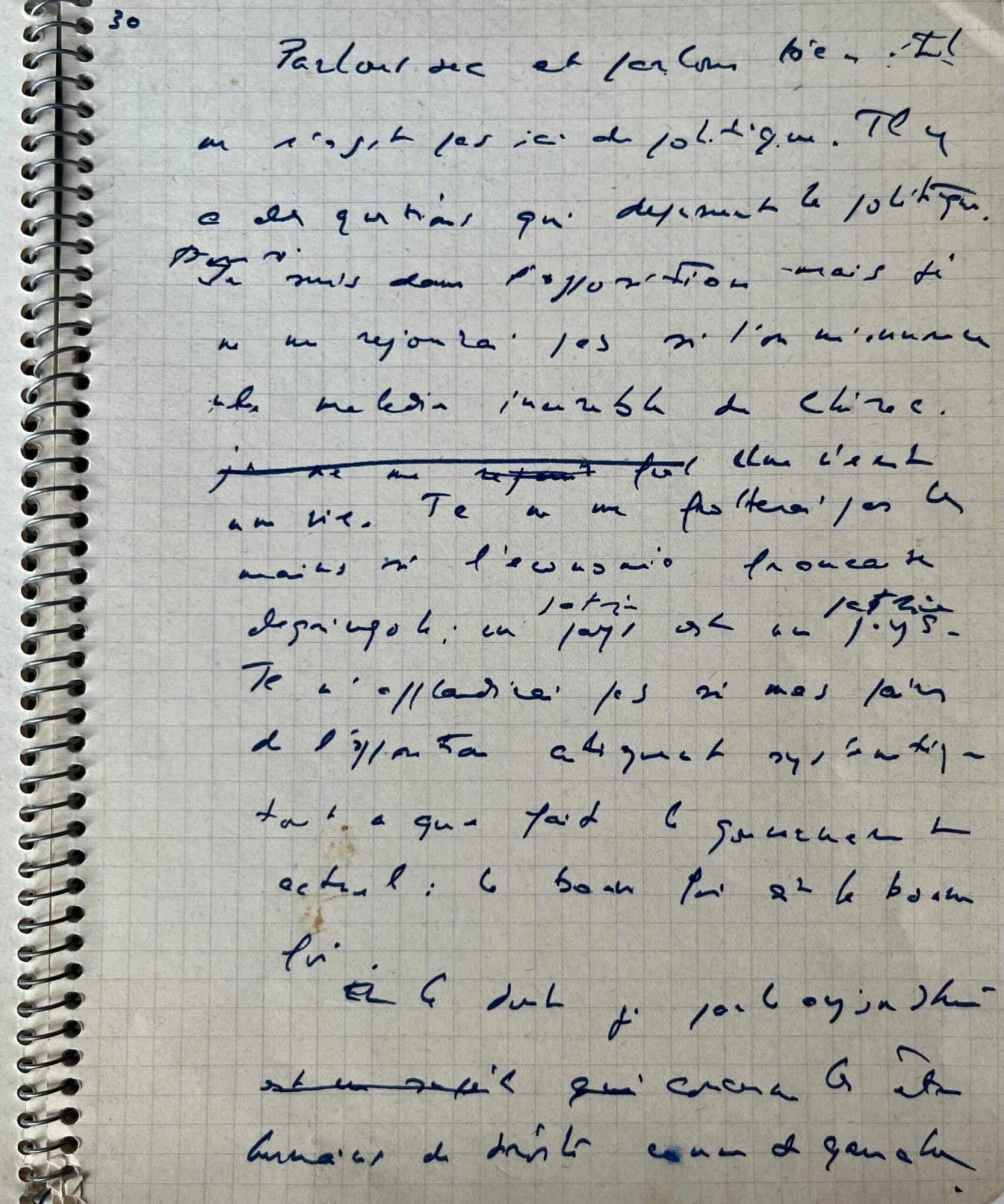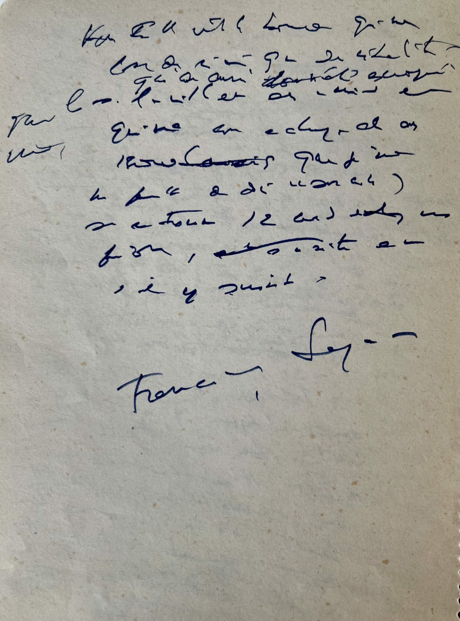 Le dernier feuillet porte cette mention : "Pour "Libération" à taper avec vérification de texte sur cassette illico, please, merci".