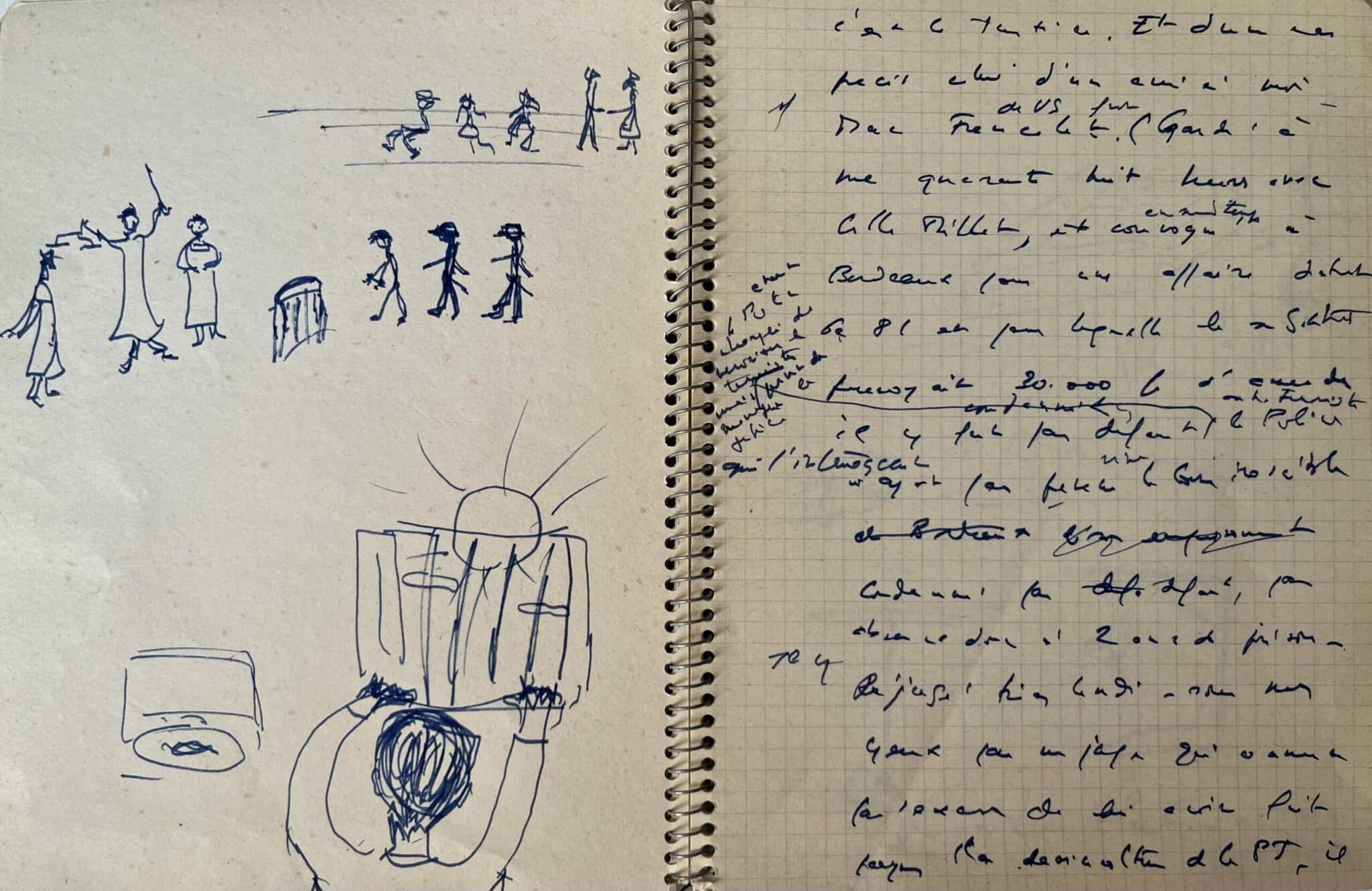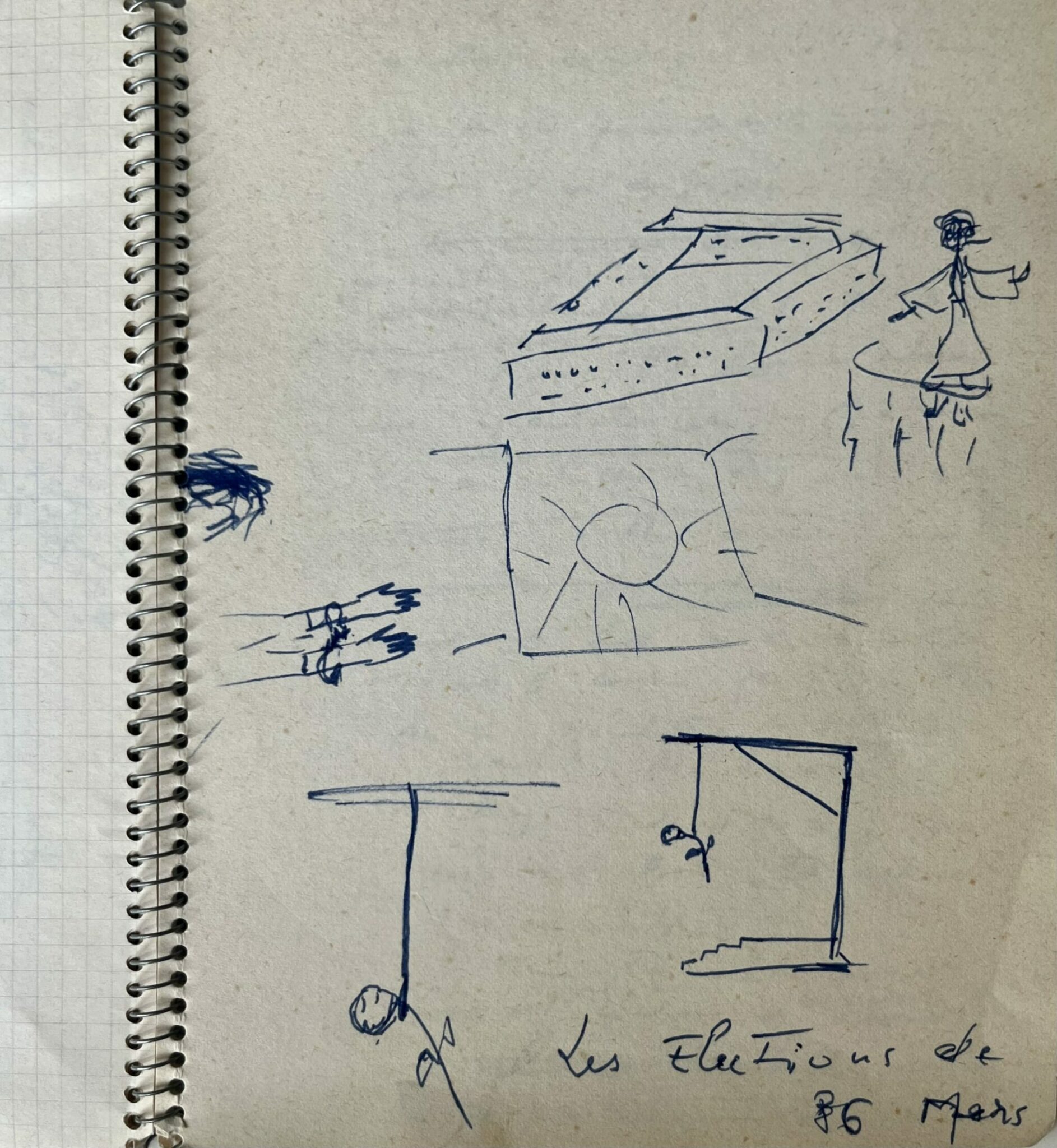 Le texte est enrichi de 2 pages de croquis, l'une titrée "Les élections de mars 86" avec une rose pendue à une potence (deux fois), des mains menottées, etc.