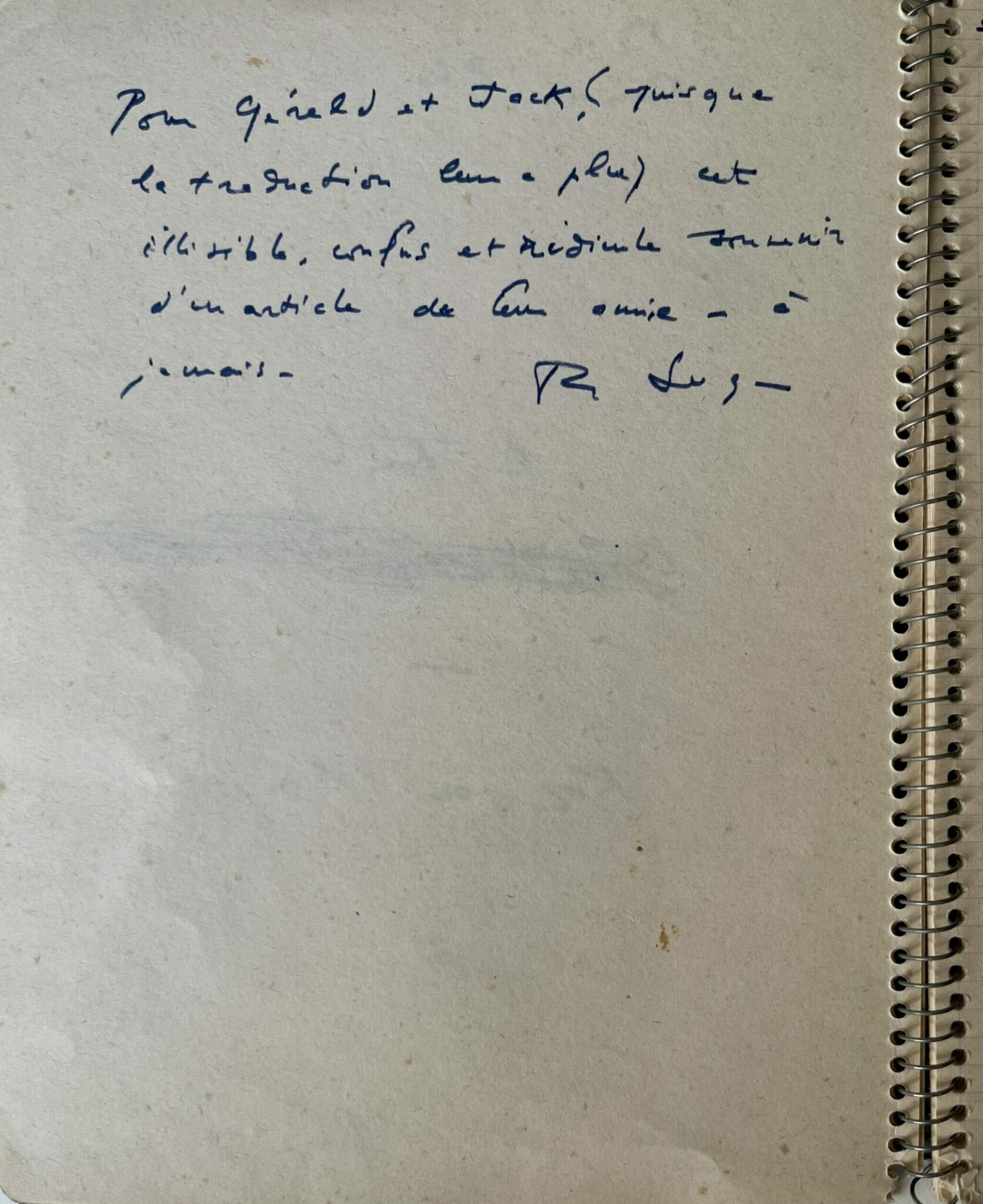 Ecrit dans un cahier à spirales, avec envoi au dos de la page de titre : "Pour Gérald [Nanty] et Jack (puisque la traduction leur a plu), cet illisible, confus et ridicule souvenir d'un article de leur amie - à jamais. Fse Sagan".