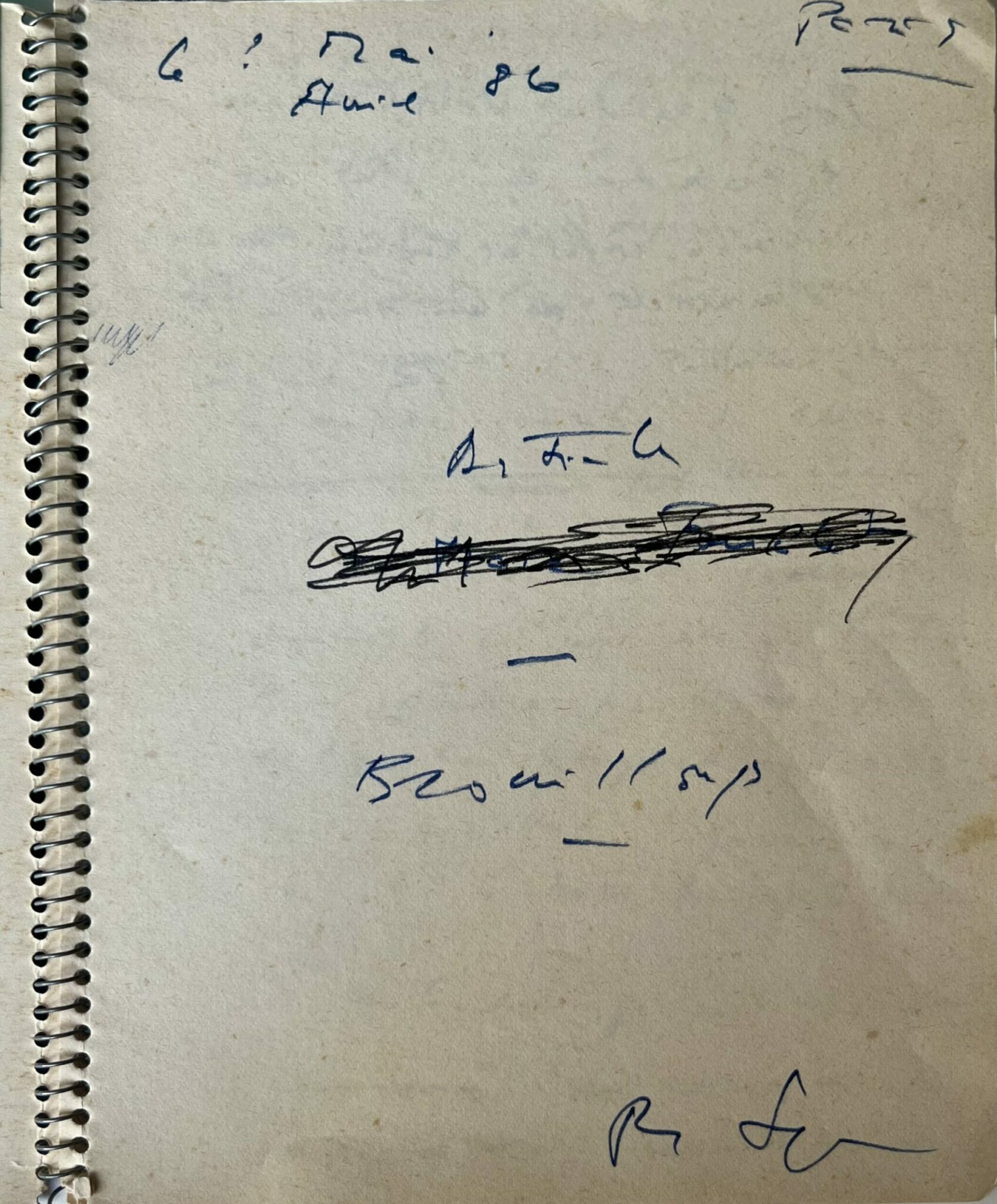 Page de titre : "Le ? Mai Avril 86 Paris - Article [Marc Francelet, biffé] - Brouillon - Fse Sg".