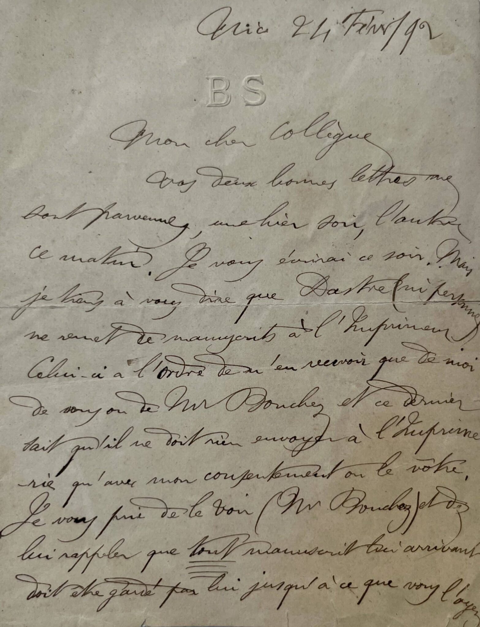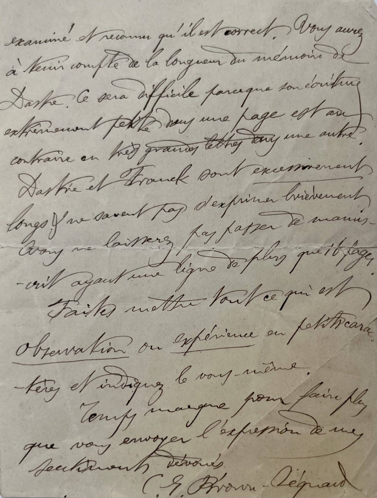 Charles Edouard Brown-Séquard (Port Louis, 1817/1894)"Vos deux bonnes lettres me sont parvenues, une hier soir, l'autre ce matin. Je vous écrirai ce soir. Mais je tiens à vous dire que Dastre (ni personne) ne remet de manuscrit à l'imprimeur. Celui-ci a l'ordre de n'en recevoir que de moi, de vous ou de Mr Bouchez et ce dernier sait qu'il ne doit rien envoyer à l'imprimerie qu'avec mon consentement ou le vôtre. Je vous prie de le voir (Mr Bouchez) et de lui rappeler que tout manuscrit lui arrivant doit être gardé par lui jusqu'à ce que vous l'ayez examiné et reconnu qu'il est correct. Vous aurez à tenir compte de la longueur du mémoire de Dastre. Ce sera difficile parce que son écriture extrêmement petite dans une page est au contraire en très grande lettres dans une autre. Dastre et Franck sont excessivement longs & ne savent pas s'exprimer brièvement. Vous ne laisserez pas passer de manuscrit ayant une ligne de plus que 16 pages. Faites mettre tout ce qui est observation ou expérience en petits caractères et indiquez le vous-même. Temps manque pour faire plus que vous envoyer l'expression de mes sentiments dévoués".