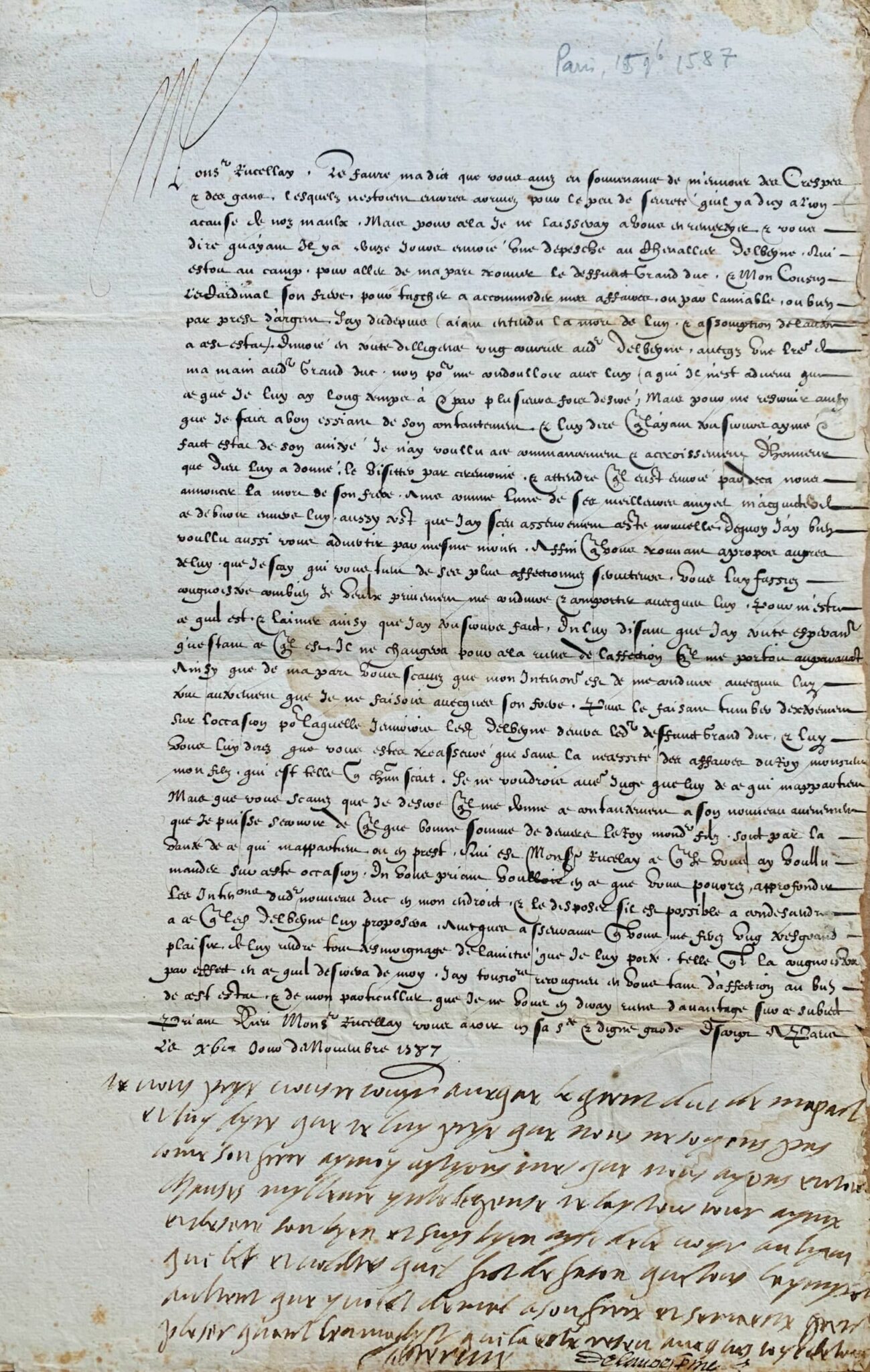 Belle et longue lettre écrite après le décès du Grand Duc de Toscane, le despotique et très impopulaire François 1er de Médicis (empoisonné le 19 octobre), à qui a succédé son frère le cardinal Ferdinand Ier (parfois soupçonné organisé l'empoisonnement) ; ce dernier fera marier sa nièce, Marie de Médicis, fille de François 1er, au roi de France Henri IV.