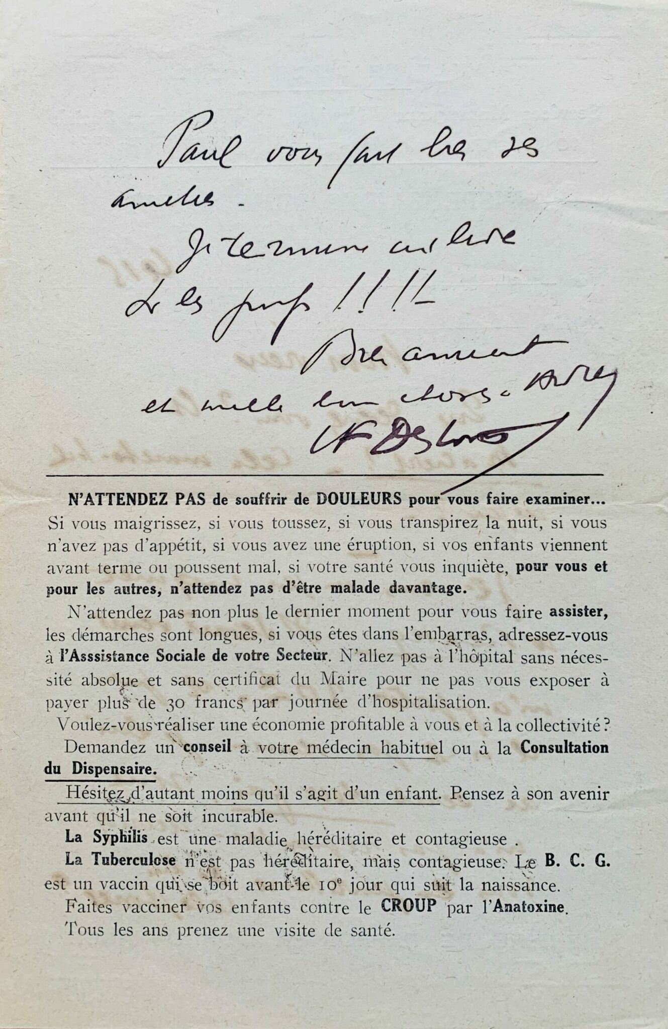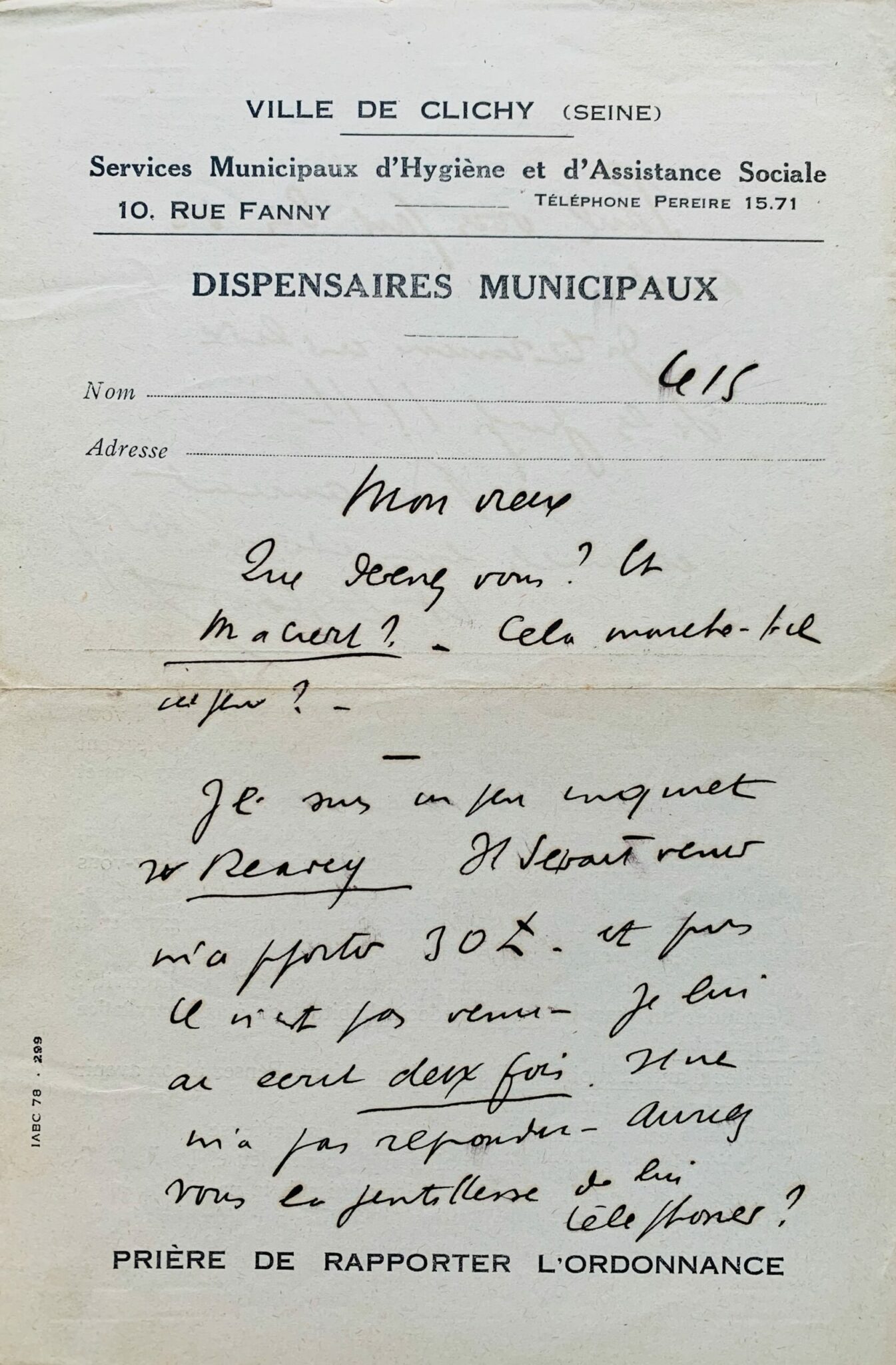 Lettre de Céline, signée "LF Destouches", écrite sur papier des dispensaires municipaux de Clichy, très vraisemblablement adressée à son éditeur Robert Denoêl. Il demande des nouvelles de la vente de Mort à Crédit (publié par Denoël le 12 mai 1936) et annonce qu'il termine "un livre sur les Juifs" [Bagatelle pour un massacre, également édité par Denoël en décembre 1937].