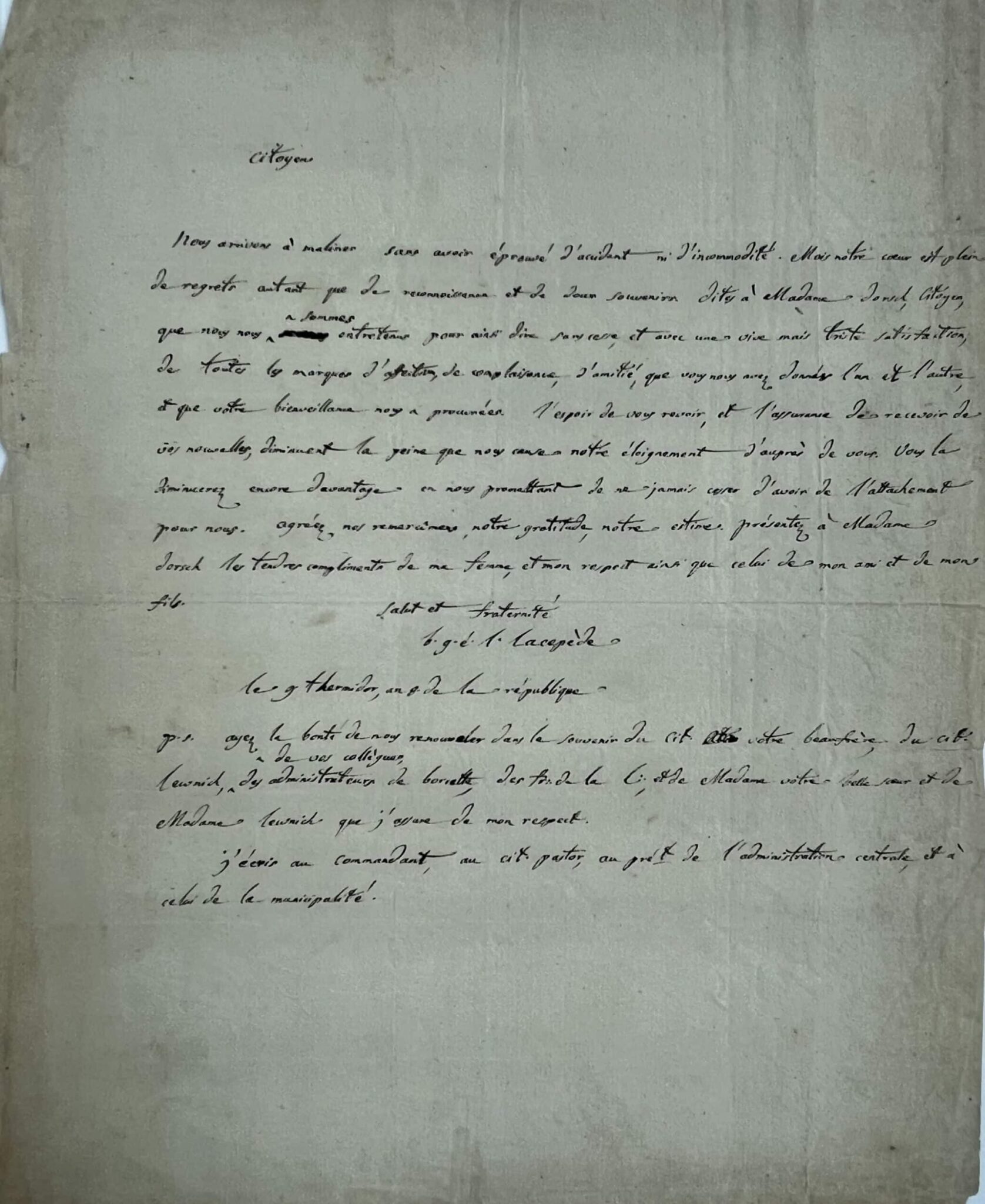 Bernard Germain Etienne Lacépède (comte de) (Agen, 1756/1825)"Citoyen. Nous arrivons à Malines sans voir éprouvé d'accident ni d'incommodité. Mais notre coeur est plein de regrets autant que de reconnaissance et de doux souvenirs. Dites à Madame Dorsel, Citoyen, que nous nous sommes entretenus pour ainsi dire sans cesse et avec une vive mais triste satisfaction, de toutes les marques d'affection, de complaisance, d'amitié, que vous nous avez données l'un et l'autre et que votre bienveillance nous a procurées. L'espoir de vous revoir, et l'assurance de recevoir de vos nouvelles diminuent la peine que nous cause notre éloignement d'auprès de vous. Vous la diminuez davantage en nous promettant de ne jamais cesser d'avoir de l'attachement pour nous. Agréez nos remerciements, notre gratitude, notre estime. Présentez à Madame Dorsel les tendres compliments de ma femme, et mon respect ainsi que celui de mon ami et de mon fils. Salut et fraternité [...]".