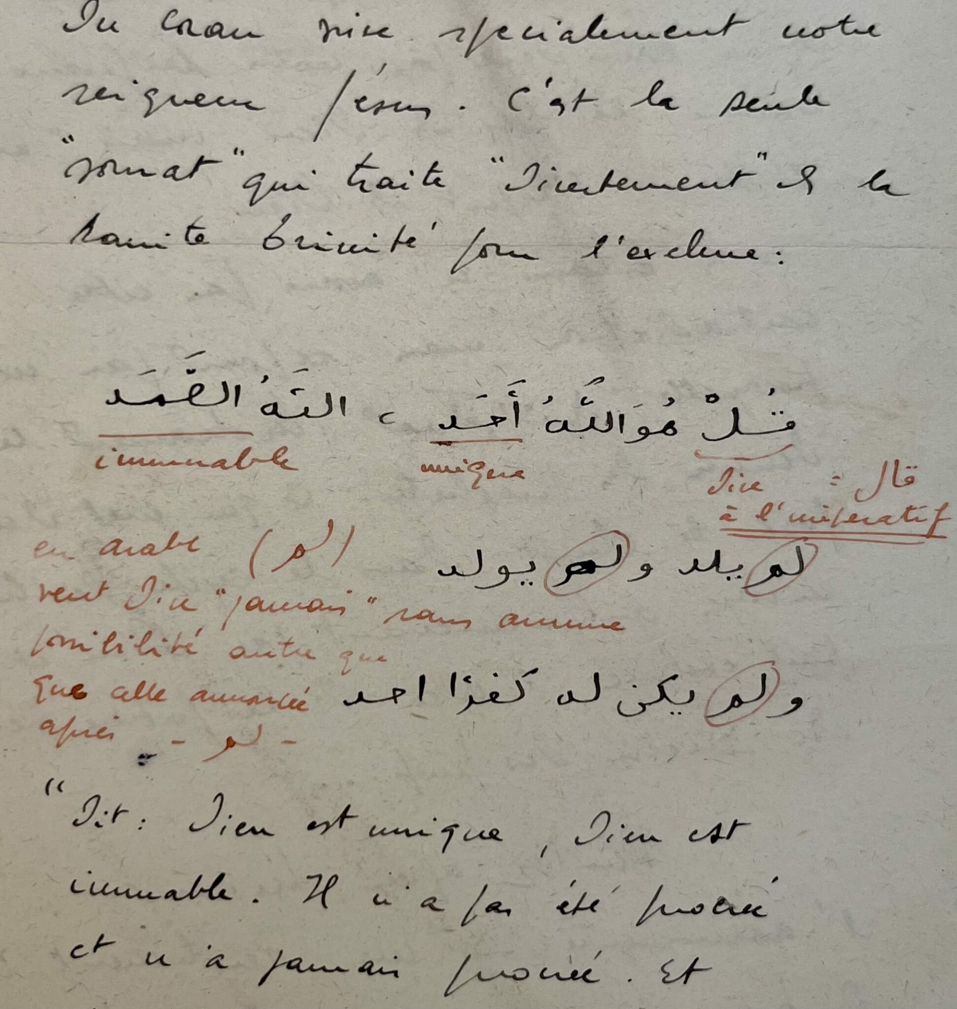 "En effet la plus petite "Sourat" du Coran vise spécialement notre Seigneur Jésus. C'est la seule "Sourat" qui traite "directement" de la Sainte Trinité pour l'exclure". Charles de Foucauld recopie en arabe cette sourate et la traduit littéralement à l'encre rouge, en l'expliquât "immuable / unique / dieu à l'impératif / en arabe [mot arabe] veut dire "jamais" sans aucune possibilité autre que celle annoncée après [mot arabe]". Il traduit : "Dit : Dieu est unique, Dieu est immuable. Il n’a pas été procréé et n’a jamais procréé. Et personne ne s’en est chargé ». Suit une longue réflexion sur l’Islam. "Comme le coran est pour tout musulman indiscutable, cette "sourat" tombe comme un couperet. C'est à mon avis, la sourate la plus importante qui fait la différence entre un musulman et spécialement l'arabe chrétien. L'Islam ne laisse pas d'alternative : tout en admettant l'existence du Christ, de la sainte Marie, il ne considère pas notre seigneur comme le fils de dieu mais [mot en langue arabe] : l'Ame, l'Esprit de Dieu. L'Islam n'avoue pas cette contradiction mais répond par cette pirouette [mot en langue arabe] : Mohamed le dernier des prophètes ; ce qui met d'une part le Christ dans le cycle des hommes envoyés antérieurement par Dieu et d'autre part exclut l'idée de la future venue du Messie des Juifs...".
