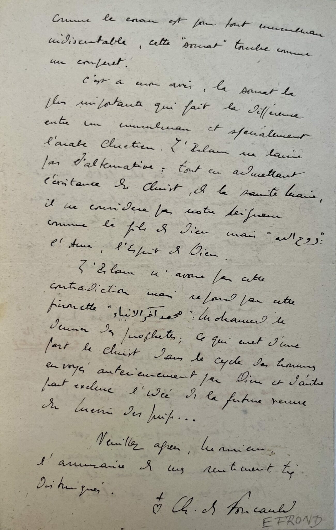 Charles de Foucauld (Strasbourg, 1858/1916)Intéressante lettre de Charles de Foucauld sur une sourate et les contradictions de l'Islam sur le Christ :