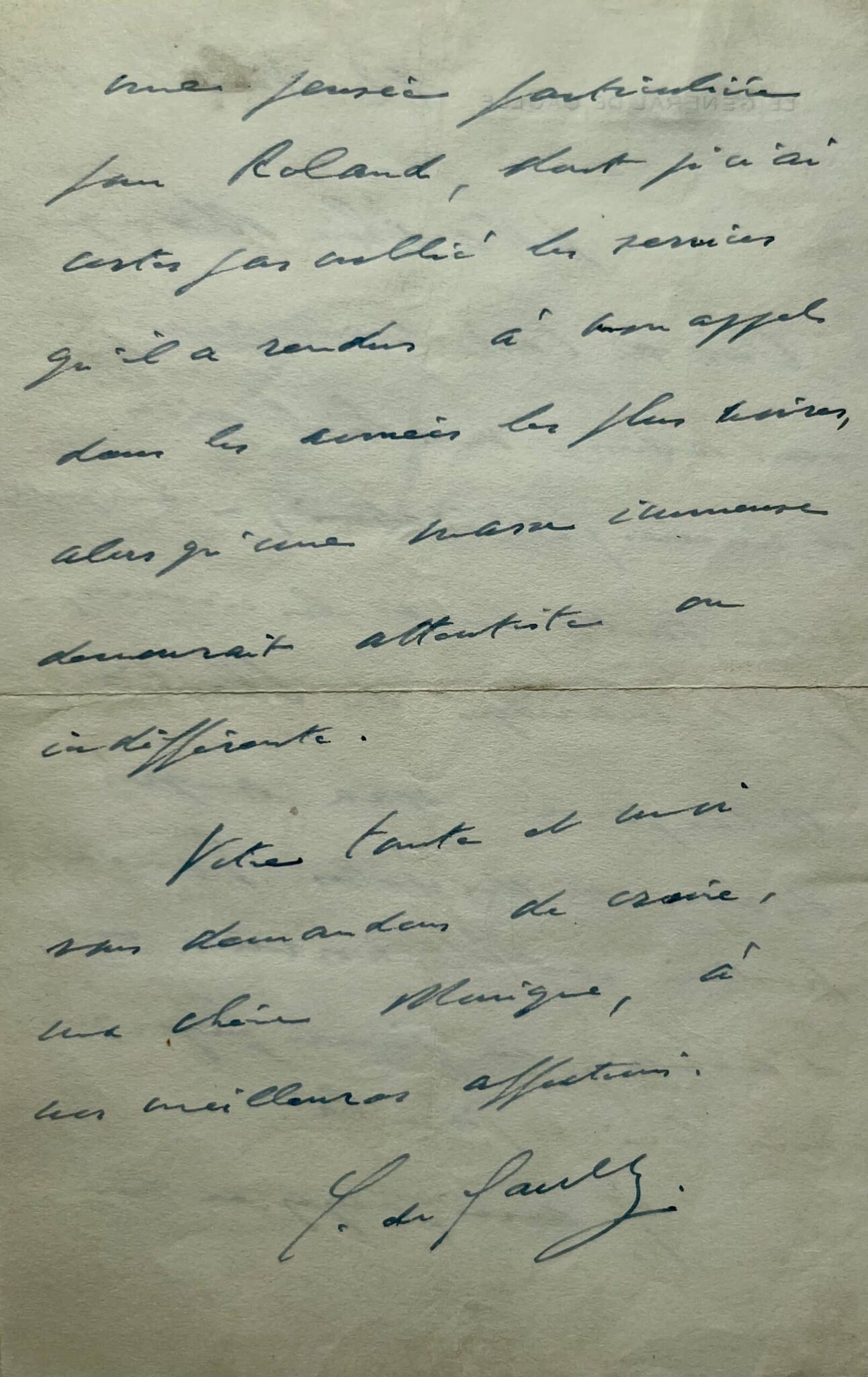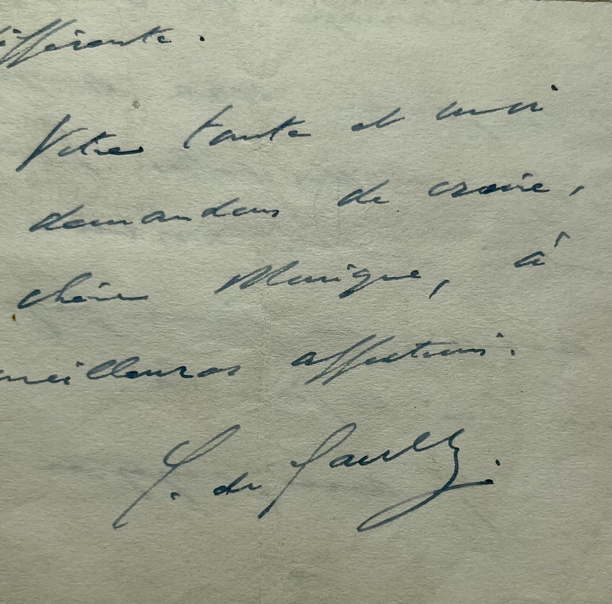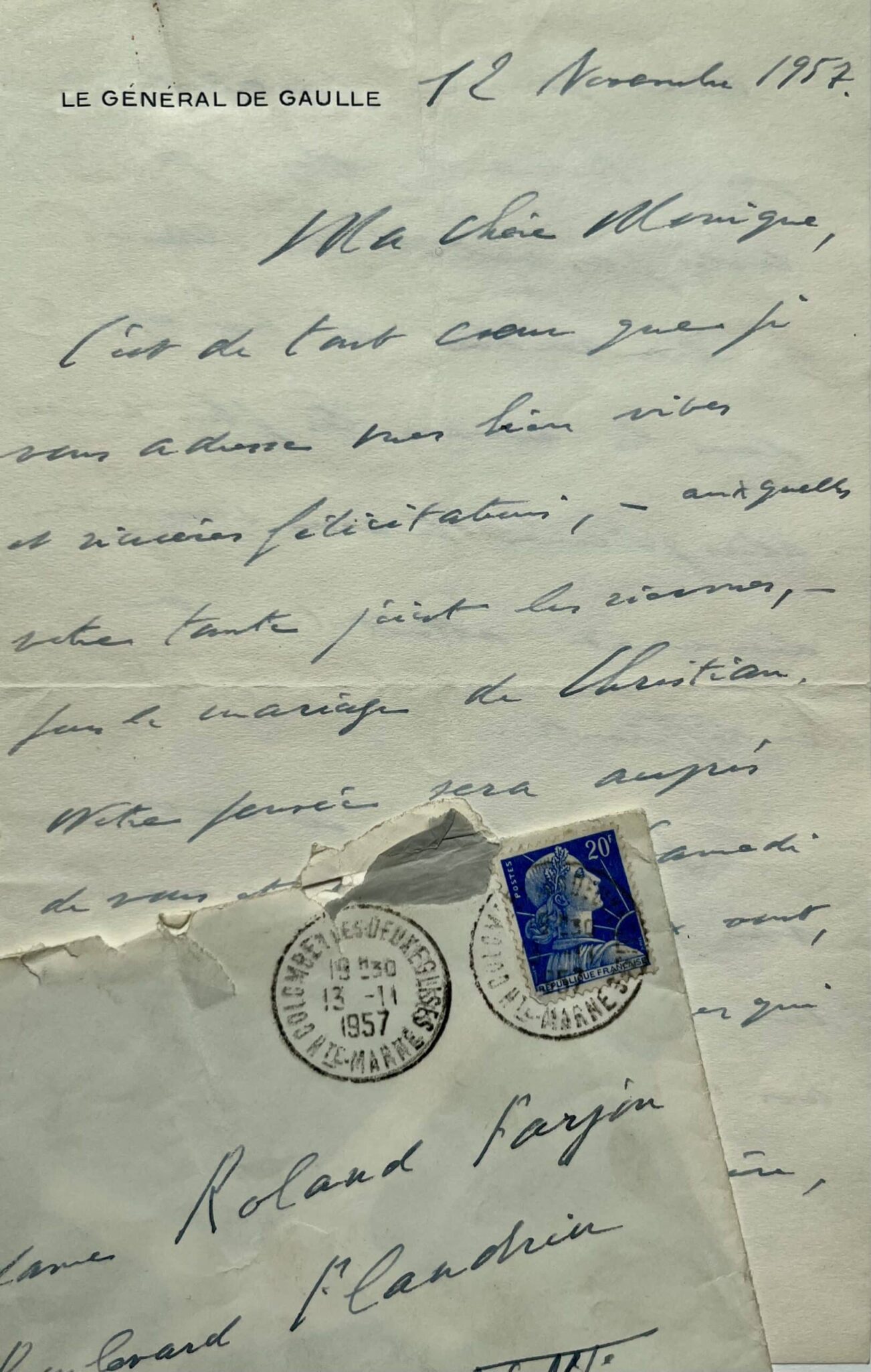 Votre tante et moi vous demandons de croire, ma chère Monique, à nos meilleures affections. C. de Gaulle".