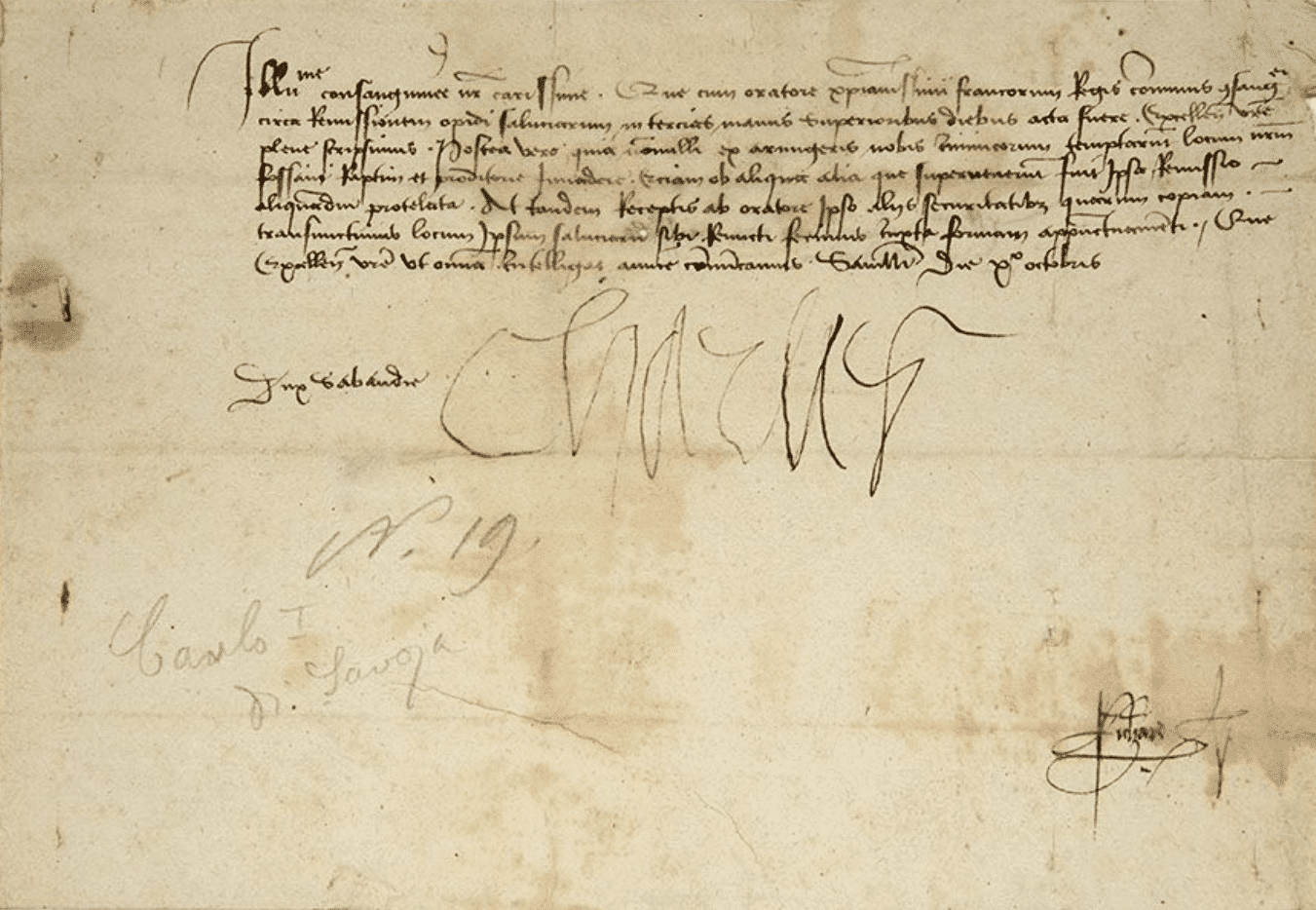 Charles Ier de Savoie (Carignan, 1468/1490)Charles Ier de Savoie annonce au duc de Milan que le Roi de France "très-chrétien" vient de lui remettre la forteresse de Saluces. En latin.