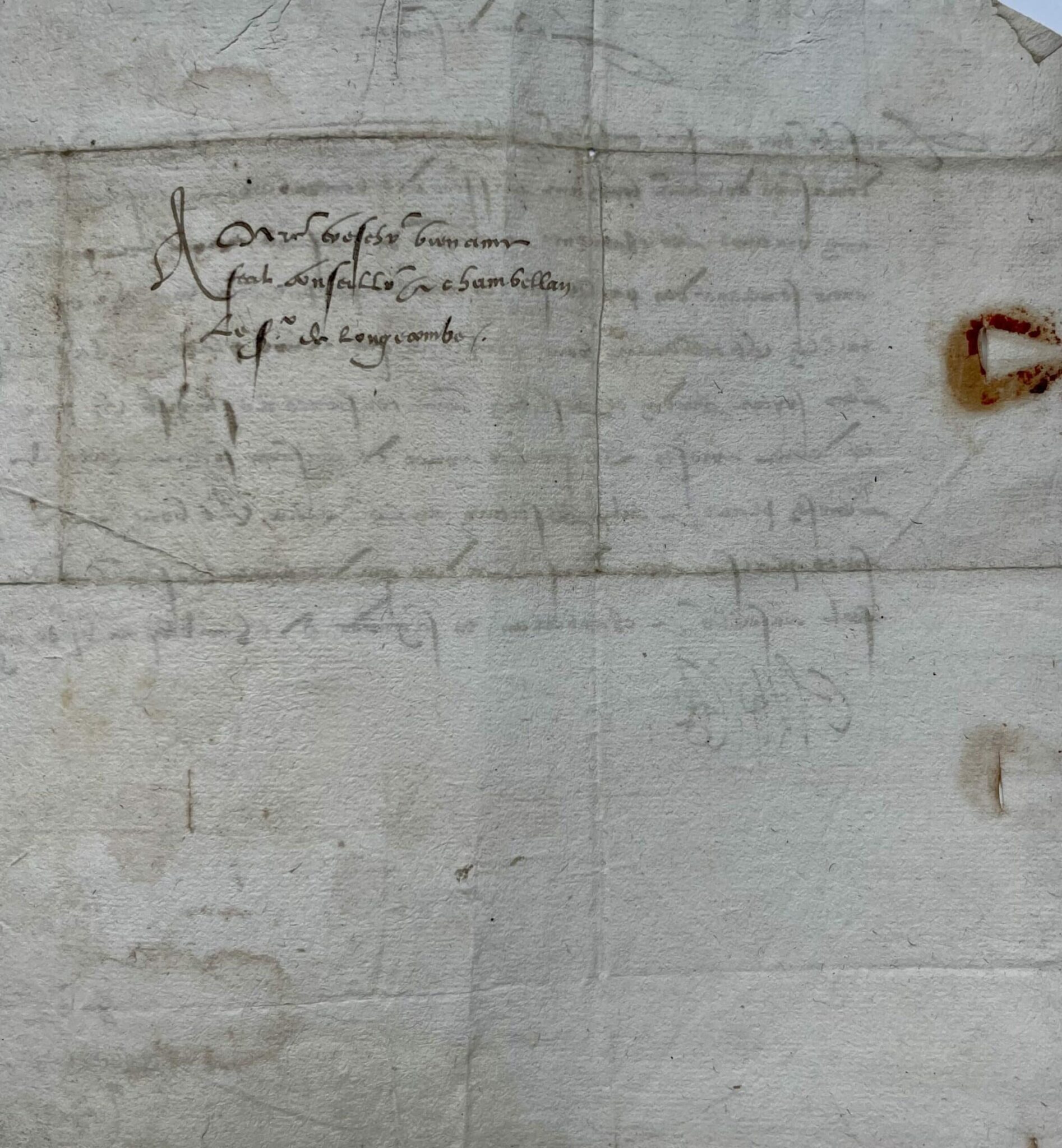 Au verso, adresse : "A nostre très cher bien aimé féal conseiller & chambellan me Str de Longecombe".