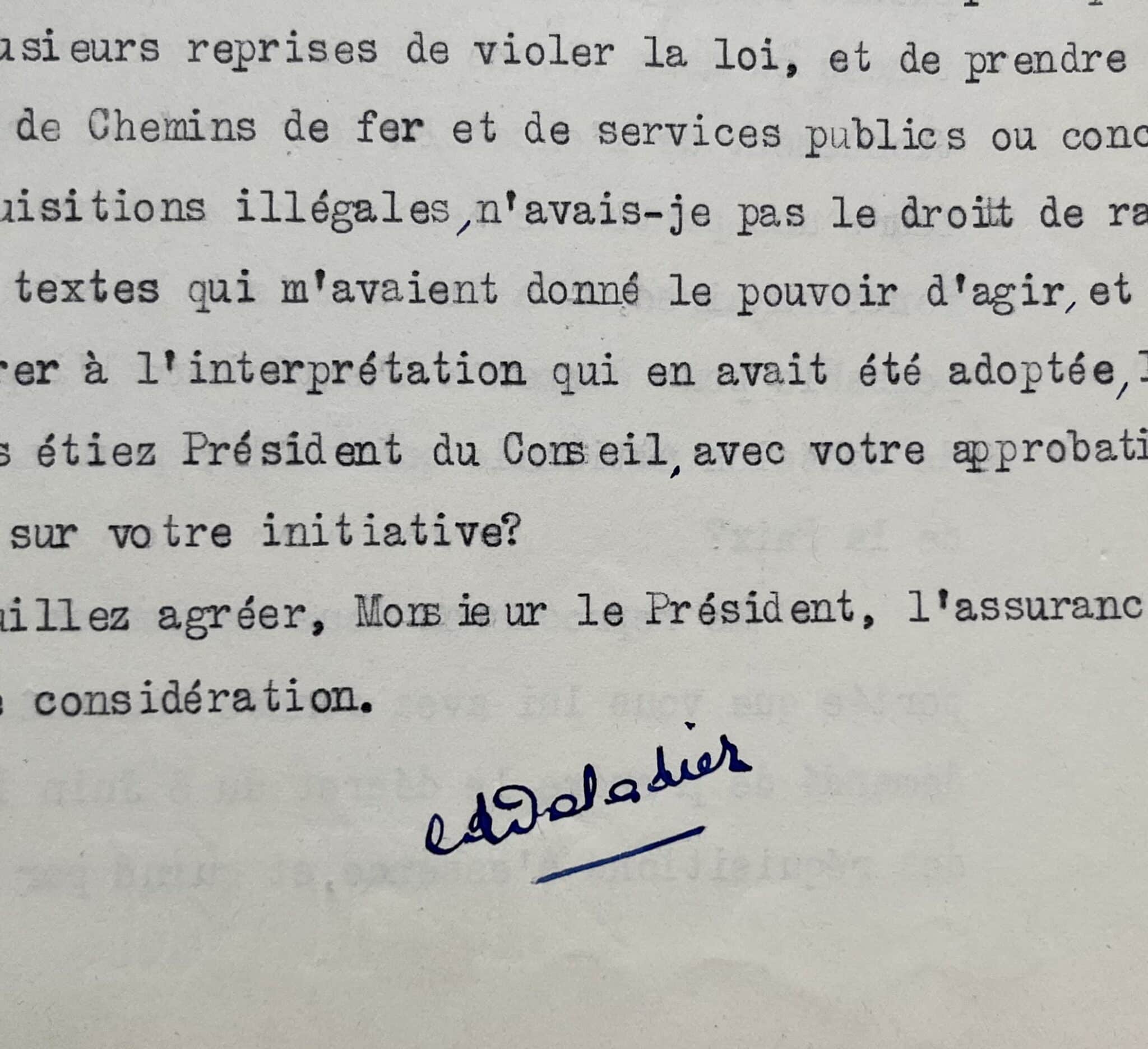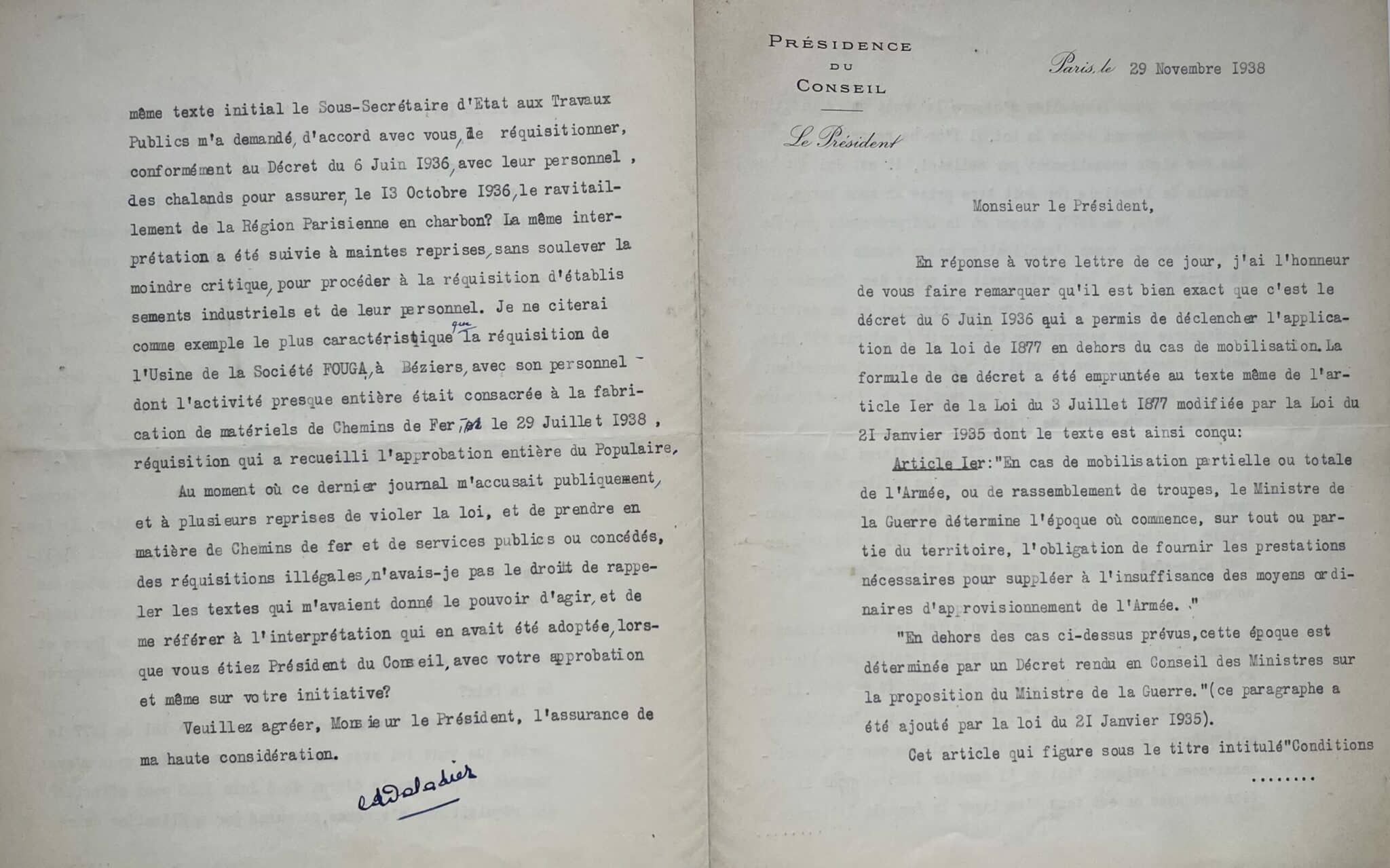 Daladier, dans un premier temps, rappelle et détaille l’esprit et la portée des décrets qu’il a pris, puis répond avec véhémence : "[...] Me reprocherez-vous de donner à la Loi de 1877 la portée que vous lui avez donnée vous-même quand vous m’avez demandé de prendre le décret du 6 juin 1936 pour effectuer des réquisitions d’essence, et quand par application de ce même texte initial le sous-secrétaire d’État aux Travaux Publics m’a demandé, d’accord avec vous, de réquisitionner, conformément au Décret du 6 juin 1936, avec leur personnel, des chalands pour assurer, le 13 octobre 1936, le ravitaillement de la Région Parisienne en charbon ? La même intervention a été suivie à maintes reprises, sans soulever la moindre critique, pour procéder à la réquisition d’établissements industriels et leur personnel. Je ne citerai comme exemple le plus caractéristique que la réquisition de l’Usine de la Société FOUGA, à Béziers, avec son personnel dont l’activité presque entière était consacrée à la fabrication de matériels de Chemins de Fer, le 29 juillet 1938, réquisition qui a recueilli l’approbation entière du Populaire. Au moment où ce dernier journal m’accusait publiquement, à plusieurs reprises de violer la loi, et de prendre en matière de Chemins de fer et de services publics ou concédés, des réquisitions illégales, n’avais-je pas le droit de rappeler les textes qui m’avaient donné le pouvoir d’agir, et de me référer à l’interprétation qui en avait été adoptée, lorsque vous étiez Président du Conseil, avec votre approbation et même sur votre initiative ? [...]".