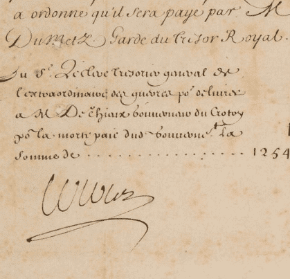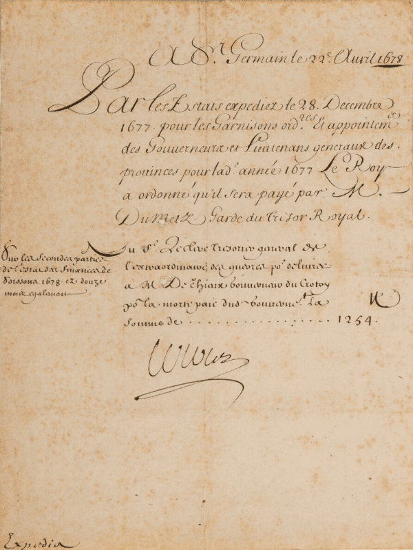 Ordre donné par Colbert au Garde du Trésor Royal (Du Metz) de délivrer au trésorier général de l'extraordinaire des guerres (Leclerc), la somme de 1254 livres, afin qu'il rémunère le sieur De Thieux "gouverneur du Crotoy pour la morte paie dudit gouverneur", pour ses services pour l'année 1677.