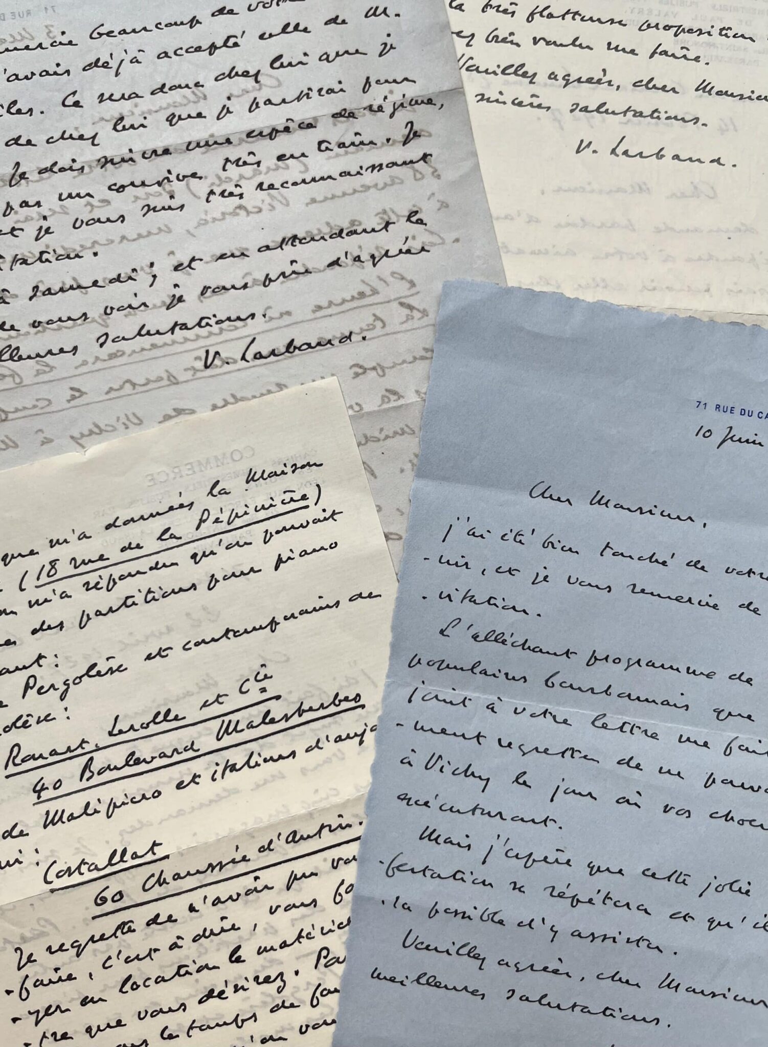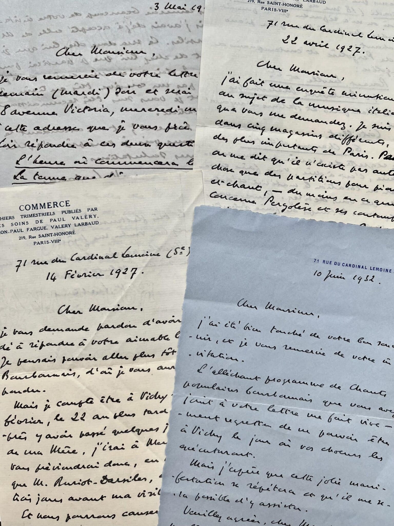 Ensemble de 4 lettres de Valéry Larbaud, adressées à un musicien ou plus probablement un amateur bourbonnais de musique [peut-être Paul Duchon (Cusset 1867-1950), auteur de Chants populaires du Bourbonnais (1926)].