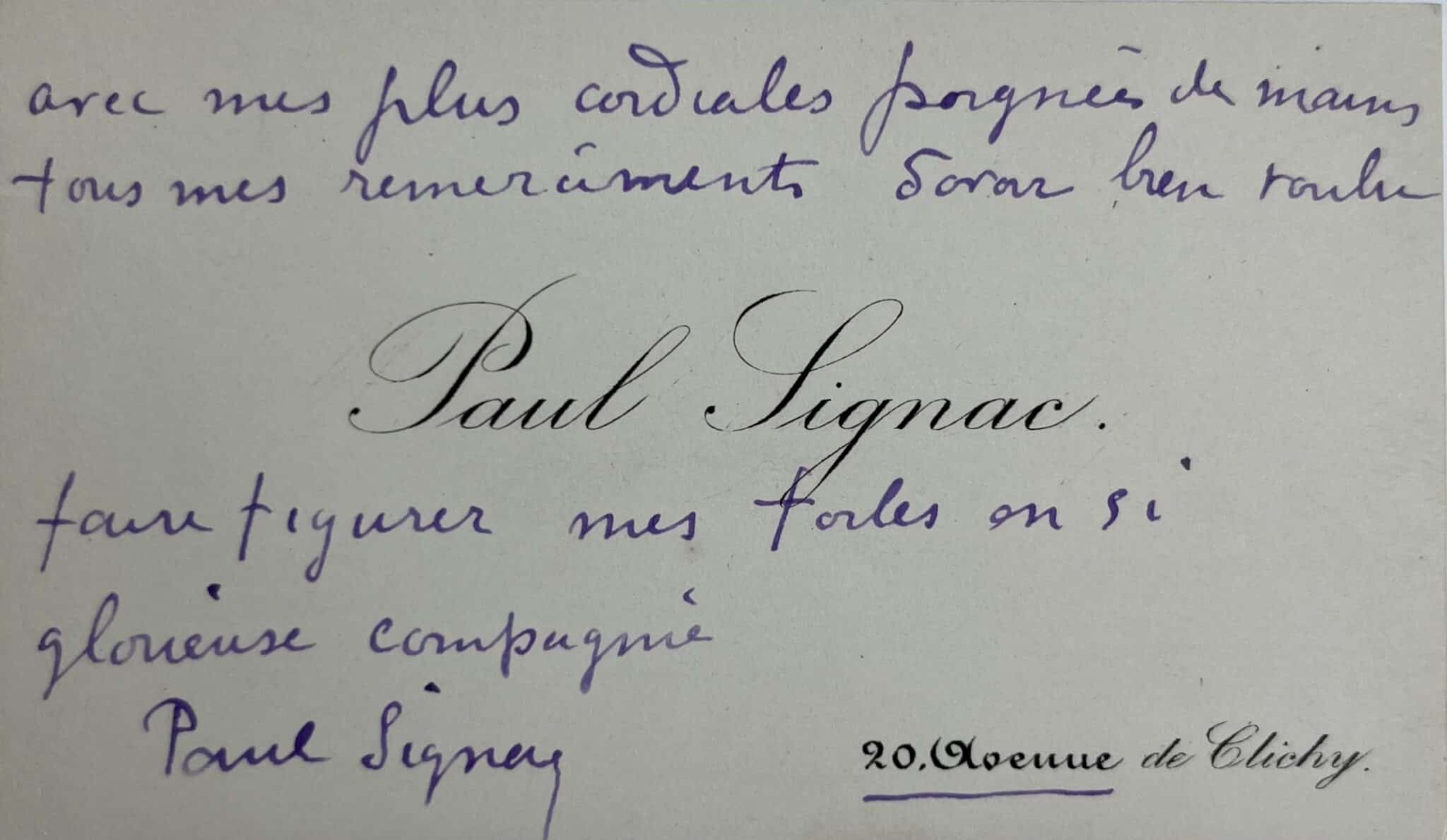 Sur sa carte de visite, Paul Signac, a écrit ces quelques mots : "Avec mes plus cordiales poignées de mains, tous mes remerciements d'avoir bien voulu faire figurer mes toiles en si glorieuse compagnie. Paul Signac".