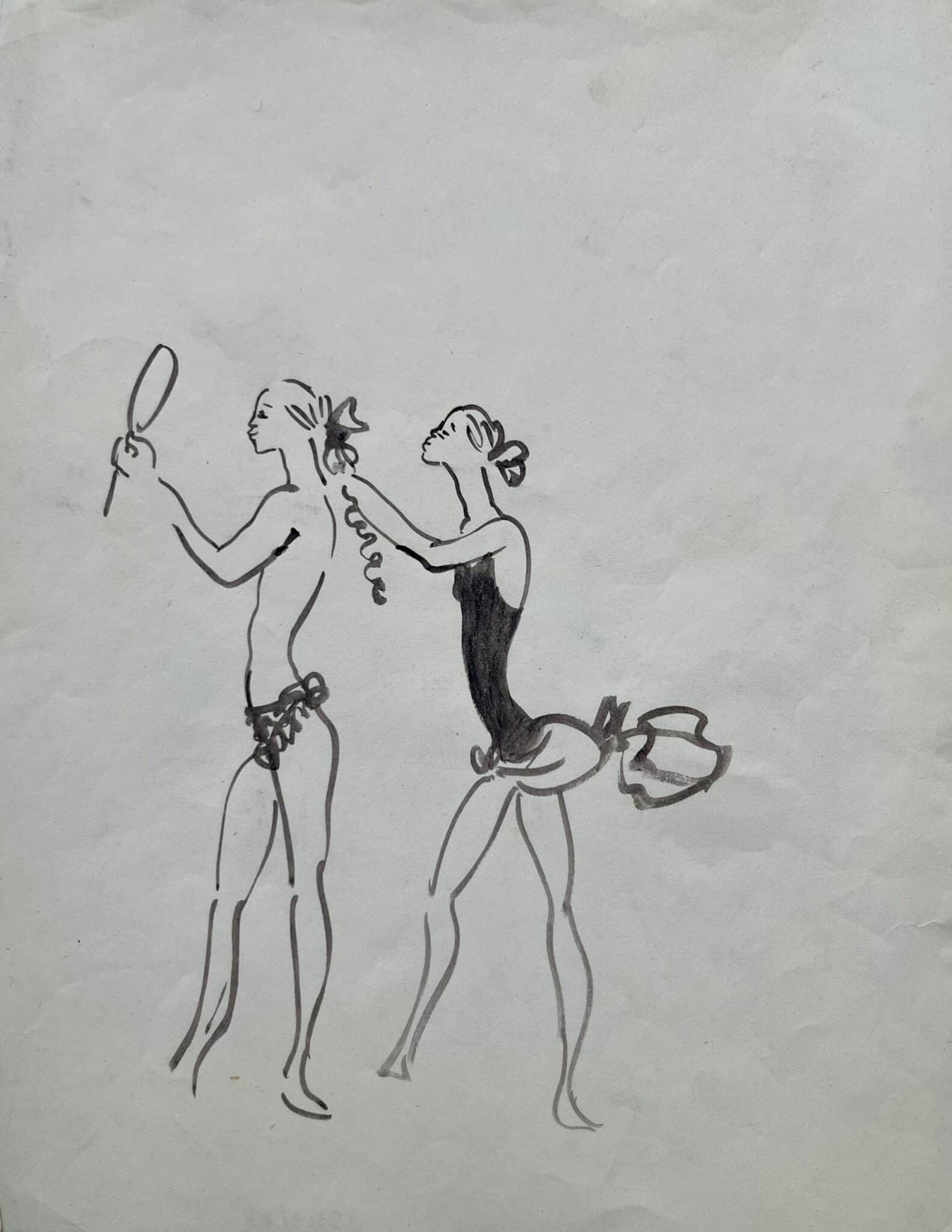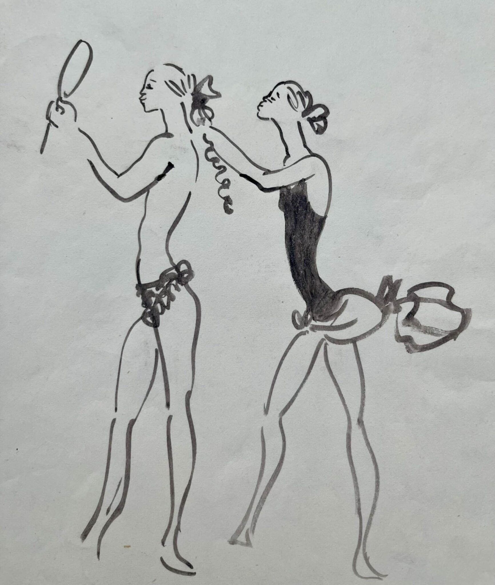 Dessin à l’encre d’Yves Saint-Laurent figurant deux ballerines en costume de scène